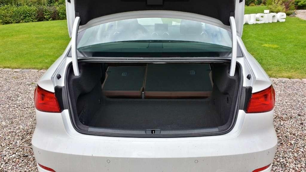 Bagażnik małej limuzyny Audi jest w stanie pomieścić 425 litrów bagażu. Gdyby okazało się, że mamy odrobinę więcej pakunków, to po złożeniu oparć tylnych siedzeń dysponujemy już objętością 880 litrów i tylko „prawie” płaską podłogą.