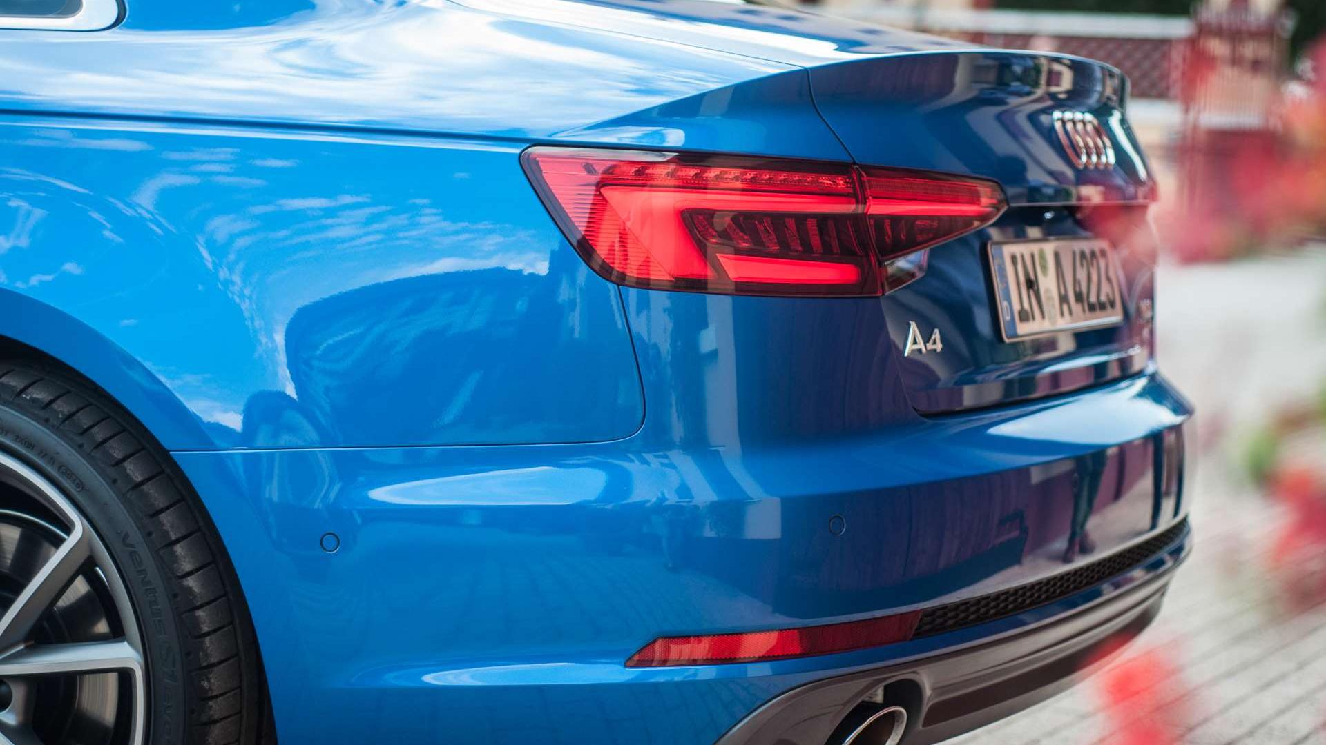 Mimo dynamicznych, ostrych linii, bryła nadwozia jest bardzo stonowana. Maska zachodzi na boki, grill to wyciągnięty sześciokąt, z kolei sportowego sznytu dodają wloty w przednim zderzaku. Ciekawy zabieg wykonano z użyciem świateł LED do jazdy dziennej, bo ich kształt wskazuje na przetłoczenie, które biegnie wzdłuż całego boku. Bryła auta jest z pewnością klasyczna. Niektórzy może z zasady zarzucą Audi nudę, ale nie przesadzajmy. Nowe Audi A4 wpada w oko.