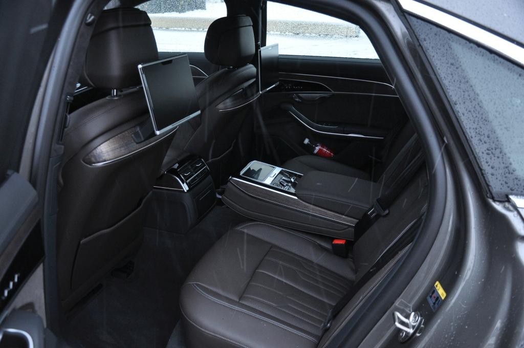 Audi A8 to luksusowa limuzyna, więc z tyłu nie może być gorzej niż z przodu. Regulacja foteli, sterowanie klimatem, roletami za pomocą mini-tabletu oraz ekrany multimedialne, będące w rzeczywistości wyjmowanymi tabletami powodują, że trudno narzekać na ilość dostępnych funkcji, ale można ponarzekać na ilość miejsca. Ta kuriozalna sytuacja występuje, gdy wysoki pasażer z przodu się „rozłoży” – wtedy wsiadanie na tylne siedzenia utrudniają ekrany wystające z zagłówków wyjątkowo grubych oparć foteli. Dlatego dla prezesów, zwłaszcza tych oczekujących możliwości wypoczynku w aucie, przewidziano o 13 cm dłuższą wersję L. W niej opcjonalnie oferowany jest fotel relaksacyjny, co – w połączeniu z możliwością odchylenia oparcia przedniego prawego fotela do przodu – daje VIP-owi dużą przestrzeń do pracy lub relaksu.