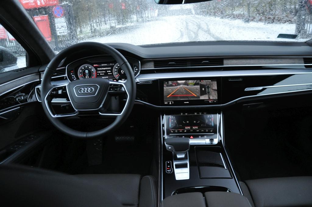 Także wnętrze na pierwszy rzut oka może wydawać się zachowawcze, ale wcale takie nie jest. Elektroniczny zestaw wskaźników – znany już z innych modeli marki – jest w A8 oczywisty, nowością jest za to rezygnacja z fizycznych przycisków na konsoli środkowej. O ile u rodzimej konkurencji sterowanie klimatyzacją odbywa się wciąż za pomocą tradycyjnych paneli z szeregiem przycisków, Audi postawiło na zastąpienie ich sporej wielkości ekranem. Wraz z drugim, umieszczonym nad nim ekranem do obsługi multimediów i nawigacji tworzą nowoczesne centrum sterowania. Tu warto wspomnieć Teslę S, która ma jeden o wiele większy ekran centralny, ale rozwiązanie Audi wydaje się bardziej praktyczne i znacznie bardziej estetyczne. Dwa ekrany o wiele lepiej się komponują na desce rozdzielczej, a np. mapę nawigacji można sobie wyświetlić bezpośrednio na tablicy wskaźników, co jest o wiele lepszym rozwiązaniem.
