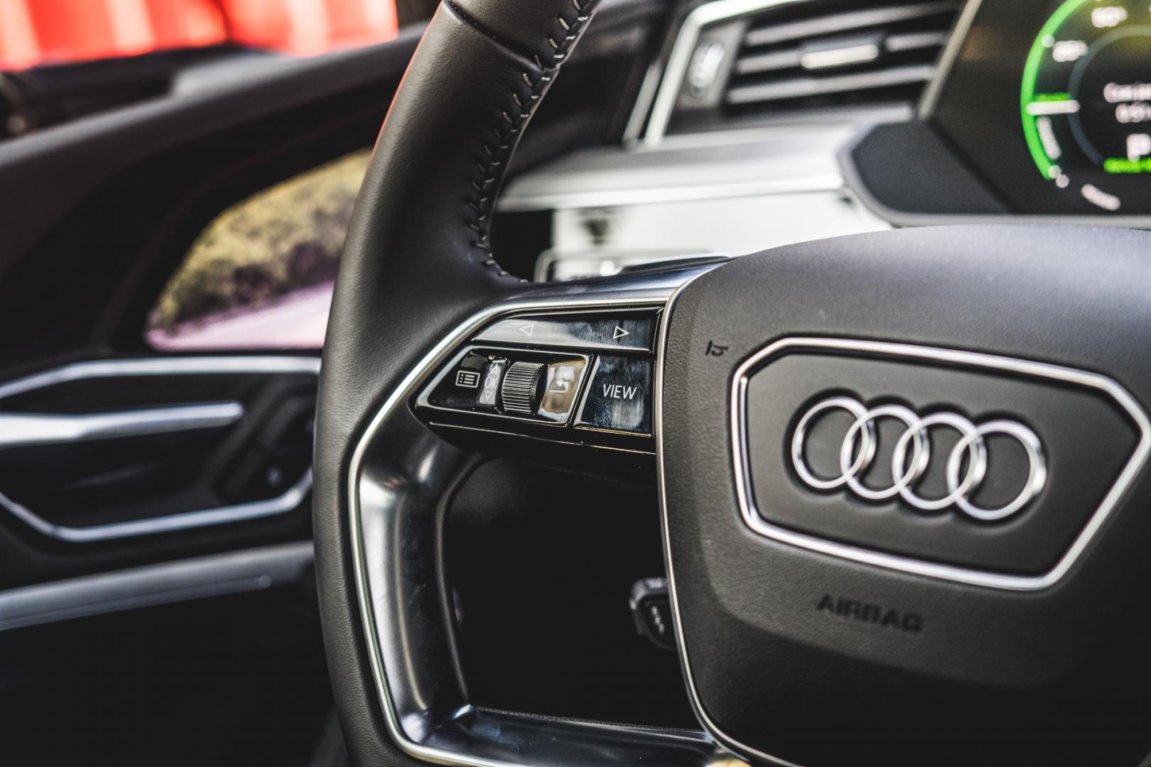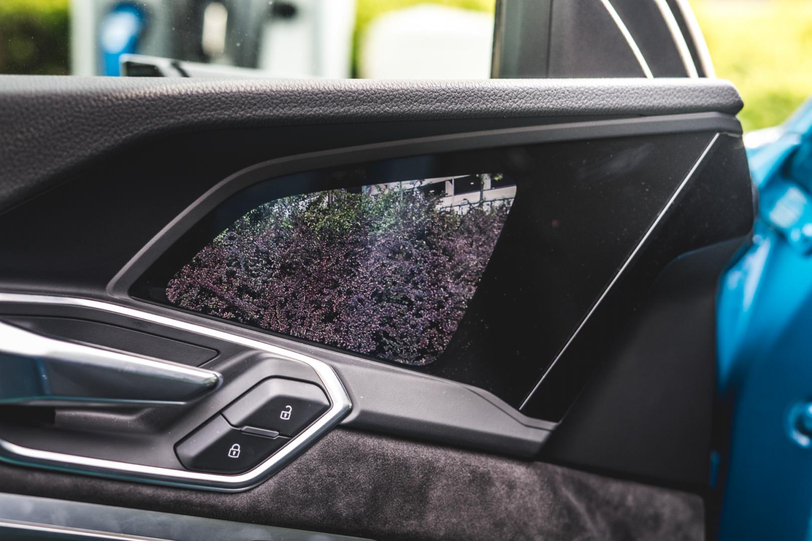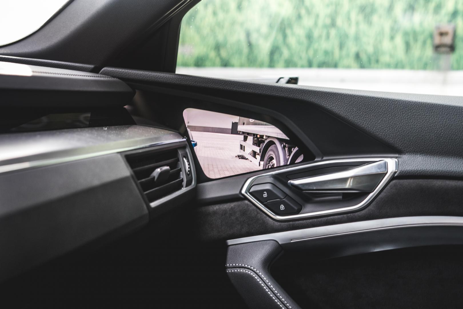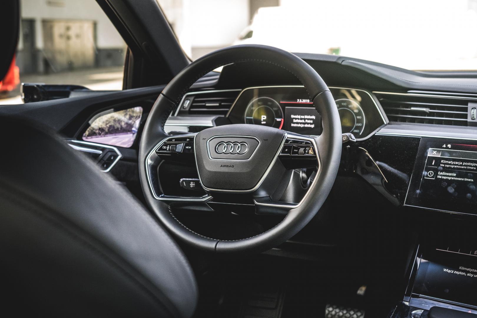 Jak wiemy, w samochodach elektrycznych trzeba walczyć o każdy element, który może poprawić aerodynamikę – a tym samym zwiększyć zasięg. I tak cała podłoga e-trona jest zabudowana i płaska, pneumatyczne zawieszenie obniża się i podwyższa w zależności od prędkości, znowu redukując opór powietrza, ale oczywiście na pierwszym planie są tu wirtualne lusterka.
