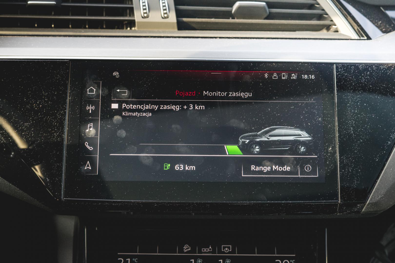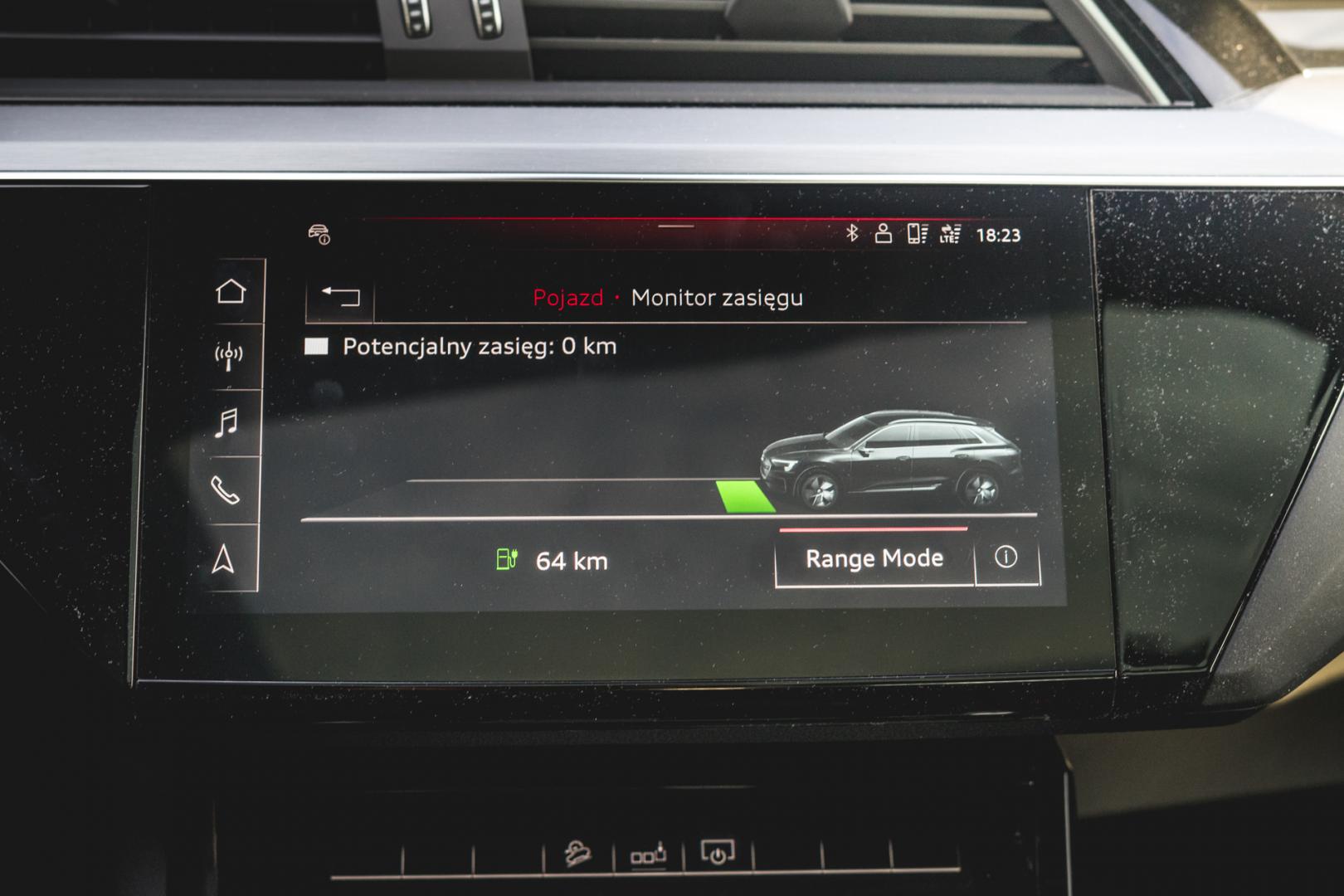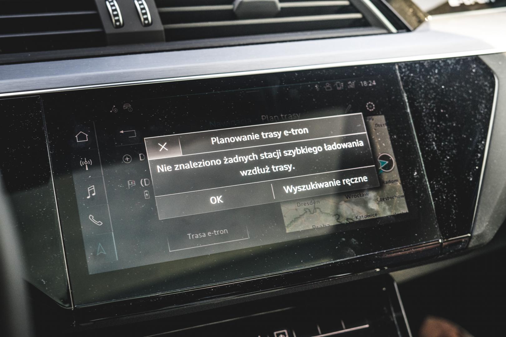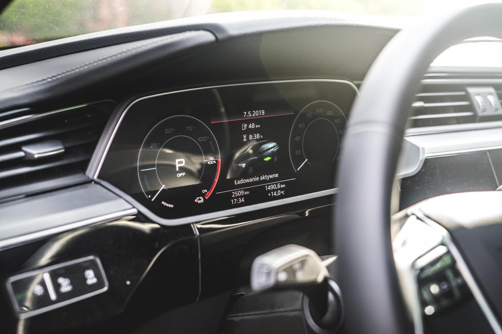 Czym jeszcze różni się wyposażenie e-trona od pozostałych SUV-ów Audi? Znowu niuansami. Na przykład aktywny tempomat na bieżąco analizuje trasę, ukształtowanie terenu i obserwuje otaczające nas samochody, by podczas jazdy odzyskiwać jak najwięcej energii. Nawigacja może obliczać długość trasy z uwzględnieniem czasu ładowania – i nawet wie, jak szybko na danej stacji można się ładować i ile zajmie to ładowanie na tej konkretnej stacji. Niestety, wybrałem trasę z Krakowa do Berlina i usłyszałem, że nie naładuję się nigdzie.
