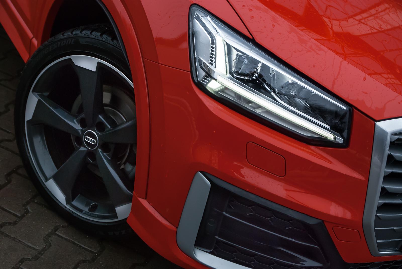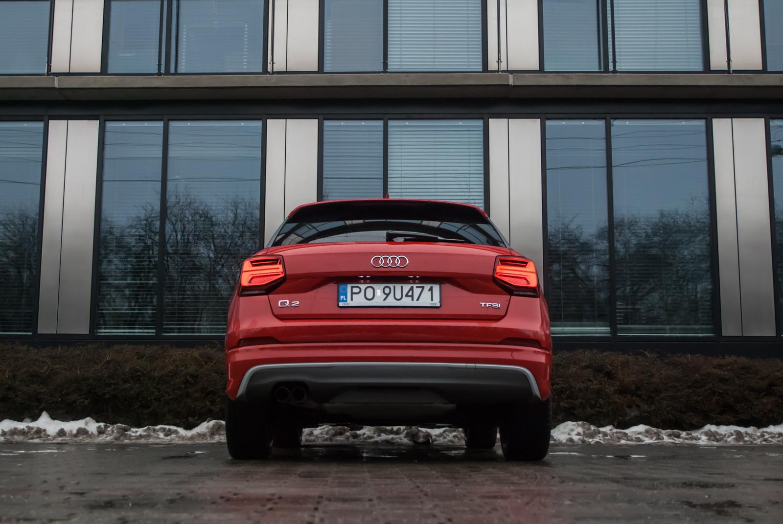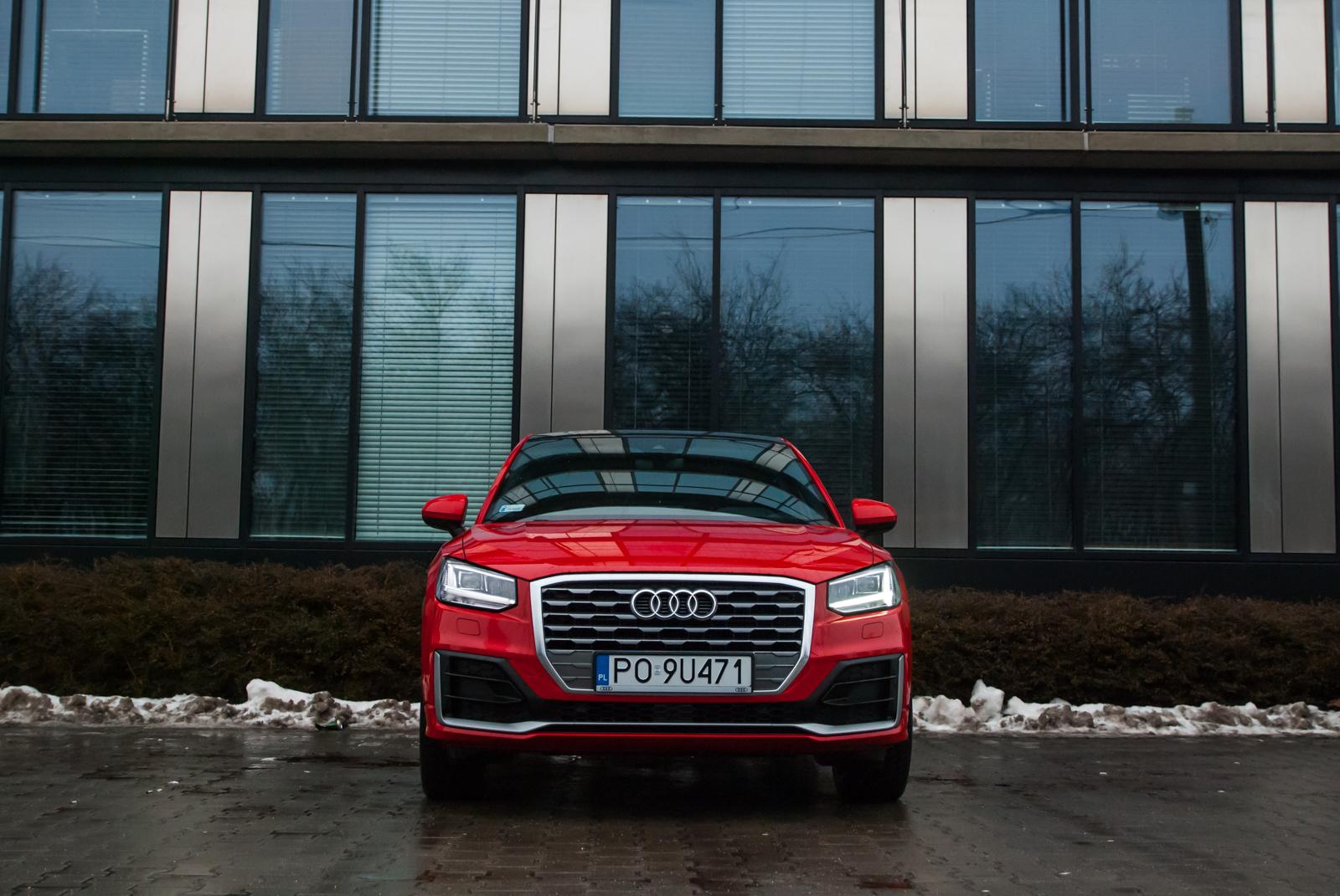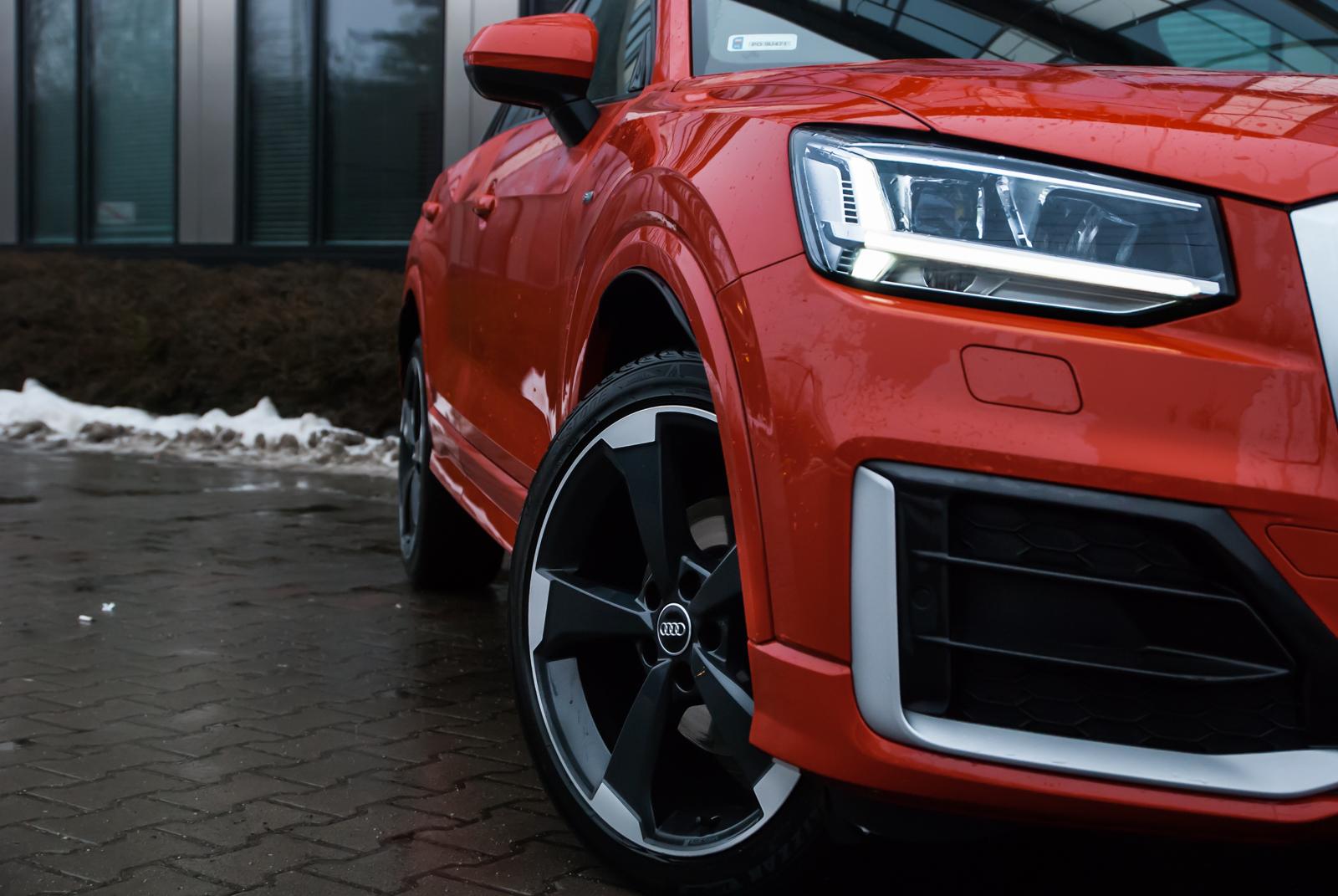 Audi Q2 powstało w oparciu o platformę MQB, wykorzystywaną między innymi w modelu A3. Oba te auta dzielą ze sobą linię produkcyjną, mimo, że poza znaczkiem nie znajdziemy między nimi wielu podobieństw. Jedyne parzyste „Q” jest małym, zgrabnym i lekko kanciastym autem. Marka polubiła się z ostrymi krawędziami i przetłoczeniami, czego najlepszym dowodem jest front najmniejszego crossovera. Z przodu dosłownie wszystko jest geometryczne: od kształtu reflektorów, przez uformowanie osłony chłodnicy, aż po wstawki w zderzaku. Wszystko razem wygląda nowocześnie i choć „ciosanych” elementów jest dużo, dobrze ze sobą współgrają. Zwłaszcza, że auto odziane jest w krwistą czerwień nazwaną przez markę Czerwony Tango metalik. Przyciemnione tylne szyby oraz czarno-srebrne aluminiowe obręcze nadają mu jeszcze więcej charakteru. Ciekawym rozwiązaniem jest pełny słupek C, który kolorem może odbiegać od reszty nadwozia. W testowanym egzemplarzu był szary i dodatkowo zdobiło go logo czterech pierścieni.