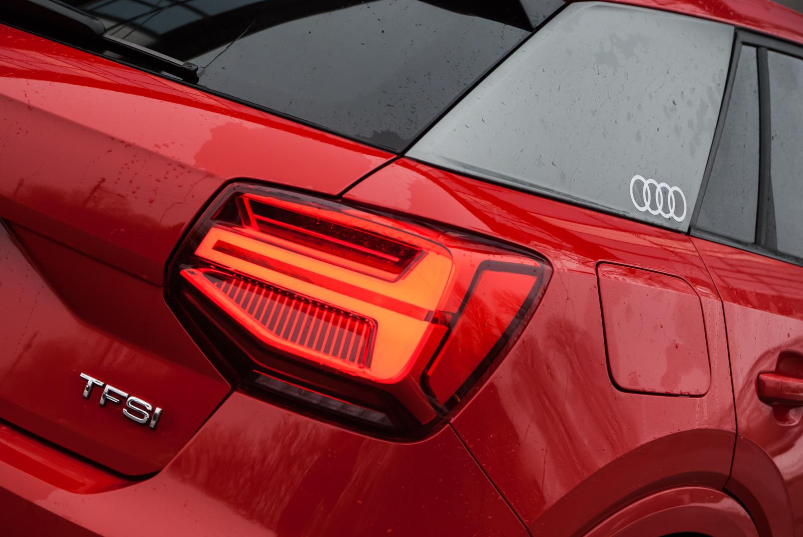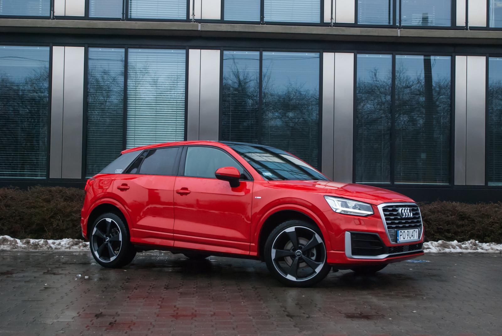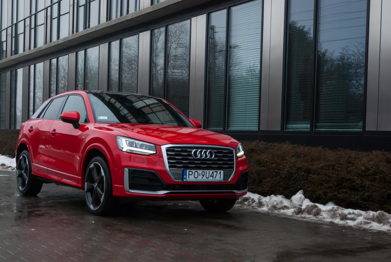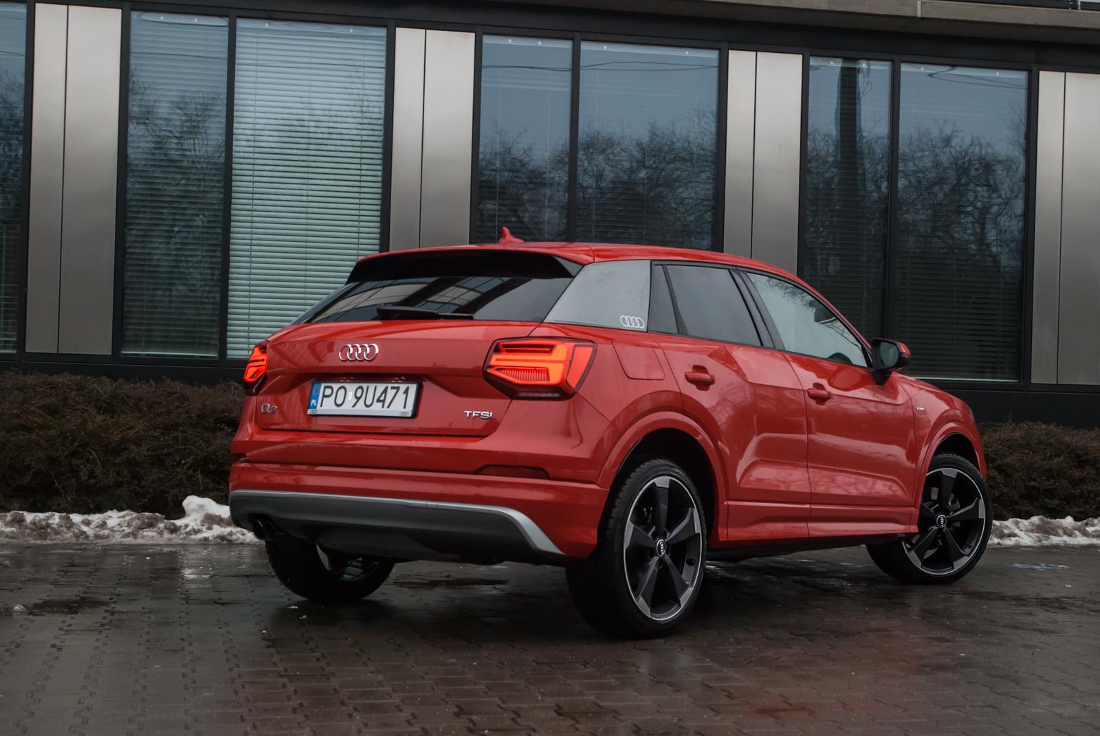 Audi Q2 powstało w oparciu o platformę MQB, wykorzystywaną między innymi w modelu A3. Oba te auta dzielą ze sobą linię produkcyjną, mimo, że poza znaczkiem nie znajdziemy między nimi wielu podobieństw. Jedyne parzyste „Q” jest małym, zgrabnym i lekko kanciastym autem. Marka polubiła się z ostrymi krawędziami i przetłoczeniami, czego najlepszym dowodem jest front najmniejszego crossovera. Z przodu dosłownie wszystko jest geometryczne: od kształtu reflektorów, przez uformowanie osłony chłodnicy, aż po wstawki w zderzaku. Wszystko razem wygląda nowocześnie i choć „ciosanych” elementów jest dużo, dobrze ze sobą współgrają. Zwłaszcza, że auto odziane jest w krwistą czerwień nazwaną przez markę Czerwony Tango metalik. Przyciemnione tylne szyby oraz czarno-srebrne aluminiowe obręcze nadają mu jeszcze więcej charakteru. Ciekawym rozwiązaniem jest pełny słupek C, który kolorem może odbiegać od reszty nadwozia. W testowanym egzemplarzu był szary i dodatkowo zdobiło go logo czterech pierścieni.