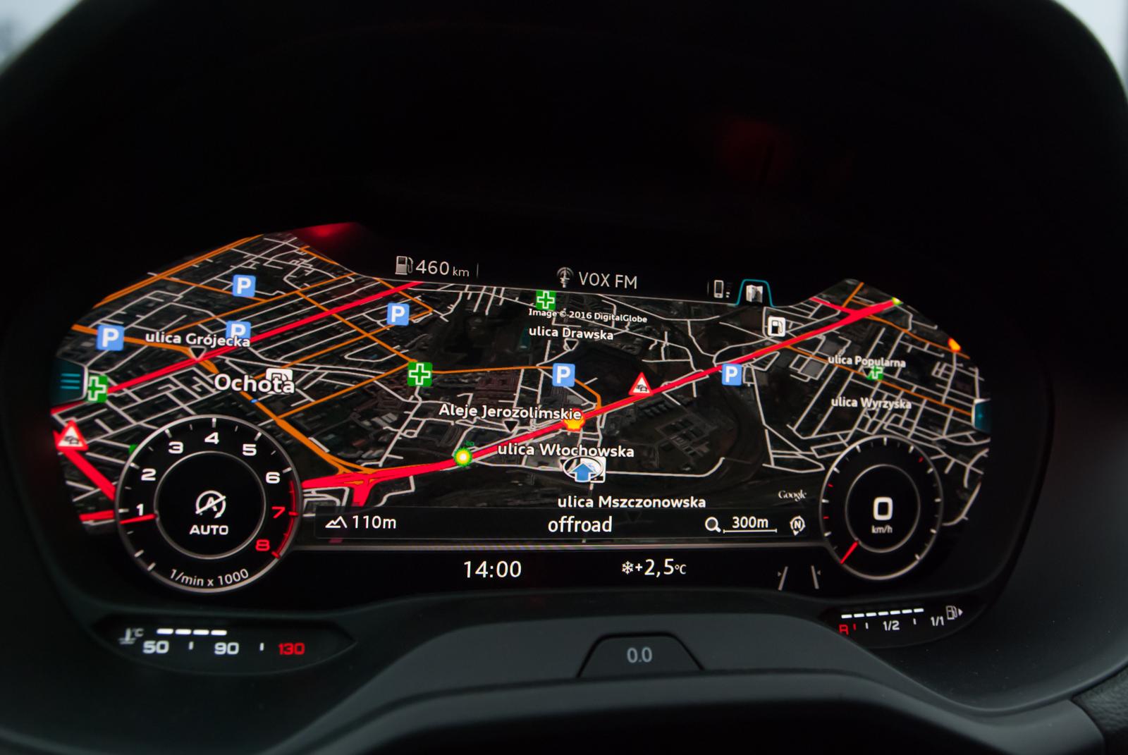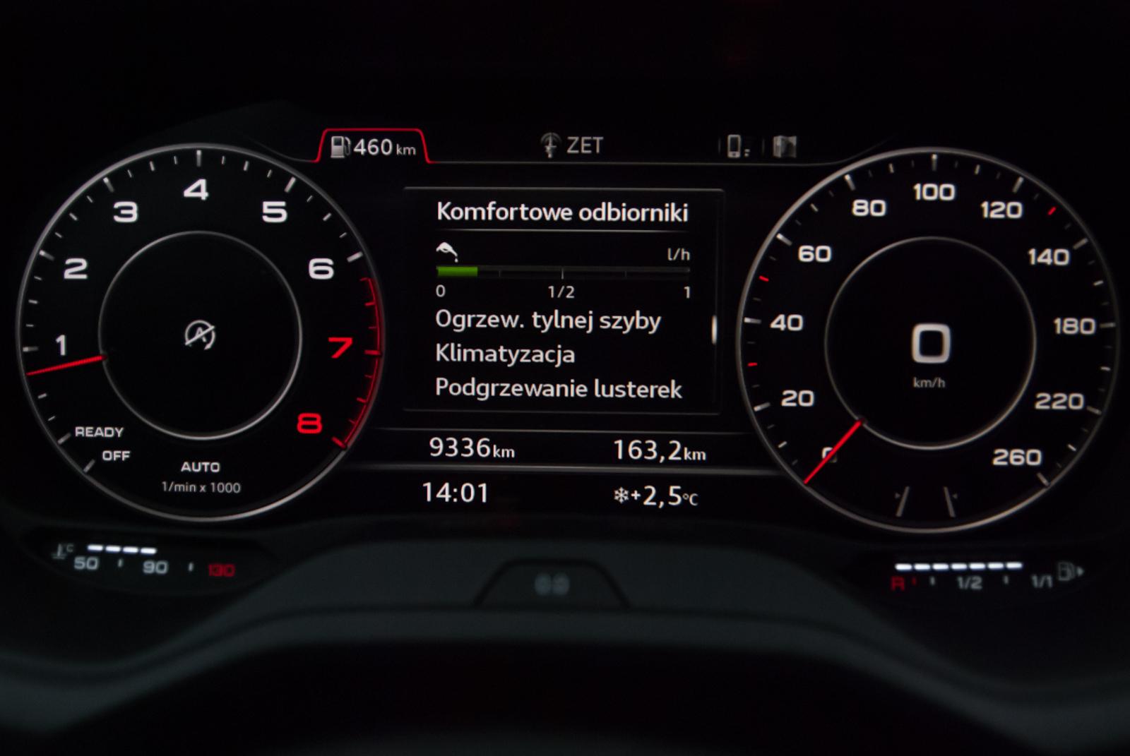 Zasiadając za kierownicą, oczom kierowcy ukaże się przyjemny widok tablicy rozdzielczej w postaci wirtualnego kokpitu. Marka odchodzi od standardowych analogowych wskaźników na rzecz 12,3-calowego wyświetlacza, który jest prawdziwym centrum dowodzenia pojazdem. Możemy na nim wyświetlać prędkościomierz i obrotomierz w dwóch wielkościach, wskazania nawigacji, radia, status pojazdu i wiele innych informacji, do których kierowca chciałby mieć dostęp. Również dane systemów bezpieczeństwa takich jak asystent utrzymywania pasa ruchu (Audi Active Lane Assist), system rozpoznawania znaków drogowych, czy Audi Pre Sense Front z funkcją rozpoznawania ruchu pieszych. Sterowanie wszystkim ułatwia sportowa wielofunkcyjna kierownica, która bardzo przyjemnie leży w dłoniach.