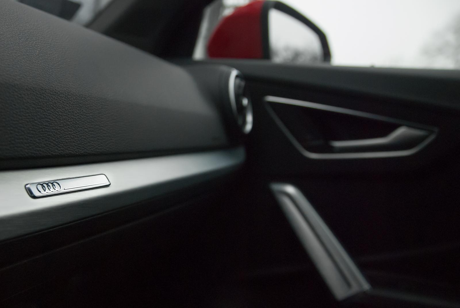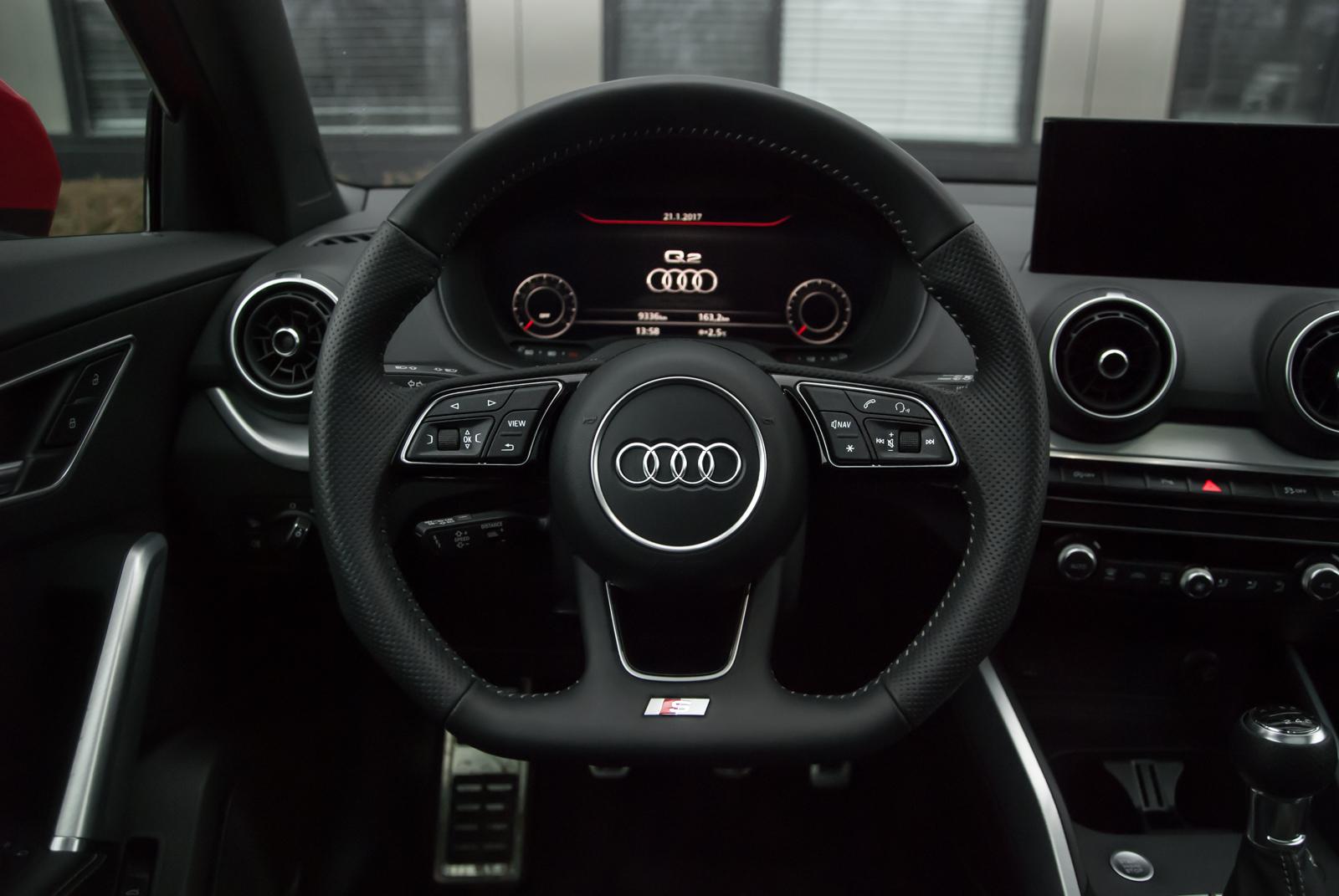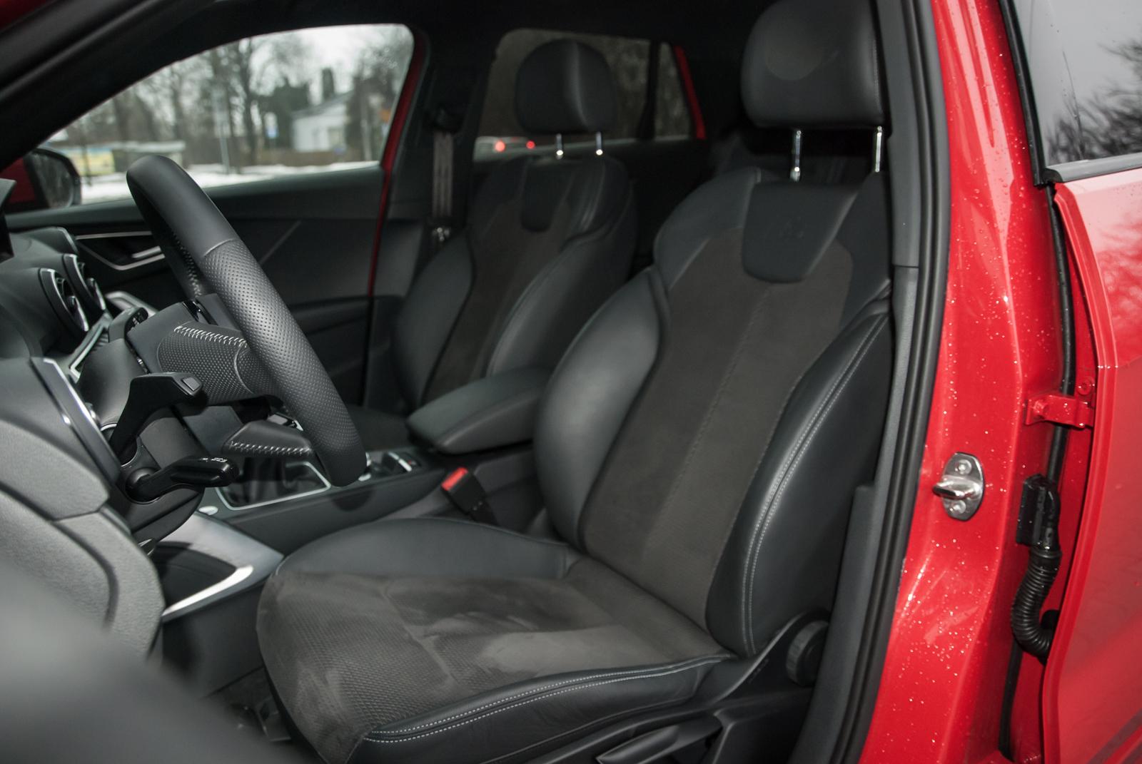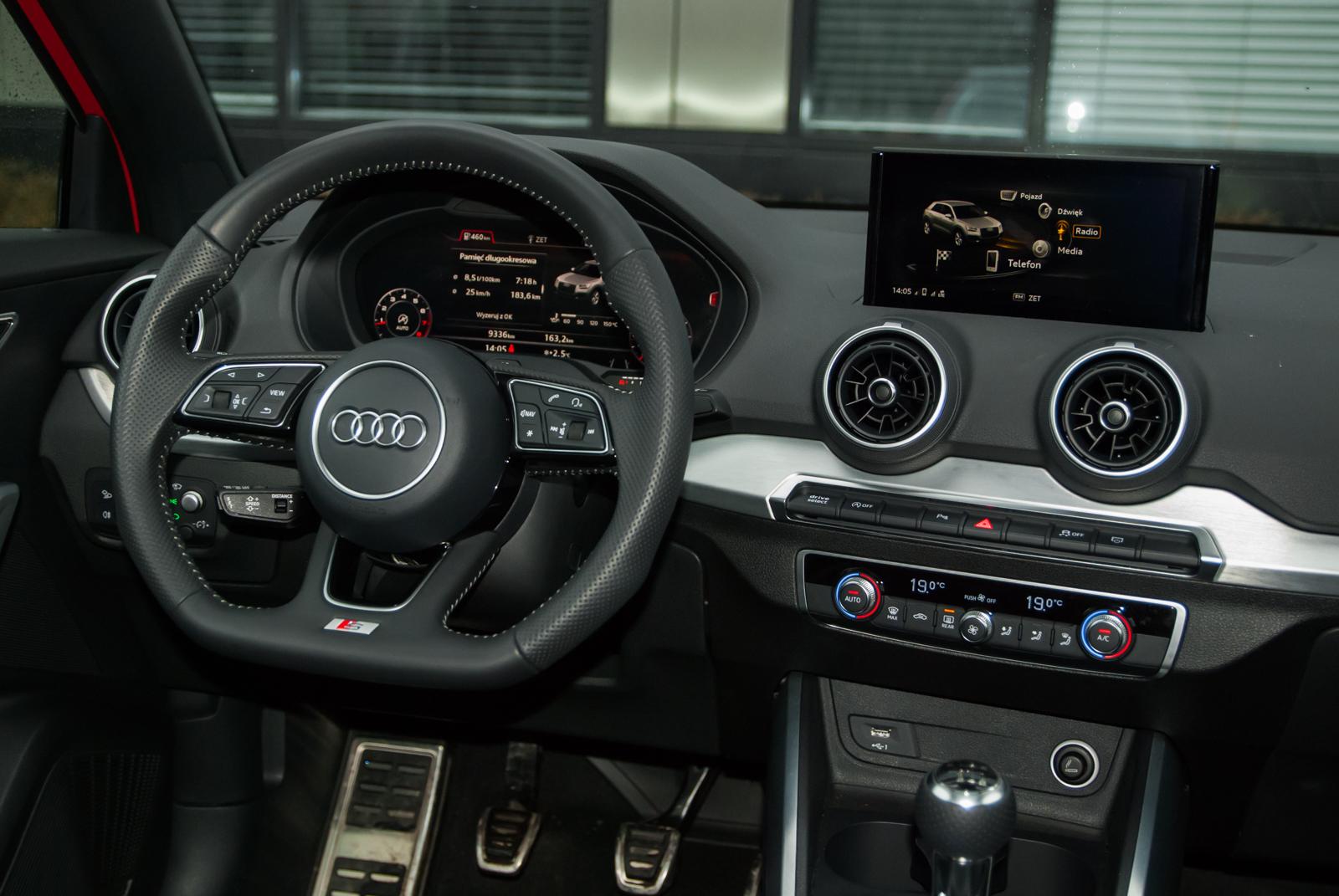 Testowany egzemplarz był wyposażony w pakiet S Line, w którego skład wchodzą między innymi bardzo wygodne półskórzane sportowe fotele. Co jednak dziwi, nie są one ani podgrzewane, ani sterowane elektrycznie. Przyciskiem możemy regulować jedynie podparcie lędźwiowego odcinka kręgosłupa. Przesuwanie obu foteli odbywa się za pomocą typowej „wajchy”. To detal, który nieco kłuje w oczy – w końcu mamy do czynienia z marką premium, która chce stać na równi z Mercedesem czy BMW. Prestiż podkreślają jednak aluminiowe wstawki we wnętrzu. Niestety, znów nie obyło się bez małej wpadki. Znakiem charakterystycznym wielu modeli Audi jest emblemat ‘quattro’ umieszczony po prawej stronie deski rozdzielczej. Podobnie było w przypadku testowanej Q-dwójki, jednak na owym znaczku nie widniało… nic. Czy wobec tego nie lepiej byłoby po prostu zrezygnować z umieszczania tam jakiegokolwiek emblematu?