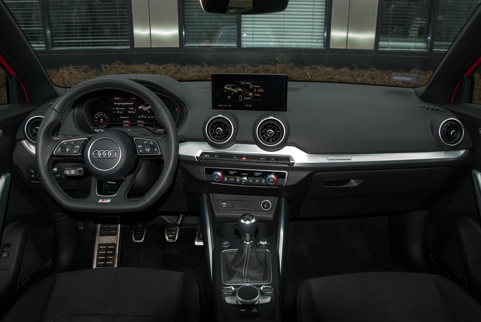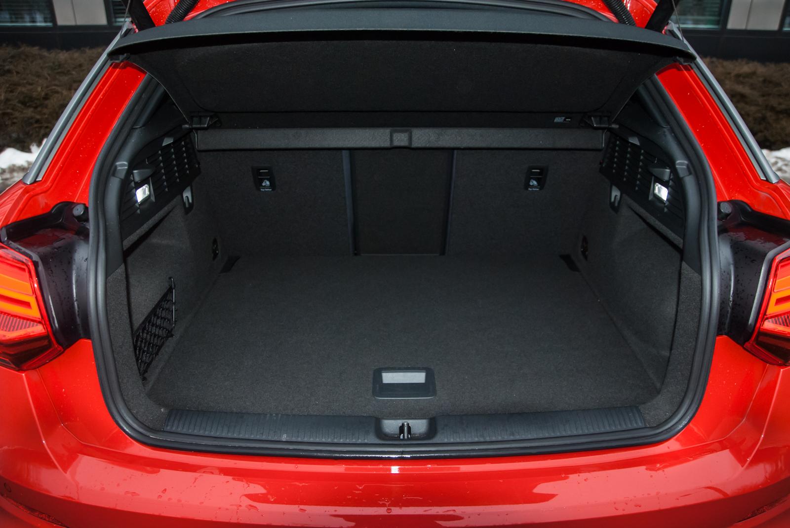 Po niepozornych rozmiarach zewnętrznych trudno oczekiwać od modelu Q2 nadmiernej przestrzeni w kabinie. Choć czarna podsufitka optycznie ją zmniejsza, to nadaje wnętrzu eleganckiego charakteru. Mimo dominującej czerni, w środku nie jest ponuro, a trochę światła wpuszcza otwierany szyberdach. Przestrzeń pasażerska jest dość „kompaktowa”, jednak na 3-częściowej tylnej kanapie, wyposażonej w podłokietnik, dwie dorosłe osoby zmieszczą się bez problemu. Kabina jest bardzo dobrze wyciszona, jednak aby nie było za cicho, na pokładzie znalazł się system multimedialny firmy Bang&Olufsen. Sterowana elektrycznie klapa bagażnika skrywa przestrzeń bagażową o objętości 405 litrów. Do codziennego użytku lub spontanicznych weekendowych wyjazdów miejsca jest aż nadto.