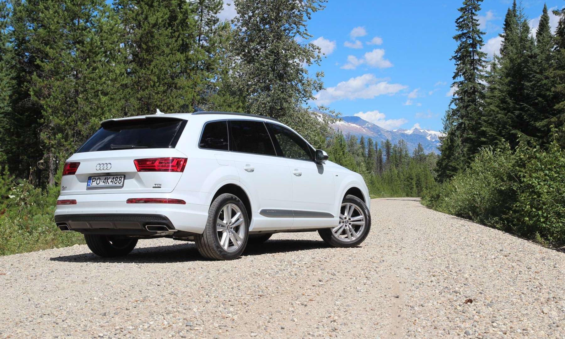 Wybierany przez spory odsetek klientów, a obecny także w testowanym egzemplarzu, pakiet S line kamufluje wszędobylski charakteru SUV-a z Ingolstadt – pozbawia Q7 czarnych nakładek na progi i krawędzie błotników. Nie znajdziemy w nim także wystających spod zderzaków imitacji płyt chroniących podwozie. Nie oznacza to bynajmniej, że Q7 nie sprawdzi się poza głównymi szlakami komunikacyjnymi. Klucząc po zachodzie Kanady, pokonaliśmy kilkadziesiąt kilometrów szutrowymi drogami. Luźna nawierzchnia nie robi na Q7 większego wrażenia – samochód bez trudu utrzymuje dozwolone w takich warunkach 80 km/h. Nie wspomaga się przy tym kontrolą trakcji. Permanentny napęd na cztery koła z centralnym mechanizmem różnicowym TorSen może przekazać na przednią oś do 70% momentu obrotowego lub do 85% na tył. Efektem jest bardzo przewidywalne i neutralne prowadzenie. Korekty ESP następują dopiero, gdy kierowca zdecydowanie przesadzi z prędkością na zakręcie.