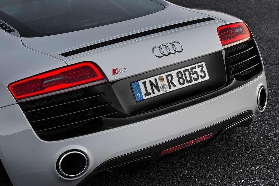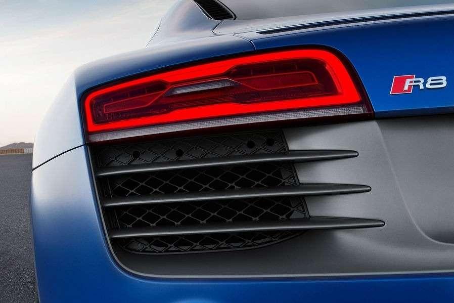 Nowe Audi R8 otrzymało przeprojektowany przód. Na pierwszy rzut oka wygląda bardzo podobnie do poprzedniej wersji, ale po bliższym przyjrzeniu zauważymy nowe lampy LED dostępne w standardzie we wszystkich wersjach modelu, jak również nieco zmieniony grill, który nabrał typowych już dla Audi kształtów – dwa górne rogi zostały ścięte, zaś wewnątrz umieszczono pięć horyzontalnych chromowanych poprzeczek w wersji z silnikiem V10. Oprócz tego boczne wloty powietrza w zderzaku dorobiły się trzech horyzontalnych poprzeczek. Również z tyłu da się zauważyć kilka zmian. Nowe R8 otrzymało świeże światła LED, nieco zmienione logo „R8”, przeprojektowany dyfuzor, wyloty powietrza z trzema poprzeczkami oraz dwie okrągłe końcówki układu wydechowego we wszystkich wersjach silnikowych.