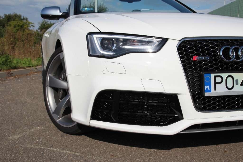 Z zewnątrz nie dostrzeżemy ani grama nadwagi. Samochód wciąż wygląda atletycznie - bez względu na położenie dachu. Śnieżnobiały lakier testowanego RS5 Cabriolet jest jednym, który nie wymaga dopłaty. Doskonale komponuje się z ostrymi liniami wersji RS. Nie jest propozycją dla tych, chcieliby zachować anonimowość. Białe RS5 wyjątkowo rzuca się w oczy. Nawet w czerni samochód nie byłby kompletnie anonimowy. Powiększone wloty powietrza, napompowane błotniki, potężne tarcze hamulcowe, przynajmniej 19-calowe felgi oraz zmniejszony o 20 mm prześwit dają do zrozumienia, że nie jest to po prostu kolejne A5.