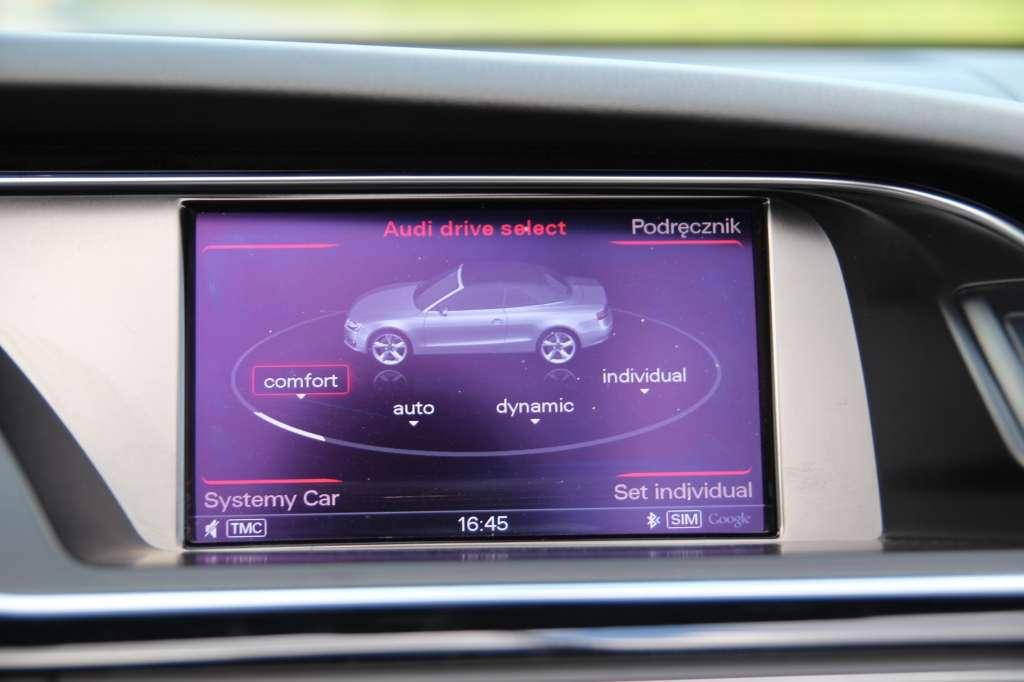 System Audi Drive Select pozwala na dostosowanie sposobu działania silnika, skrzyni biegów, układu kierowniczego, zawieszenia oraz mechanizmu różnicowego do preferencji kierowcy. Do wyboru są tryby Dynamic, Comfort, Auto oraz Individual, który pozwala na skomponowanie własnego schematu ustawień. Ostatnia z wymienionych funkcji jest szczególnie przydatna w Polsce - daje możliwość pozostawienia opcjonalnego, elektronicznie sterowanego zawieszenia w trybie komfortowym nawet po wyostrzeniu nastawów innych podzespołów.