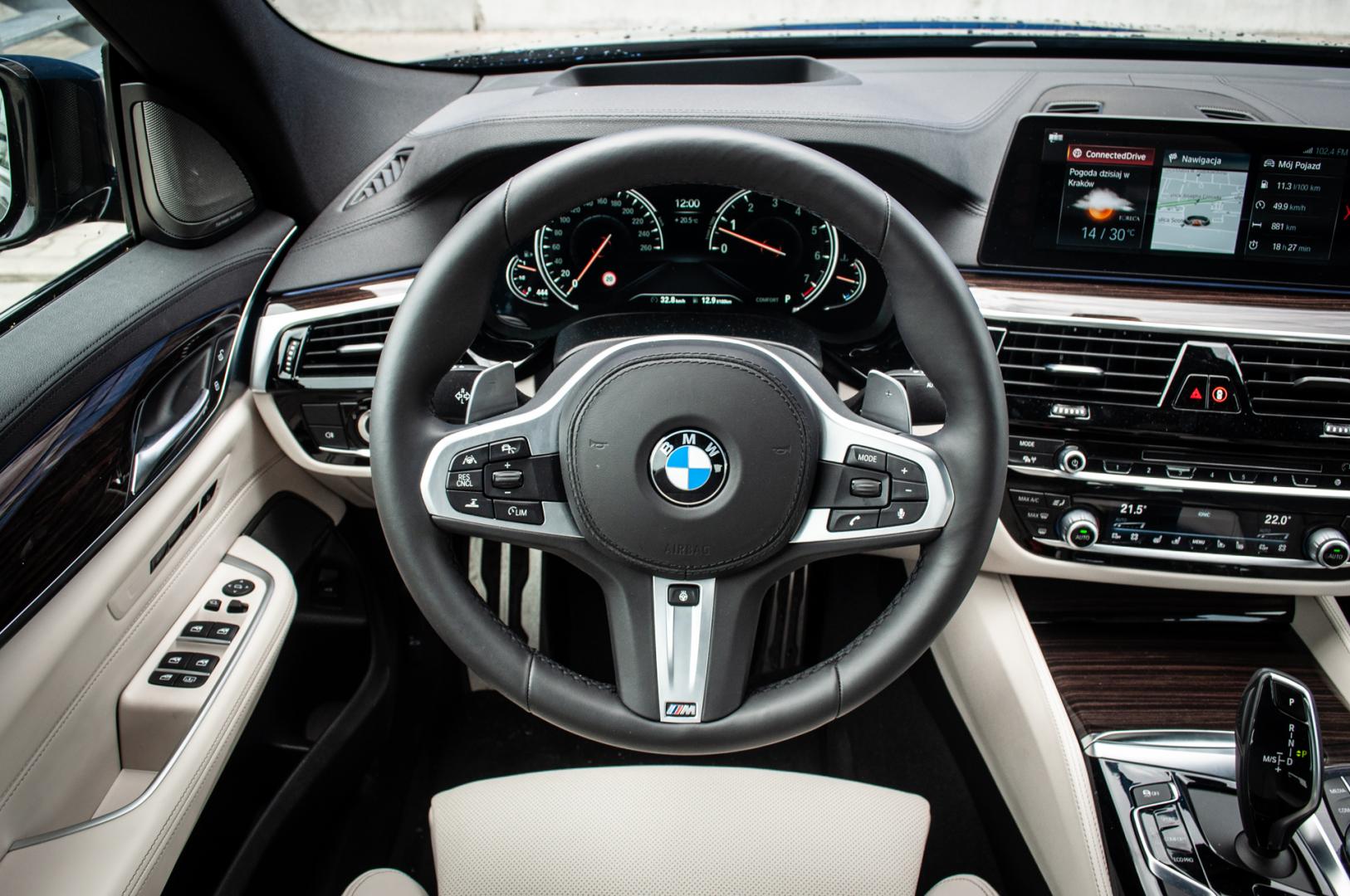 Nie potrafię znaleźć różnic w projekcie deski rozdzielczej serii 6 GT i zwykłem BMW serii 5 G30. To pewnie też dlatego, że 6 GT należałoby uważać za wersję nadwoziową „piątki” - kod producenta to G32. Ciężko jednak uznać to za wadę - wnętrze jest świetnie wykonane, a rozmieszczenie przycisków przemyślane. W tym samochodzie czujesz, za co zapłaciłeś. Wygląda na drogi z zewnątrz i potęguje to wrażenie w środku.