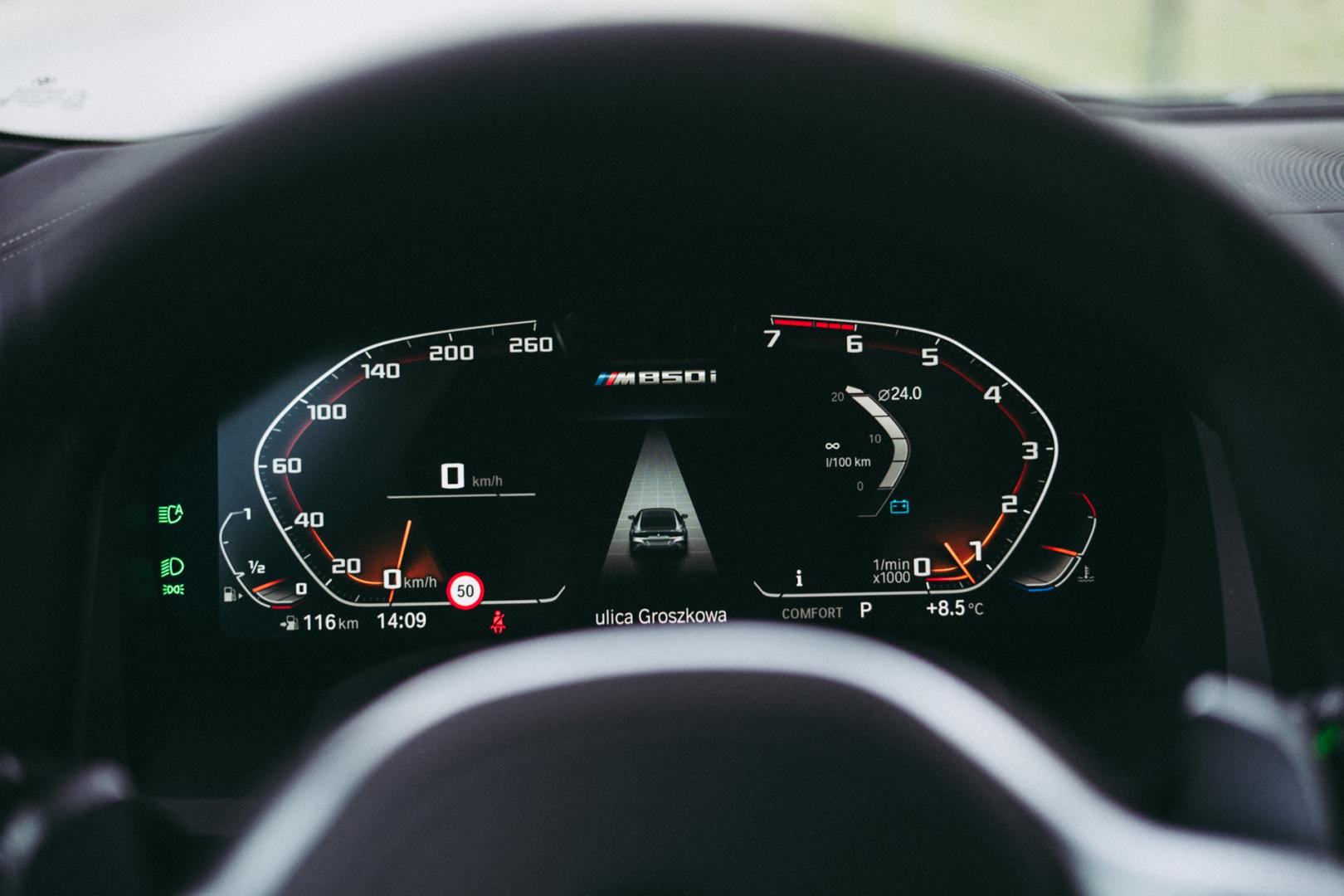 Tylko, że to jeden z tych szybkich samochodów, w których zupełnie nie chce nam się pokazywać wszystkim wokół, co potrafi – choć to w dużej mierze zależy to od charakteru kierowcy. Na mnie działał wręcz kojąco, a to za sprawą genialnego wręcz wyciszenia. V8 sobie mruczy, my toczymy się w kompletnej ciszy, z masażem pleców – czego chcieć więcej? Tym bardziej, że nawet przy 140 km/h wyciszenie nadal jest świetne. Mocne przyspieszenia też nie zaburzają tego spokoju – mimo, że mamy tyle mocy pod maską, M850i przyspiesza bardzo płynnie w trybie komfortowym.