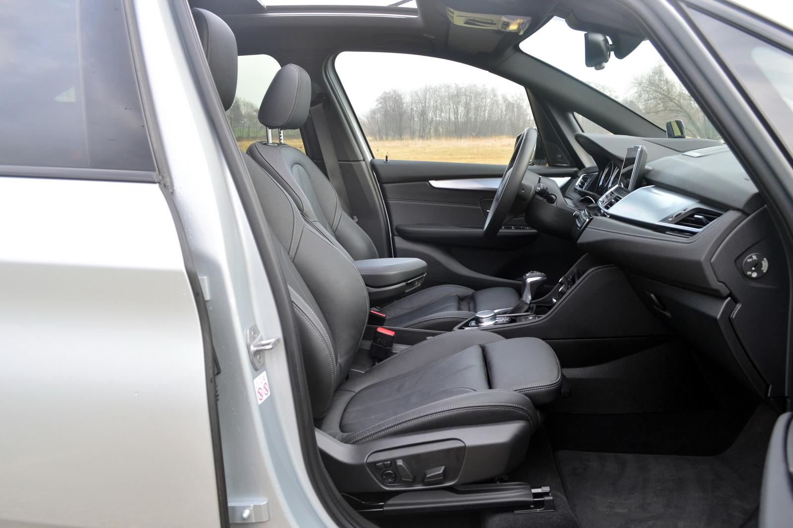 Przednie fotele BMW Serii 2 Active Tourer ustawiane są elektrycznie. Poza regulacją wzdłużną i pochylenia oparcia, za pomocą guzików możemy także ustawić dodatkową podpórkę pod krzyże, oraz zacisnąć boczki, czyniąc z fotela sportowy „kubełek”, który uprzyjemni jazdę na każdej krętej drodze.