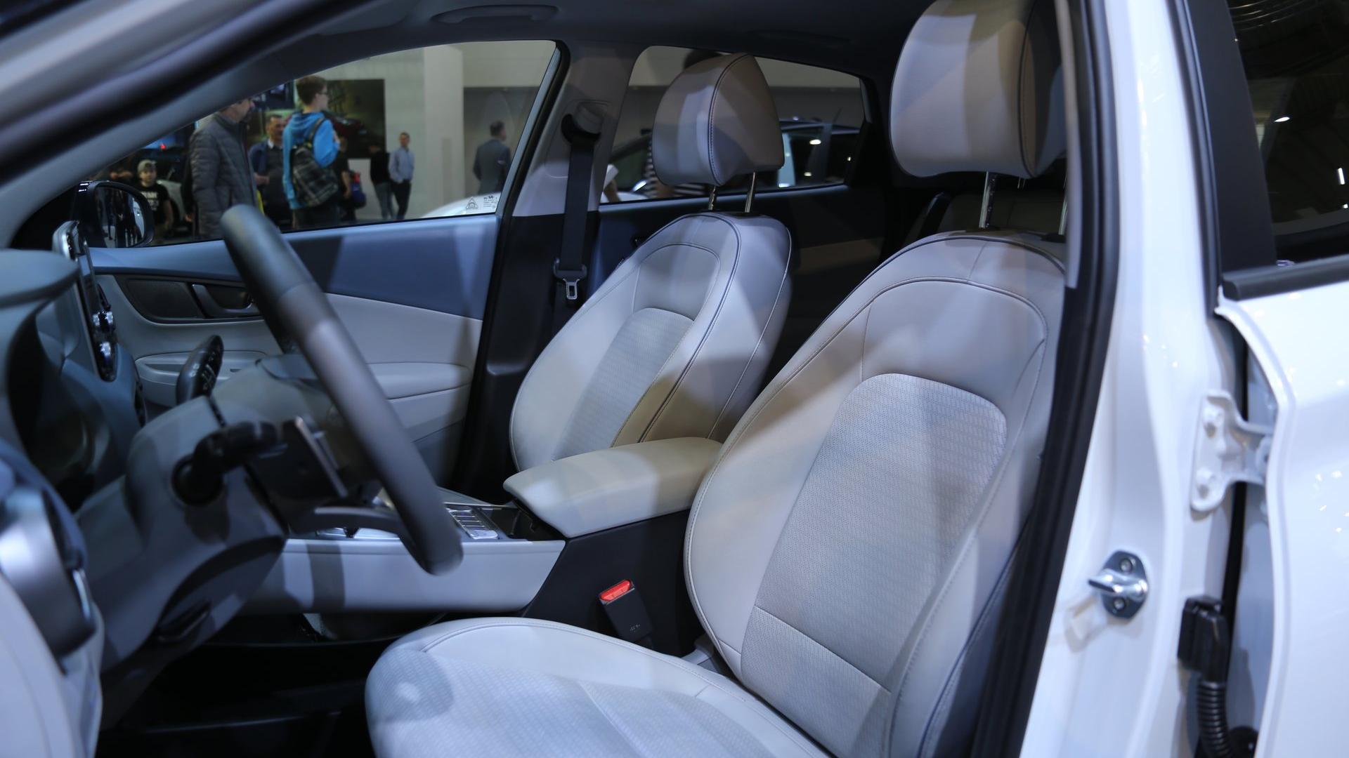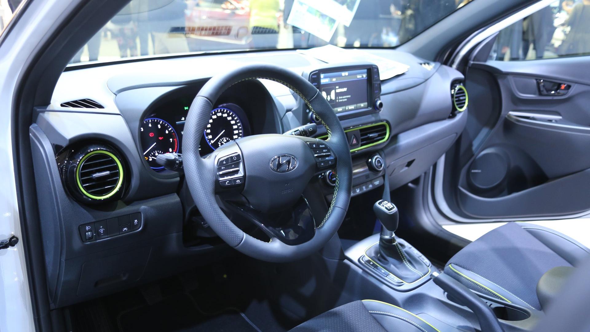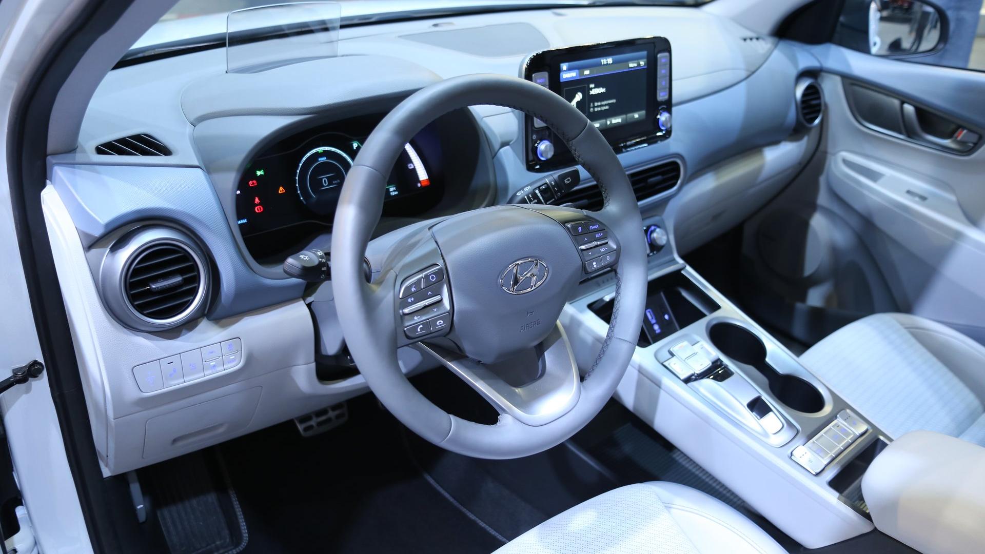 Wnętrze wersji elektrycznej delikatnie różni się od modelu Kona, napędzanego silnikami konwencjonalnymi. Po zajęciu miejsca za kierownicą w oczy rzuca się nowy wzór zegarów, który pokazuje parametry niezbędne do monitorowania pracy układu napędowego. Ponadto sterowanie trybami jazdy i „skrzynią biegów” odbywa się za pomocą przycisków w konsoli centralnej – wygląda to bardzo nowocześnie, elegancko i pozwoliło na wygospodarowanie kilku nowych przestrzeni na drobiazgi. Ekran multimedialny urósł do 8 cali, a także zmieniono wygląd wskazań na wyświetlaczu head-up. Ważną rzeczą jest, że pomimo umieszczenia w samochodzie niemałych akumulatorów, bagażnik zmalał względem zwykłej Kony o raptem 28 litrów, a pojemność podstawowa to przyzwoite 332 litry.