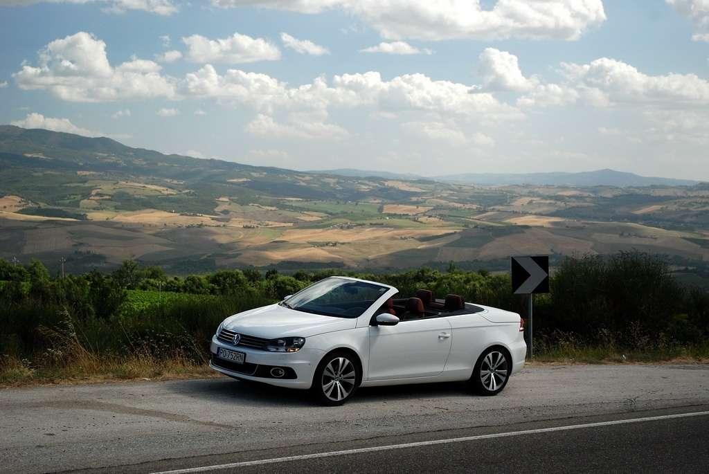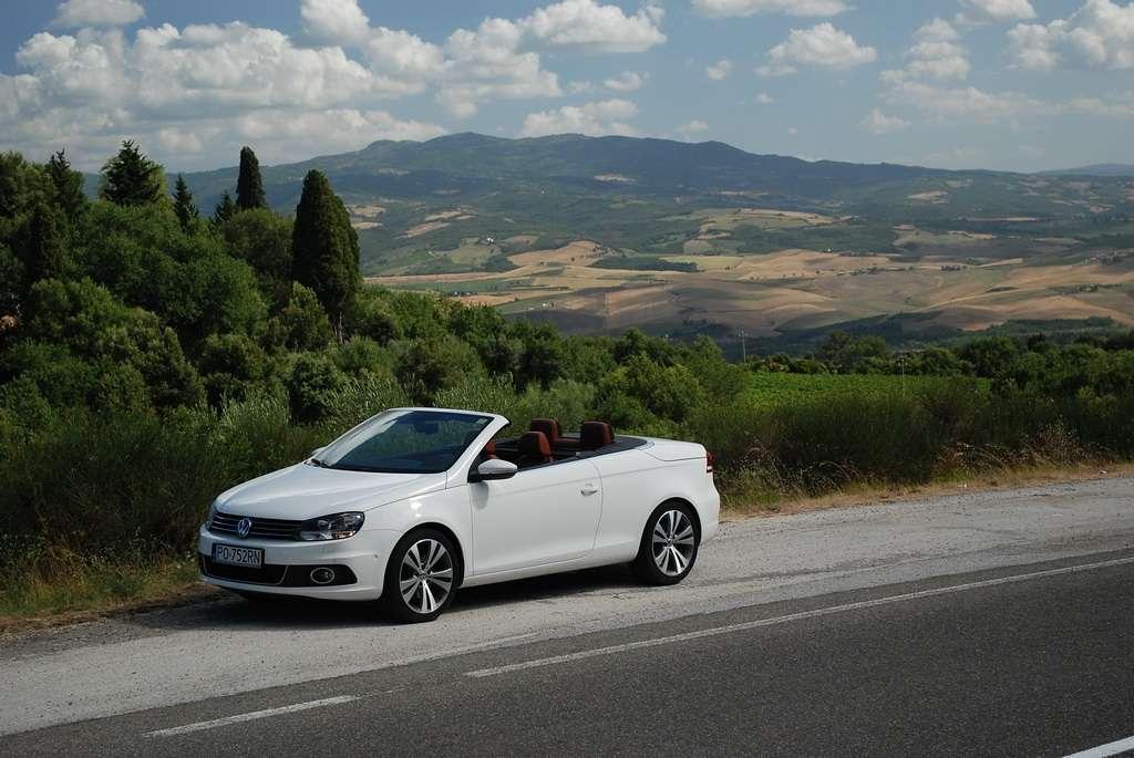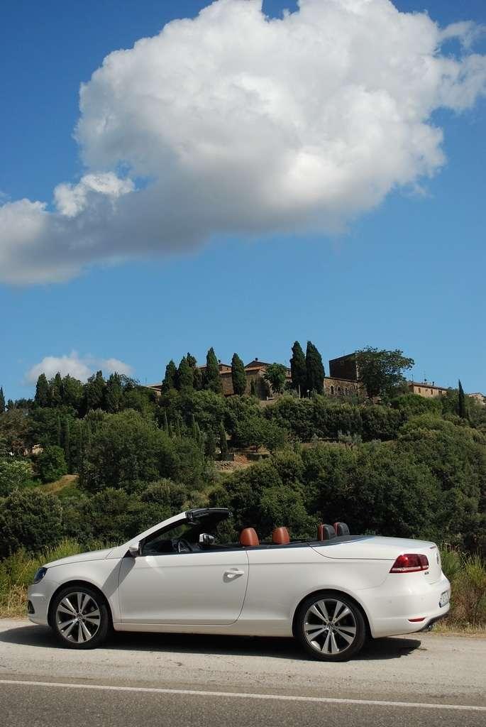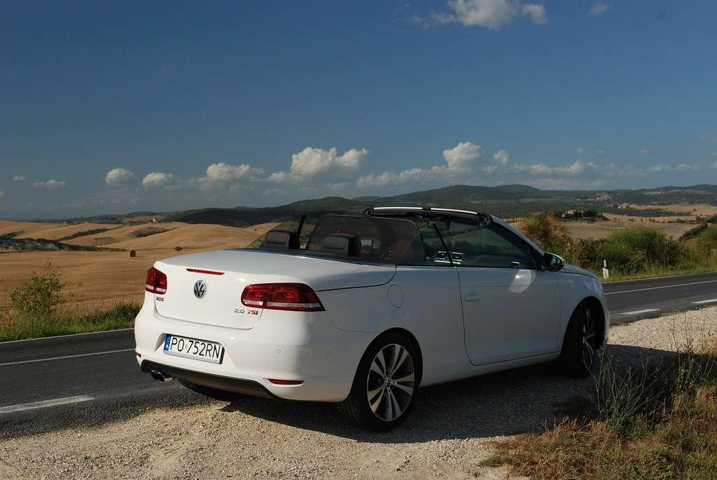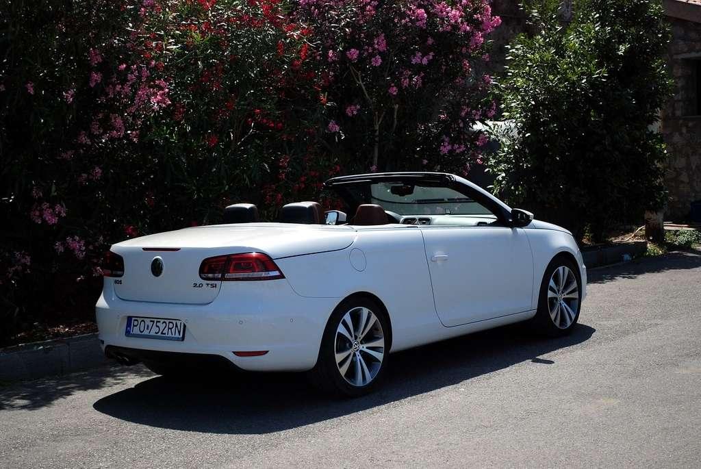 Golf Cabriolet jest dla mnie zagadką. Jest bardzo popularny, ma rzeszę zwolenników i świetnie się sprzedaje – nie potrzebuje więc wsparcia w postaci kolejnej odmiany nadwozia. Jednak VW zdecydował się na „obcięcie dachu” w swoim kompakcie. Oczywiście zamiana dachu na „softtop” to nie jedyny zabieg jakiemu zostało poddane nadwozie Golfa. Klasyczny dach nadaje sztywność autu, tak więc żeby auto było bezpieczne i dobrze się prowadziło, jego nadwozie zostało usztywnione (m.in. podłoga, progi, tylna belka, drzwi). Powiem więcej – nie jest to żaden „chłyt martetindody”. Podczas jazd testowych po nie zawsze równych włoskich drogach, mieliśmy okazję poczuć, że Eos zależnie od tego czy ma dach otwarty, czy zamknięty zachowuje się różnie na drodze. Szczególnie czuć to na łukach z poprzecznymi nierównościami. Golf natomiast pozostaje w takich sytuacjach niewzruszony. Dlaczego inżynierowie zdecydowali się na miękki dach? Podobno jest to zasługa zwartej sylwetki Golfa, któremu sztywny dach pasowałby jak wół do karety. Mimo takiej konstrukcji w aucie podczas jazdy z zamkniętym dachem jest bardzo cicho, natomiast dzięki takiej konstrukcji dach bardzo szybko się składa (9 sekund) i rozkłada (11 sekund), nie zajmując przy tym miejsca w bagażniku. Jego stała pojemność wynosi 250 litrów – problemem jest tylko wąski otwór załadunkowy, który skutecznie hamuje zapędy bagażowego.
