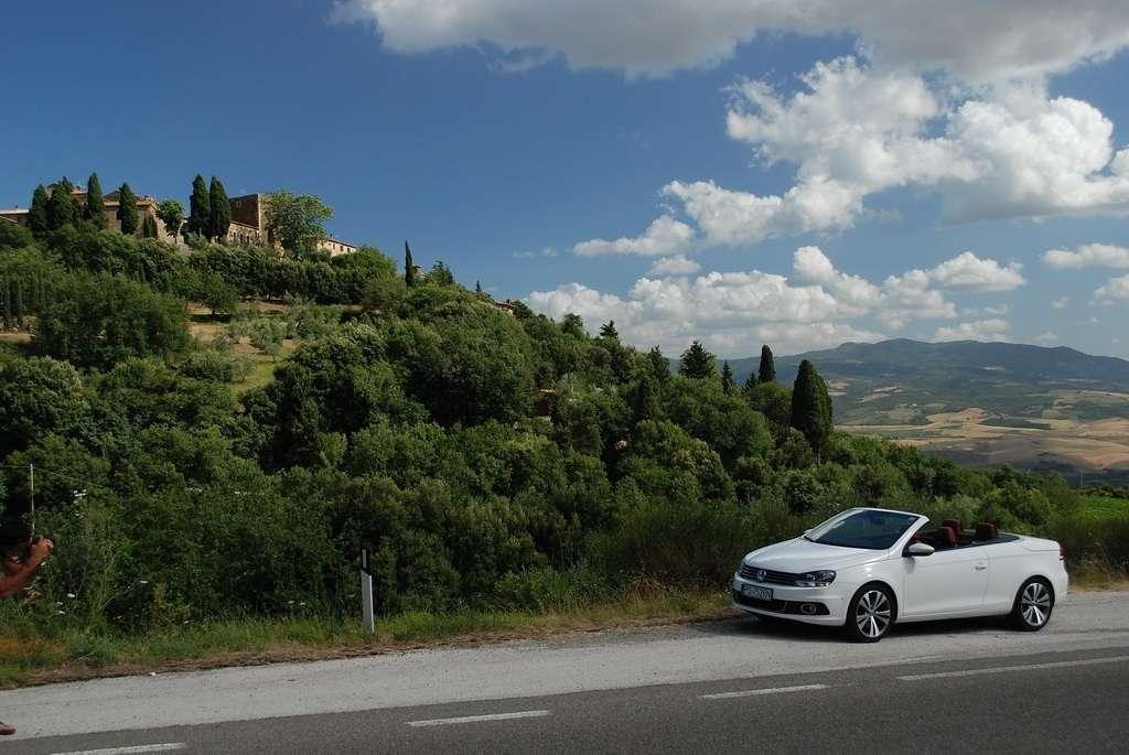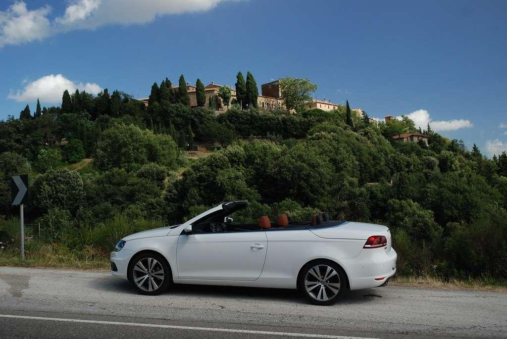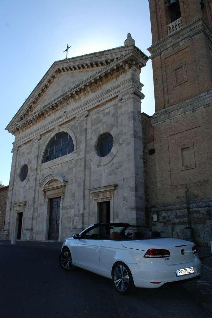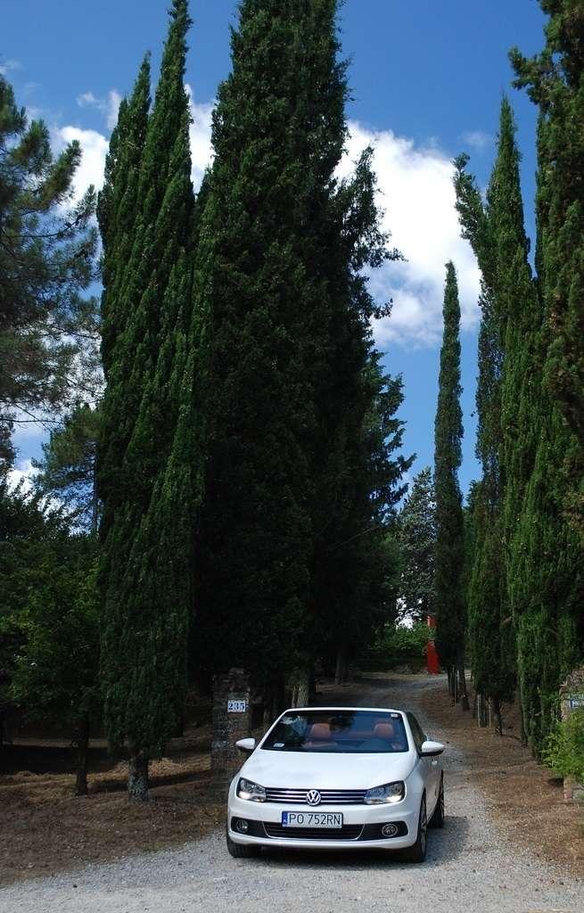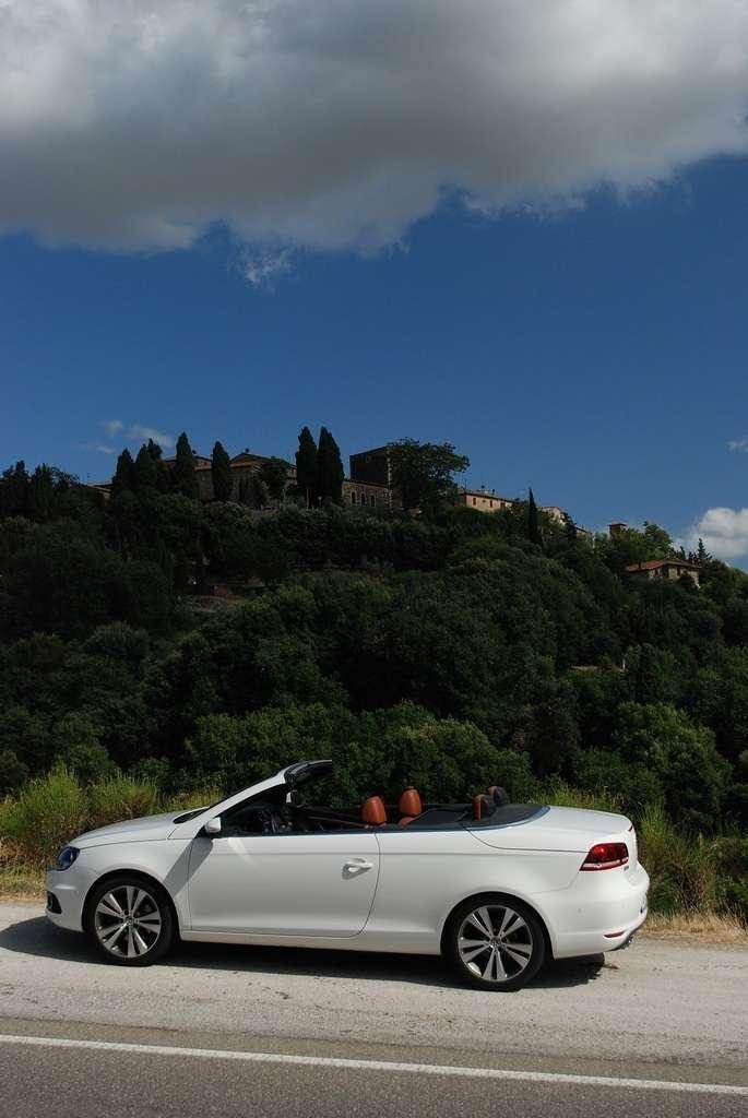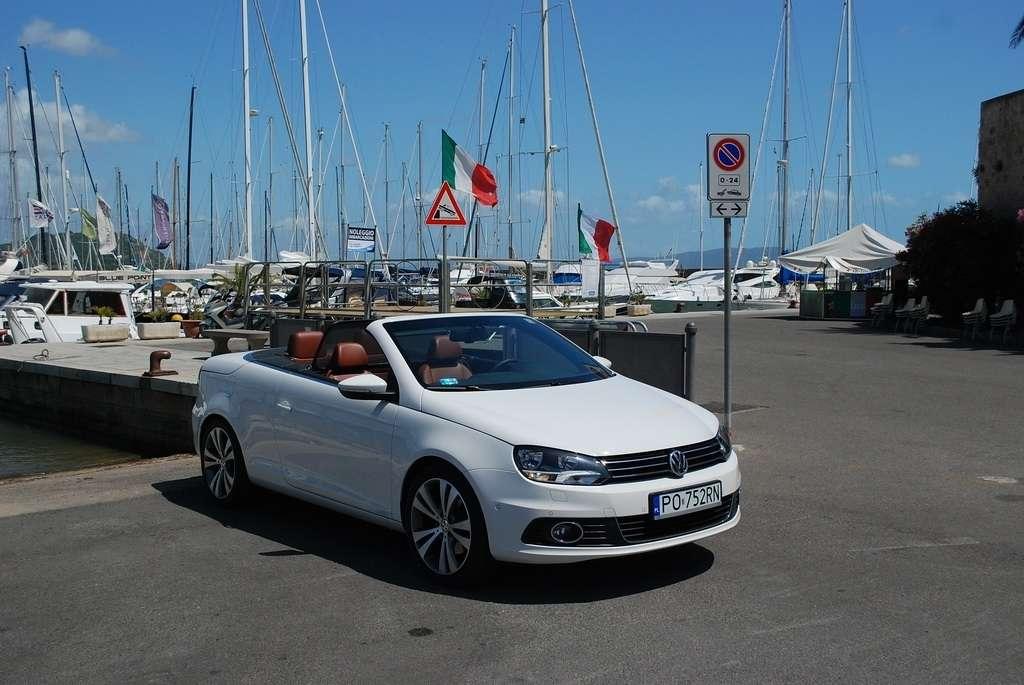 Golf Cabriolet jest dla mnie zagadką. Jest bardzo popularny, ma rzeszę zwolenników i świetnie się sprzedaje – nie potrzebuje więc wsparcia w postaci kolejnej odmiany nadwozia. Jednak VW zdecydował się na „obcięcie dachu” w swoim kompakcie. Oczywiście zamiana dachu na „softtop” to nie jedyny zabieg jakiemu zostało poddane nadwozie Golfa. Klasyczny dach nadaje sztywność autu, tak więc żeby auto było bezpieczne i dobrze się prowadziło, jego nadwozie zostało usztywnione (m.in. podłoga, progi, tylna belka, drzwi). Powiem więcej – nie jest to żaden „chłyt martetindody”. Podczas jazd testowych po nie zawsze równych włoskich drogach, mieliśmy okazję poczuć, że Eos zależnie od tego czy ma dach otwarty, czy zamknięty zachowuje się różnie na drodze. Szczególnie czuć to na łukach z poprzecznymi nierównościami. Golf natomiast pozostaje w takich sytuacjach niewzruszony. Dlaczego inżynierowie zdecydowali się na miękki dach? Podobno jest to zasługa zwartej sylwetki Golfa, któremu sztywny dach pasowałby jak wół do karety. Mimo takiej konstrukcji w aucie podczas jazdy z zamkniętym dachem jest bardzo cicho, natomiast dzięki takiej konstrukcji dach bardzo szybko się składa (9 sekund) i rozkłada (11 sekund), nie zajmując przy tym miejsca w bagażniku. Jego stała pojemność wynosi 250 litrów – problemem jest tylko wąski otwór załadunkowy, który skutecznie hamuje zapędy bagażowego.