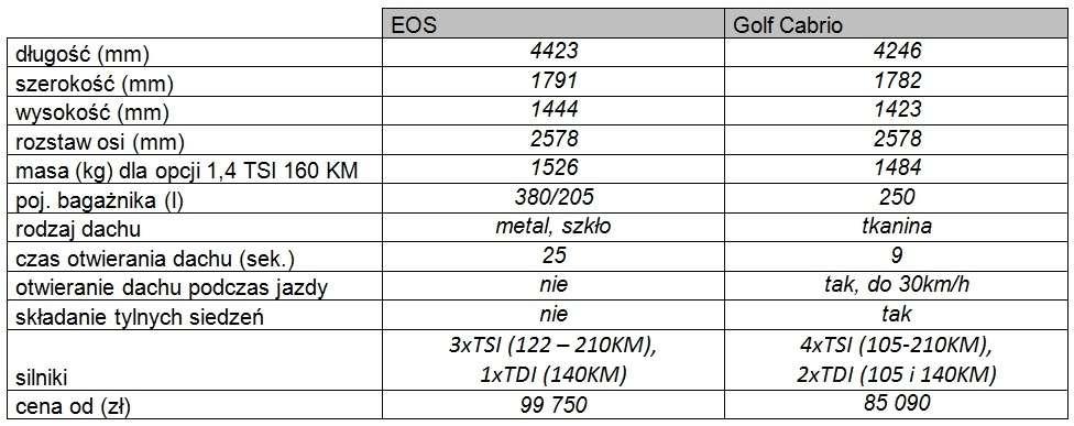 Po odbyciu jazd testowych obydwoma kabrioletami, stwierdzam że wybór pomiędzy nimi jest trudny. Obydwa auta dostarczają takiej samej frajdy z jazdy, obydwa zachowują się grzecznie na drodze, obydwa są… jak przyrodni bracia – to auta podobne do siebie a zarazem różne. Golf urzeka zwinną sylwetką, Eos kusi klasyczną linią. Którego wybrać? Samo porównywanie danych technicznych nic nam nie da. Myślę, że przy wyborze musi zadecydować serce, błysk w oku lub zasobność portfela – to one podpowiedzą, które z tych aut będzie lepsze dla nowego właściciela.