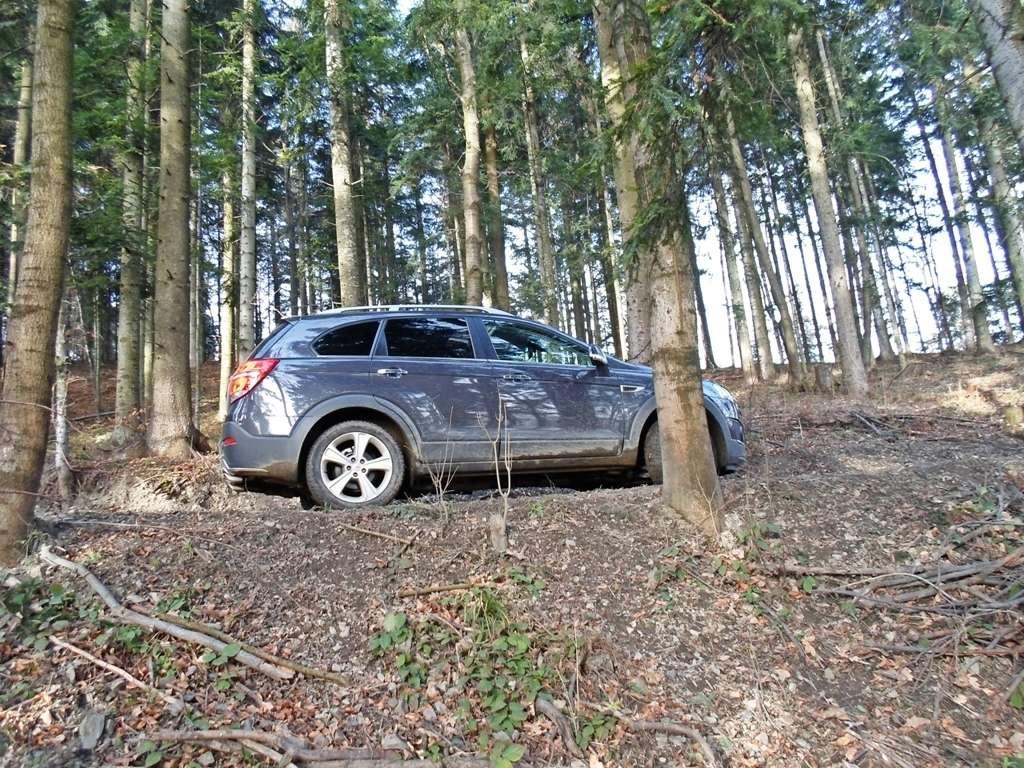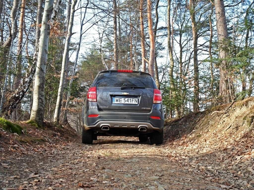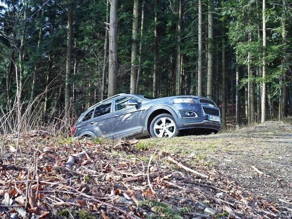 Bardziej od leśnych duktów należy unikać dróg obfitujących w błoto. Dlaczego? Nie dość, że Captiva nie ma w standardzie odpowiednich opon, to w dodatku próżno szukać stałego napędu na cztery koła. Do dyspozycji kierowcy pozostaje system, który sam decyduje kiedy tylna oś ma wkroczyć do akcji. Robi to dość inteligentnie, ale jeśli zaczniemy go bardzo potrzebować, możemy stwierdzić, że "męczy" się dość szybko, co zakomunikuje nam zmysł powonienia. Szkoda, napęd, który można "zblokować" na stałe daje jednak sporą przewagę w tym segmencie. W terenie nie będziecie narzekać na silnik - jemu akurat nic nie brakuje. 184 konie mechaniczne i 400 Nm dostępnych przy 2000 obr./min świetnie wykonują swoją pracę. Motor jest mocny, elastyczny, cichy i...oszczędny. Kilkadziesiąt kilometrów pokonanych w terenie o różnym stopniu trudności dało średnie spalanie na poziomie 11,4-litra. Naprawdę nieźle jak na jazdę, którą najlepiej scharakteryzować słowami: szarpana, żółwia i totalnie nieekonomiczna. Do silnika idealnie pasuje 6-biegowa, automatyczna skrzynia, która może nieco leniwa na asfalcie w terenie pomaga spokojnie pokonywać wertepy. Zmienia przełożenia niezauważalnie i wystarczająco szybko. Reduktor? Nikt przy zdrowych zmysłach nie szukałby go długo w samochodzie tego typu.