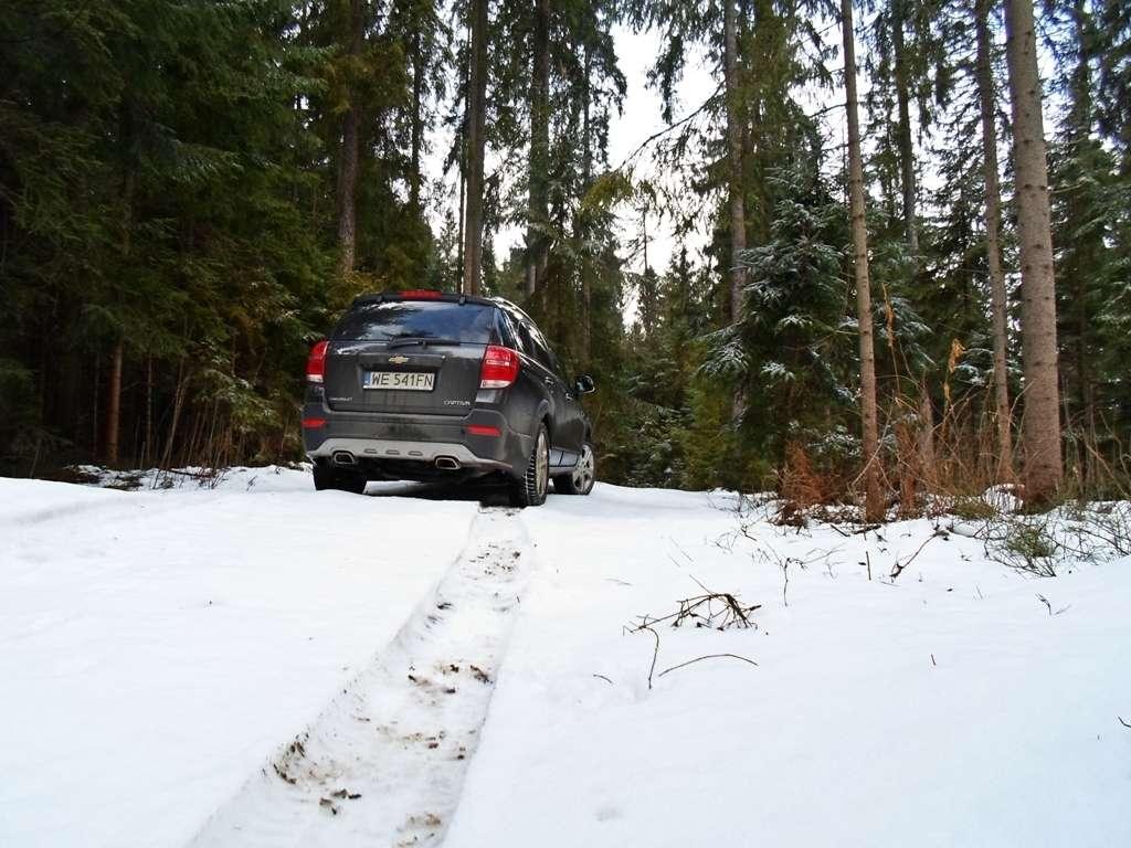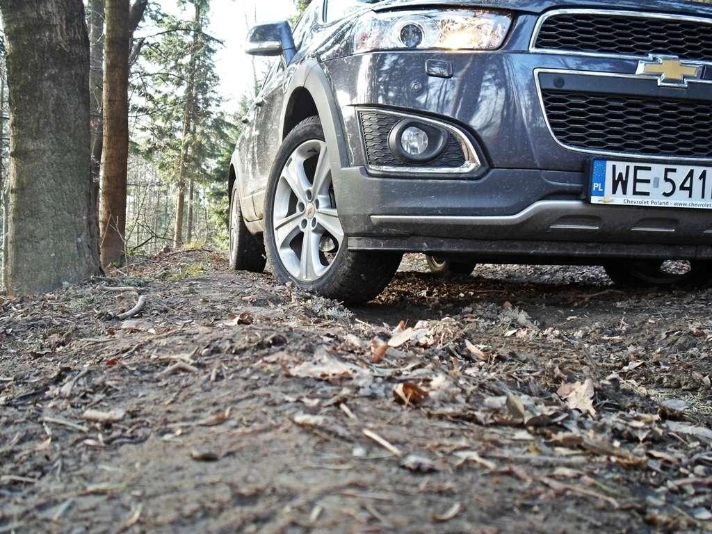 Wjeżdżając do lasu należy pamiętać, że Chevrolet jest znacznie większy od przeciętnego pojazdu poruszającego się tam na co dzień. Suzuki, Łady, czy Toyoty używane przez leśników są znacznie węższe, a i tak stan ich lakierów zdradza częsty kontakt z gałęziami. Co na to Captiva? Początkowo bałem się o jej ładną "buźkę" nie bez przyczyny, bo wymiary robią swoje (przytoczę: 4673 x 1849 x 1756 mm) i stanowią nie lada wyzwanie w wąskim labiryncie drzew. Gdy droga się zwęża pozostaje nam albo znieczulić się na jęk gałęzi szorującej karoserię, albo obrać inną trasę. Jeśli jednak dobrze zaplanujemy przejazd okazuję się, że Captiva mieści się tu i ówdzie i nie każde zwężenie drogi oznacza zawracanie. SUV Chevroleta bronił się dzielnie, ale przyznaję, w kilku miejscach odpuściłem.