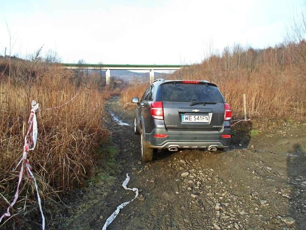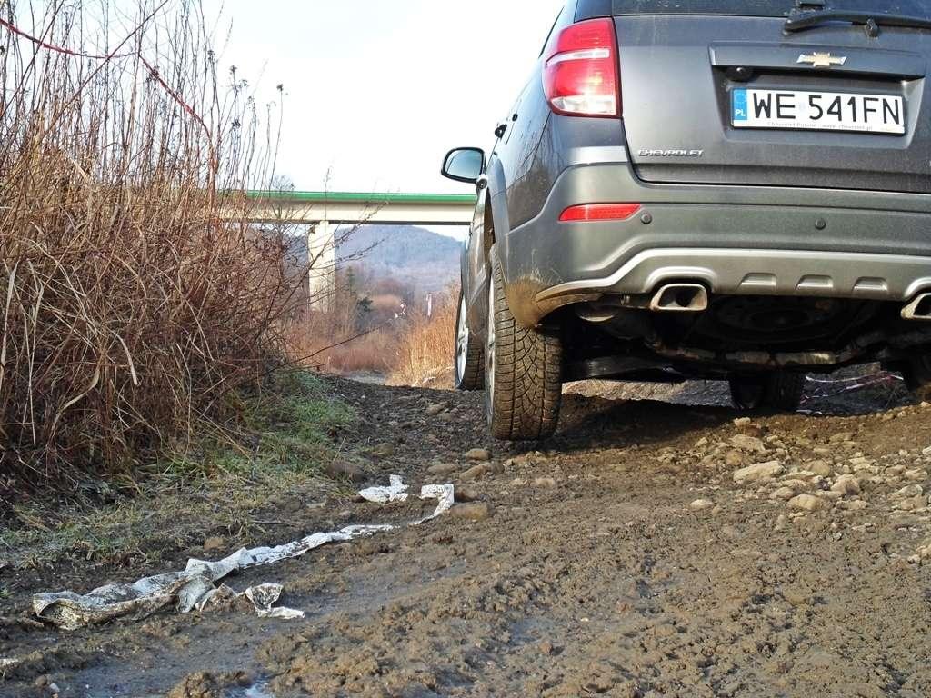 Przejdźmy, a raczej pojedźmy dalej. Byłem przekonany, że w końcu znajdę jakiś słaby punkt tego SUV-a. Nie musiałem długo czekać. Z pomocą przyszła mi mała kamienista skarpa, którą z premedytacją wykorzystałem. Chciałem sprawdzić jakim wykrzyżem osi może pochwalić się ten samochód, w końcu to jeden z ważniejszych parametrów dla terenówek. Niestety rozczarowanie było naprawdę duże. Właściwie można powiedzieć, że odwrotnie proporcjonalne do możliwości Captivy. Zdobycie tej skarpy okazało się niemożliwe, bo ledwie najechałem na nią przed nim kołem, to tylne już wisiało w powietrzu. W ruch poszedł mechanizm różnicowy, opona cięła powietrze, a Captiva stała się właściwie tylko i wyłącznie przednionapędowa. Niestety wykrzyż osi okazał się mizerny i niewiele przewyższa możliwości samochodu osobowego. Zbrodni dopełniła kontrolka poziomu oleju, którą aktywował przechył jednostki napędowej. Na płaskim bagnet oleju wskazywał "max", zatem jak widać Diesel o pojemności 2.2-litra również nie przepada za taką "gimnastyką". Cóż, Captiva, to nie Defender. Plusem jest natomiast to, że mimo tego "rozciągania" samochód nie wydawał z siebie żadnych podejrzanych dźwięków, a wszystkie drzwi swobodnie otwierały się i zamykały.