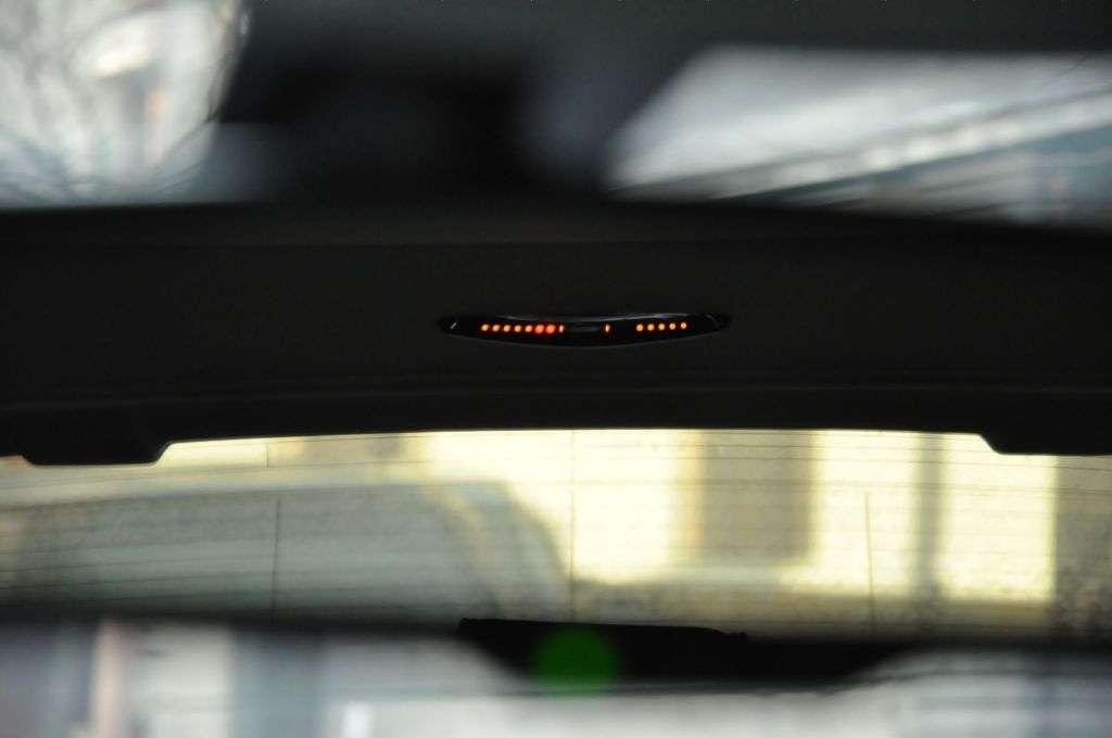 Jeszcze słowo o parktroniku: działa do prędkości 20 km/h, a jego wyświetlacze znajdują się pod przednią szybą oraz w podsufitce nad oparciem tylnej kanapy. Miejsce z tyłu nie jest przypadkowe, bo umieszczony w tym miejscu wyświetlacz jest widoczny w lusterku, można więc pilnować zarówno widoku za szybą, jak i kolorowych diod.