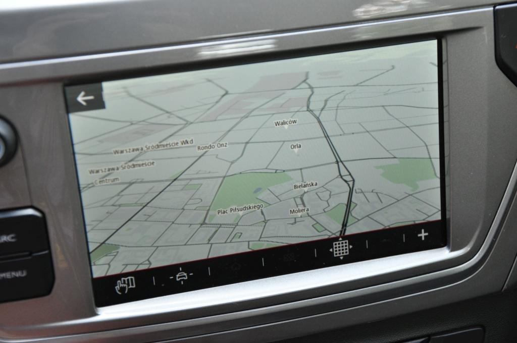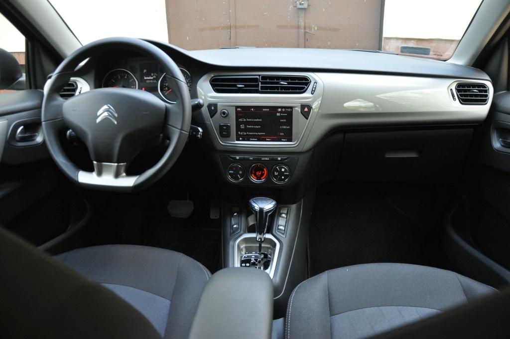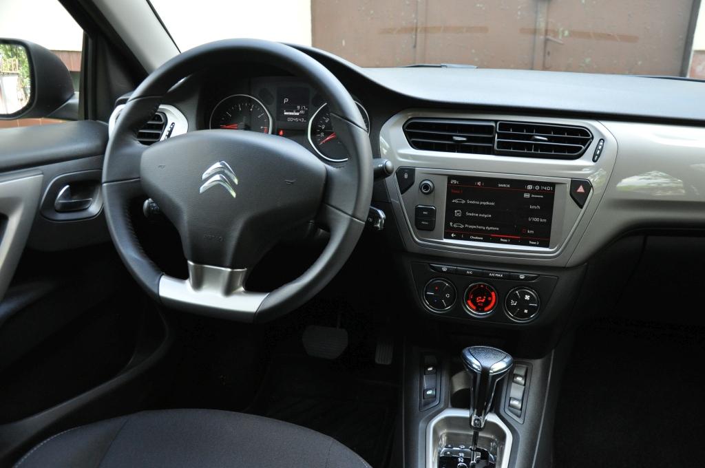 O ile Dacia Logan po niedawno przeprowadzonej modernizacji otrzymała ładną i wygodną kierownicę, to w Citroenie nadal mamy wielką połać plastiku, przykrywającą poduszkę powietrzną. Producent nie zdecydował się też na umieszczenie na niej żadnych przycisków sterowania. Nowością jest za to 7-calowy kolorowy ekran dotykowy, obsługujący w topowej wersji radio, komputer pokładowy, aplikacje i firmową nawigację o prostej, ale czytelnej grafice. Oczywiście nie mogło zabraknąć obsługi Apple Car Play i Android Auto. Całość działa bardzo dobrze, czułość ekranu jest przyzwoita, a reakcja na dotyk natychmiastowa.