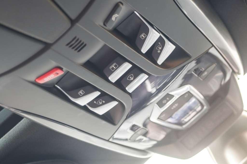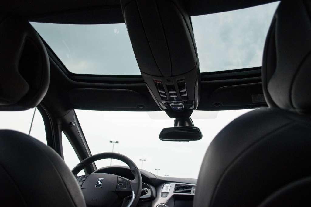 Zasiadam w wygodnym fotelu ze skóry. Podparcie boczne jest niezłe, ale daleko mu do sportowych samochodów. Odpalam silnik, przede mną wysuwa się wyświetlacz HUD. W lotnictwie ekrany te wykorzystuje się już od dawna, bo piloci myśliwców takich, jak choćby F-16, widzą na nich celownik, blokadę celu, aktualną wysokość, prędkość i inne potrzebne informacje. Przydatne, kiedy pędzisz z prędkością przekraczającą 1000 km/h. U nas informacji znacznie mniej, a celownik nadal pozostaje wyłącznie na wyposażeniu niektórych Mercedesów. Za ekran w DS5 służy przeźroczyste okienko, na które rzucany jest obraz z czegoś, co przypomina projektor. Nie odrywając oczu od drogi, zobaczymy więc prędkość, z jaką się poruszamy czy też aktualne ustawienie tempomatu. Całkiem przydatne, ale nie niezbędne – choć robi niezłe wrażenie przy wysuwaniu i chowaniu. Używanie HUD prowadzi nas do kolejnego nawiązania do samolotów, czyli przycisków umieszczonych ponad głową. Naturalnie odsłonimy w tym miejscu roletę w oknie dachowym, ale też schowamy lub wysuniemy HUD, przełączymy go w tryb noc/dzień, podwyższymy wysokość, obniżymy, a w ostateczności – wciśniemy przycisk SOS. Na szczęście nie musiałem go testować, ale pobudził moją wyobraźnię, bo przez jakiś czas zastanawiałem się, czy ten czerwony guziczek to czasem nie jakaś katapulta. Przeszklony dach został też ciekawie podzielony na trzy części – kierowca ma swoje okienko, pasażer swoje, osoby na tylnej kanapie jedno duże – też swoje. Jest to o tyle praktyczne, że każda z podróżujących DS5 osób może ustawić okno, jak jej się podoba, ale belki pomiędzy nimi zabierają trochę światła. Jeśli jednak okazało by się, że Wasz kuzyn z okolic Prypeci ma 3 metry wzrostu, to możecie spróbować po prostu wybić okno dachowe z przodu i po kłopocie. Wszyscy jadą wyprostowani, kuzynowi trochę wieje, ale chyba mu wygodnie – przynajmniej nie musi się garbić, jak dotychczas w innych samochodach.