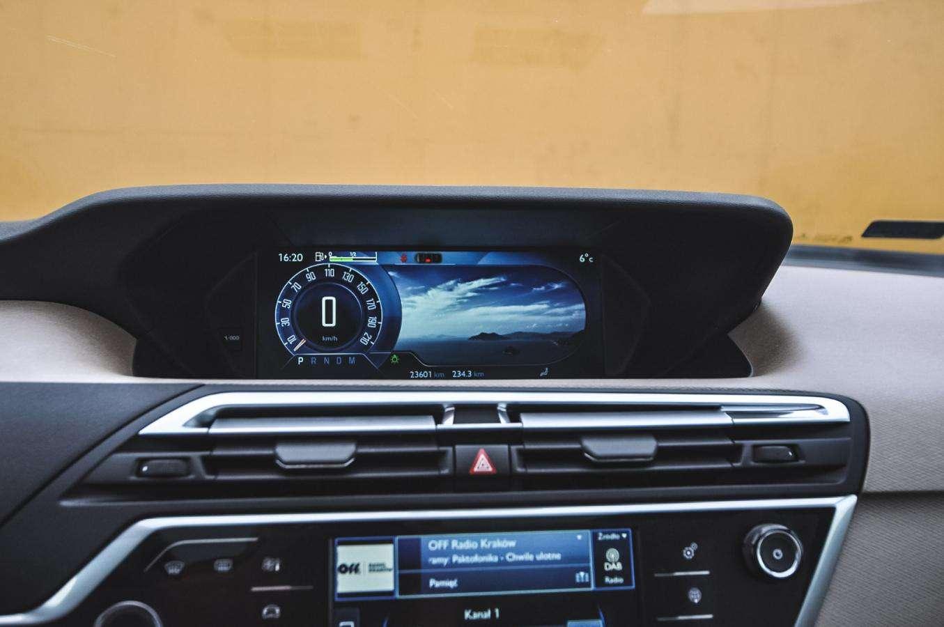 Citroen nie byłby jednak Citroenem, gdyby nie poszedł swoją drogą. Tradycyjne zegary zastąpił duży wyświetlacz, który w dodatku przesunięto na środek. Dźwignia zmiany biegów znajduje się za kierownicą i łatwo pomylić ją z włącznikiem wycieraczek. Na środku konsoli zamontowano też drugi ekran, który służy do obsługi wszystkiego - od klimatyzacji, przez radio i media, po ustawienia samochodu. Kolejna osobliwość kryje się w wyborze motywu i zestawu informacji na ekranie zastępującym zegary. Możemy ustawić jeden z trzech motywów, co wymaga ponownego uruchomienia całego systemu, ale też określić, czy chcemy widzieć dane komputera pokładowego, wskazówki nawigacji czy… zdjęcie. Dla każdego motywu jest inne. Jeździłem z takim widokiem przez większość czasu spędzonego za kierownicą Citroena Grand C4 Picasso - w końcu nigdy nie wiadomo, kiedy następnym razem będę mógł stwierdzić, że ważniejsze jest dla mnie zdjęcie zboża niż aktualne spalanie.
