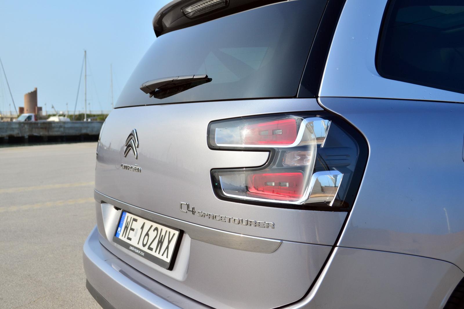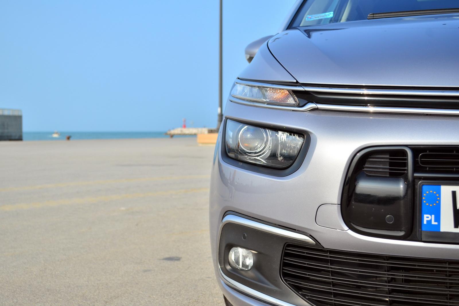 Pudełkowaty kształt nadwozia urozmaicają oryginalne lampy. Te z przodu – analogicznie do mniejszych Citroenów – mają wydzielone powyżej głównego, skrętnego reflektora światła do jazdy dziennej i tworzą z nimi ciekawą całość. Tylne natomiast, w testowanym egzemplarzu Grand C4 SpaceTourer są opcjonalnymi, w pełni LED-owymi lampami z efektem 3D.