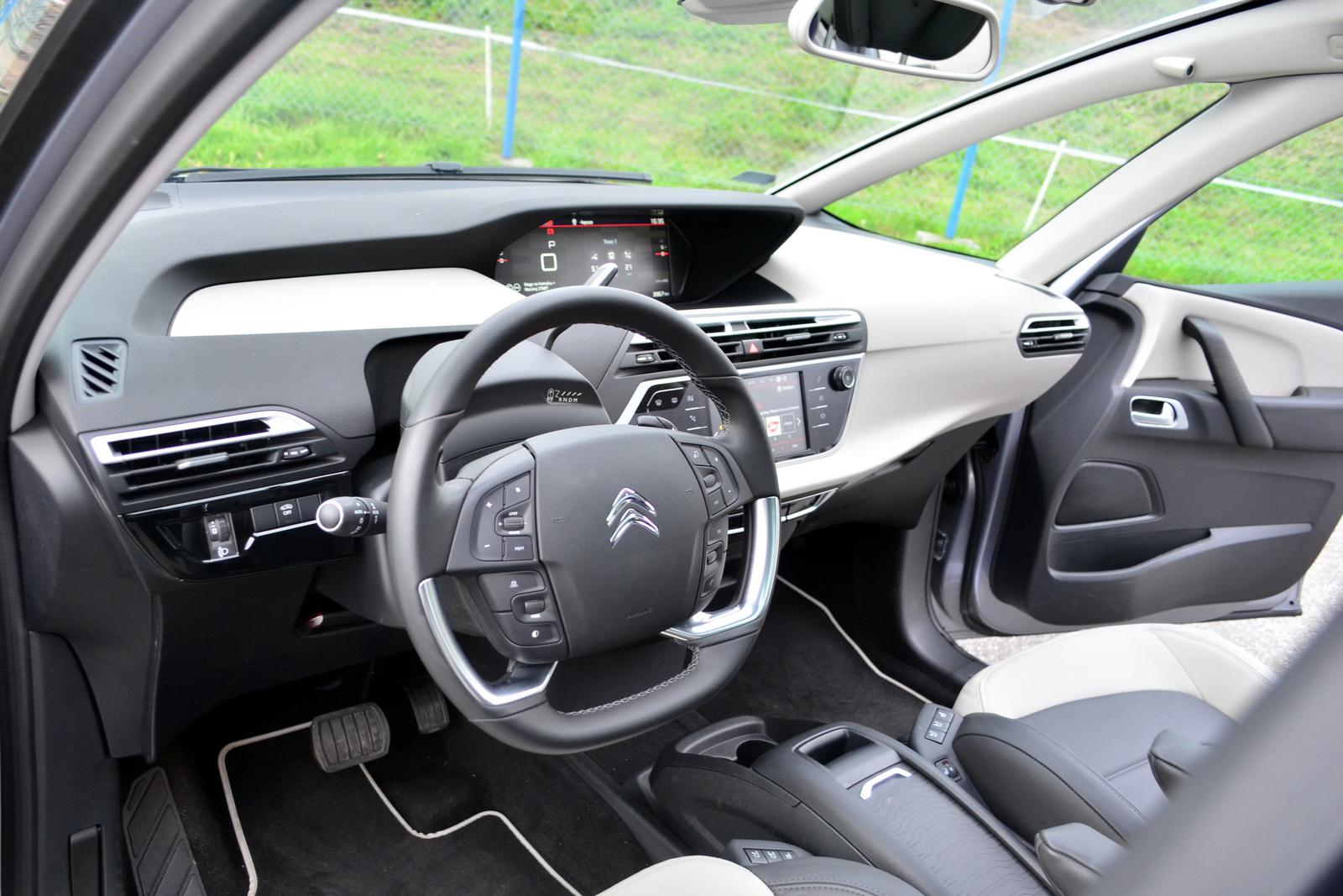 Sterowanie większością funkcji w Citroenie Grand C4 SpaceTourer możliwe jest z poziomu kierownicy. Zlokalizowano na niej liczne przełączniki – korzystanie z nich jest proste i intuicyjne. Z ich pomocą można na przykład wygasić całkowicie ekran główny i ograniczyć wyświetlacz zegarów do podstawowych funkcji – coś jak saabowski black-panel. Korzystając w nocy z tej opcji, udało mi się także zmniejszyć intensywność świecenia ekranu systemu infotainment. Po wygaszeniu wszystkiego, wystarczy bowiem przesunąć pokrętło od zmiany stacji radiowej w górę lub w dół. Powoduje to wzbudzenie głównego ekranu ze zmniejszoną intensywnością świecenia. Podobnie jak w innych autach koncernu PSA, tak w Citroenie Grand C4 SpaceTourer zabrakło osobnego panelu do sterowania klimatyzacją, a żeby zmienić jej ustawienia, trzeba wejść w odpowiednie menu, co wymaga oderwania oczu od drogi. Co ciekawe osobne, analogowe pokrętła do regulacji siły nawiewów z tyłu, znalazły się na słupkach B.