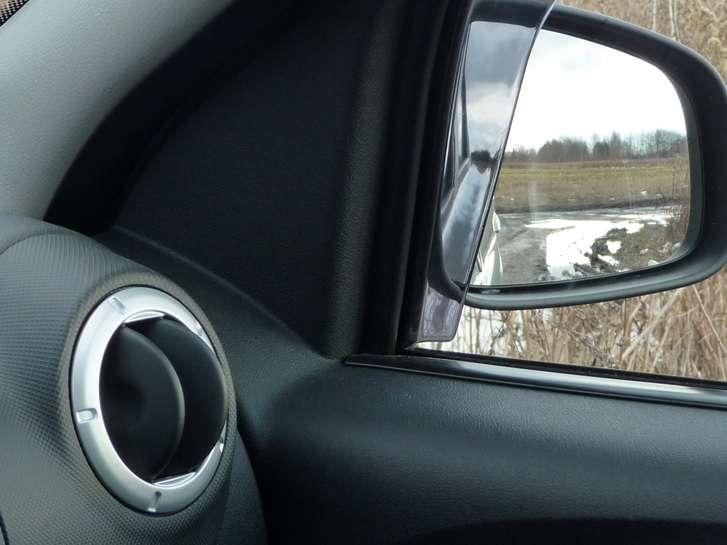 Dosyć głośno działają klamki. Wnętrze pojazdu nie zachwyca. Od razu rzucają się w oczy, tandetne, srebrne wykończenia. Zwłaszcza konsola środkowa i klamki oraz oparcia bocznych drzwi są przeraźliwe. Gdyby zastosowano zwykłe, czarne tworzywo, byłoby o wiele lepiej. Konstruktorzy zapewne chcieli urozmaicenia, albo poprawienia wyglądu, a uzyskali, niestety efekt odwrotny. Sama konsola środkowa jest dziwnie pochylona, w odwrotnym niż do tego jesteśmy przyzwyczajeni, kierunku. Zamiast do góry, w dół. To utrudnia ustawianie nawiewu i temperatury. Ten mankament występuje od samego początku tego modelu i dziwne, że nie zostało to dotychczas zmienione. Kierownica jest wykonana z miłego w dotyku tworzywa, a wskaźniki czytelne. Nie ma regulacji podświetlenia tablicy rozdzielczej, ale podczas jazdy nocą nie jest ono dokuczliwe. Przyciski i pokrętła są proste i przypominają tanie artykuły „Made in China" kupowane na bazarze. O siedzeniach można napisać tyle, że są poprawne. Zagłówki wydają się być zbyt daleko i na pewno nie można oprzeć o nie głowy podczas jazdy. Oby spełniły swoją rolę przy ewentualnej kolizji. Lusterka zewnętrzne są trochę za małe. Mogłyby być bardziej podłużne i dawać większe pole widzenia. Podobnie rzecz ma się z lusterkiem wewnętrznym, które jest niewielkie i na pewno nie poprawia widoku do tyłu. Testowany przez nas egzemplarz był dodatkowo wyposażony w owiewki szyb bocznych, co jeszcze bardziej ograniczało widok w prawym lusterku zewnętrznym. Ponadto srebrne obwódki nawiewów nieprzyjemnie odbijają się w szybach i także zakłócają widok z bocznych lusterek. Ale lusterka te są, wraz z przednimi szybami bocznymi regulowane elektrycznie, co w tej klasie aut nie jest standardem. Zakładając, że jest to przede wszystkim samochód miejski, można stwierdzić, że bagażnik jest wystarczający do pomieszczenia nawet sporych zakupów lub 2-3 niewielkich toreb podróżnych. To samo założenie muszą przyjąć osoby o wzroście 180 i więcej cm., ponieważ na tylnych siedzeniach będą mieli ogromne kłopoty ze zmieszczeniem nóg. Tam jest raczej miejsce dla dzieci lub niskich osób.