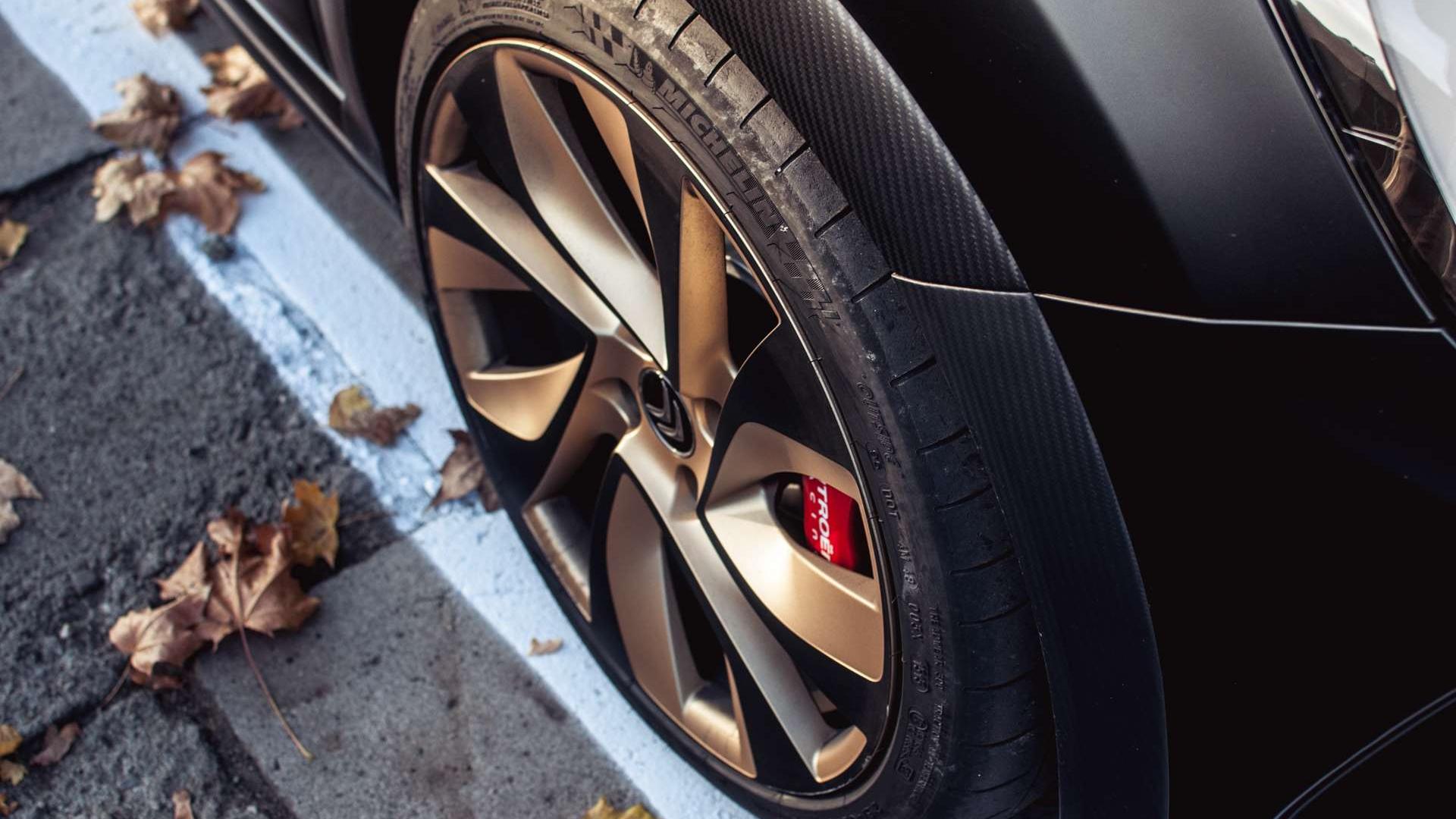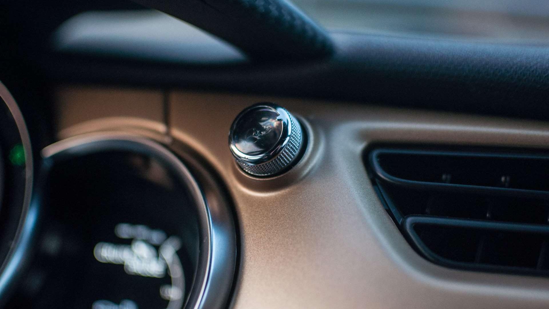 Spójrzmy więc na wnętrze z dalszej perspektywy. Jest sportowo przyciasne, ale za to bardzo ciekawe. Połączenie czerni, karbonu i złotego lakieru wypada naprawdę fajnie. Kierownica wolna jest od jakichkolwiek przycisków i służy tylko do ustalania toru jazdy. Naklejka po stronie pasażera zaczęła się niestety odklejać - ciężko stwierdzić czy samoistnie, czy ktoś jej w tym pomagał. Obstawiałbym opcję drugą.