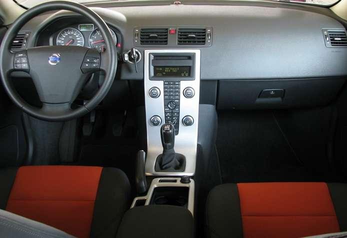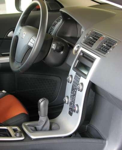 Z przodu mamy bardziej tradycyjne Volvo. Dotyczy to zarówno karoserii, jak i wnętrza. Zza kierownicy odniosłem w pierwszej chwili wrażenie, że siedzę w sedanie S40. Kierowca ma przed sobą zwartą tablicę rozdzielczą z okrągłymi zegarami obrotomierza i prędkościomierza, osadzonymi w metalowych obręczach. Prosta i dość surowa jest także deska rozdzielcza, przecięta aluminiowym językiem prostokątnej centralnej konsoli. Aluminiowy pasek konsoli wywija się na tunelu, gdzie obejmuje także miejsce drążka zmiany biegów. W kabinie C30 nie ma malowanych na srebrno plastyków – to co wygląda na aluminium rzeczywiście nim jest. Nie znalazłem więc zadrapań czy pęknięć, ale któryś z moich poprzedników uderzył czymś w klamkę i zostało wgniecenie.