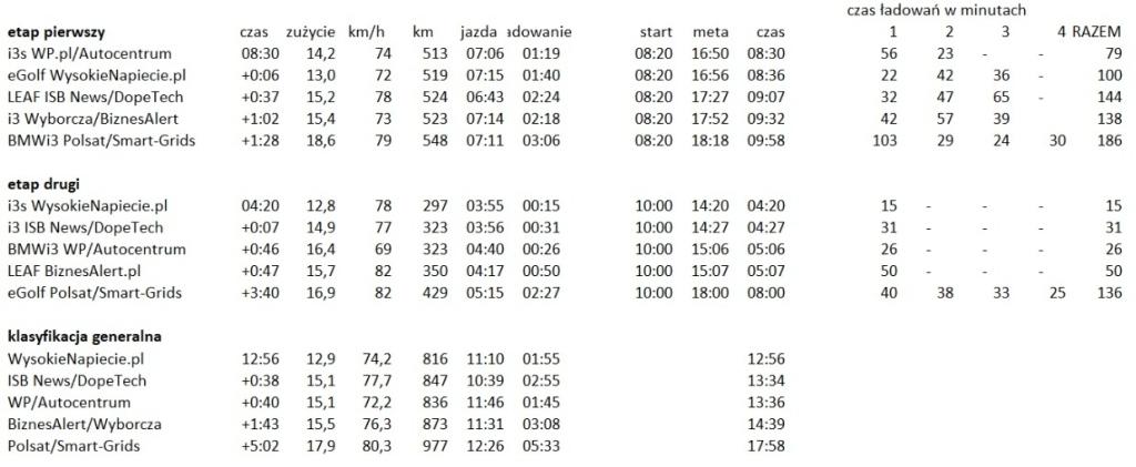 Po podliczeniu czasów okazało się, że nasza załoga pierwszy etap pokonała z najszybszym czasem, uzyskując przewagę 6 minut nad załogą organizatora. Na czas dojazdu – oprócz wyboru drogi i czasu ładowania – miało wpływ kilka innych czynników. Raz, że kolejki na stacjach oznaczały, że pierwszy się ładował, a kolejni czekali, ale jeszcze pojawiło się kilka pechowych sytuacji. A to ślimak zagnieździł się we wtyczce ładowarki i zatrzymał przepływ prądu, a to ktoś nie włączył ładowania po podpięciu wtyczki, a to któraś ładowarka prądu stałego okazała się zepsuta i można było korzystać tylko z wolniejszej wersji na prąd zmienny.