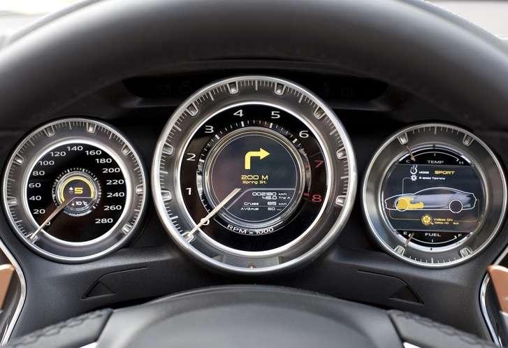 Przed kierowcą jest gruba, sportowa kierownica o spłaszczonym dole i wielofunkcyjnych przyciskach. Za nią widać trzy okrągłe zegary. Pośrodku umieszczono duży analogiczny obrotomierz, a w centrum jest ciekłokrystaliczny wyświetlacz, pokazujący m.in. wskazania nawigacji. Po lewej mniejszy, analogowy prędkościomierz z małym wyświetlaczem pokazującym na jakim biegu powinien aktualnie jechać kierowca. Po prawej natomiast znajduje się wyświetlacz interfejsu użytkownika HMI z informacjami o pracy poszczególnych elementów samochodu. Można wybrać trzy tryby pracy interfejsu HMI – Business, Sport i Pleasure, czyli przyjemność. Pierwszy z nich pozwala na stały kontakt z zaplanowanymi zadaniami i zajęciami. W drugim zawieszenie staje się bardziej przygotowane do dynamicznej jazdy, a ilość docierających do kierowcy informacji jest ograniczona do tego, co jest potrzebne w czasie sportowej jazdy. W trybie Pleasure podstawą jest komfort jazdy i rozrywka.