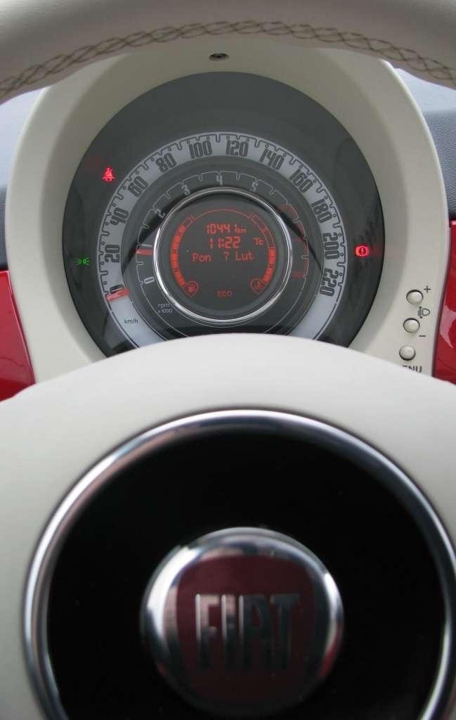 Poza nowym silnikiem Fiat 500 oferował to co już dobrze znam – atrakcyjną stylistykę retro, w bardzo przemyślanym i dopracowanym wydaniu. Nadwozie samochodu było dwukolorowe: biało - czerwone. Karoseria w narodowych barwach miała oczywiście podkreślać bardzo polski charakter samochodu, z drugiej strony podkreślała stylizację nadwozia na lata 50. We wnętrzu kolorystykę i stylizację utrzymano, tyle że zamiast bieli w górnej części tapicerki jest beż. Prosta deska rozdzielcza z pasem blachy w kolorze nadwozia i umieszczone w miejscu centralnej konsoli zwarte panele radia i klimatyzacji to kolejny element stylu retro. Utrzymuje się w nim także tablica rozdzielcza, ale tu wyraźnie widać że to stylizowana nowoczesność. Tablica ma formę pojedynczej, okrągłej tarczy, ale na jej obrzeżach są podwójne kręgi liczb – zewnętrzny to prędkościomierz, a wewnętrzny podaje wskazania obrotomierza. Po okręgach poruszają się analogowe wskazówki, ale widać tylko ich końcówki, bo centrum to okrągły wyświetlacz podający cyfrowo stan paliwa i temperaturę silnika oraz wskazania komputera pokładowego i strzałki układu podpowiadającego najlepszy moment zmiany biegu.
