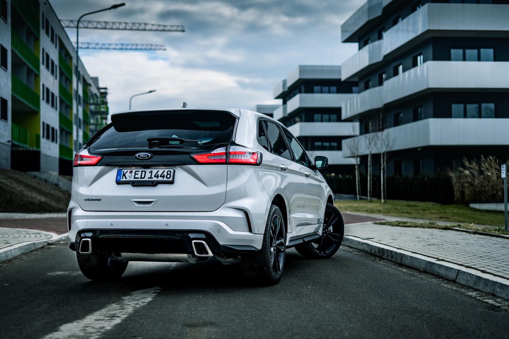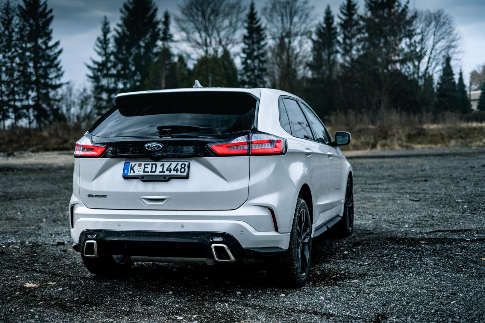 Testowaliśmy nowego Forda Edge w wersji ST-Line, która wyróżnia się przede wszystkim dużymi kołami i tylnym zderzakiem z dość nietypowymi, rozciągniętymi w poziomie końcówkami układu wydechowego. Oczywiście pod nimi znajdują się mniejsze, prawdziwe rury.