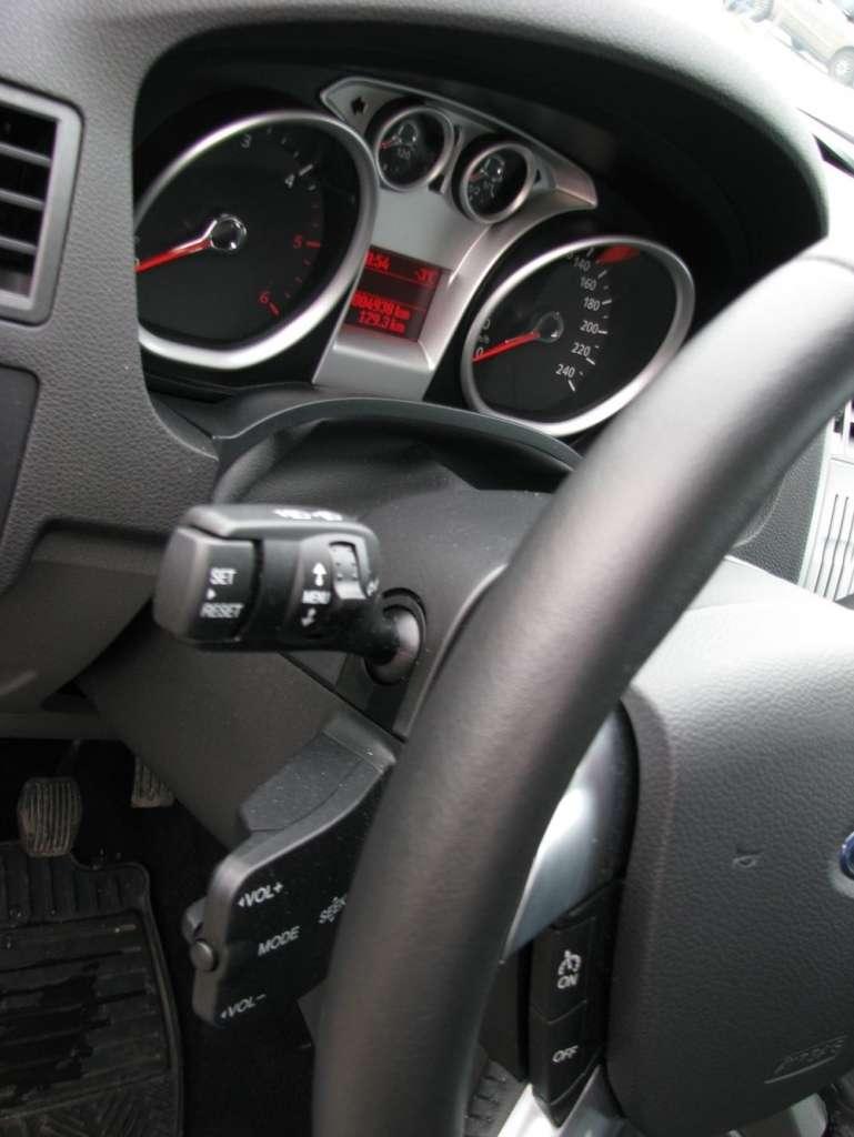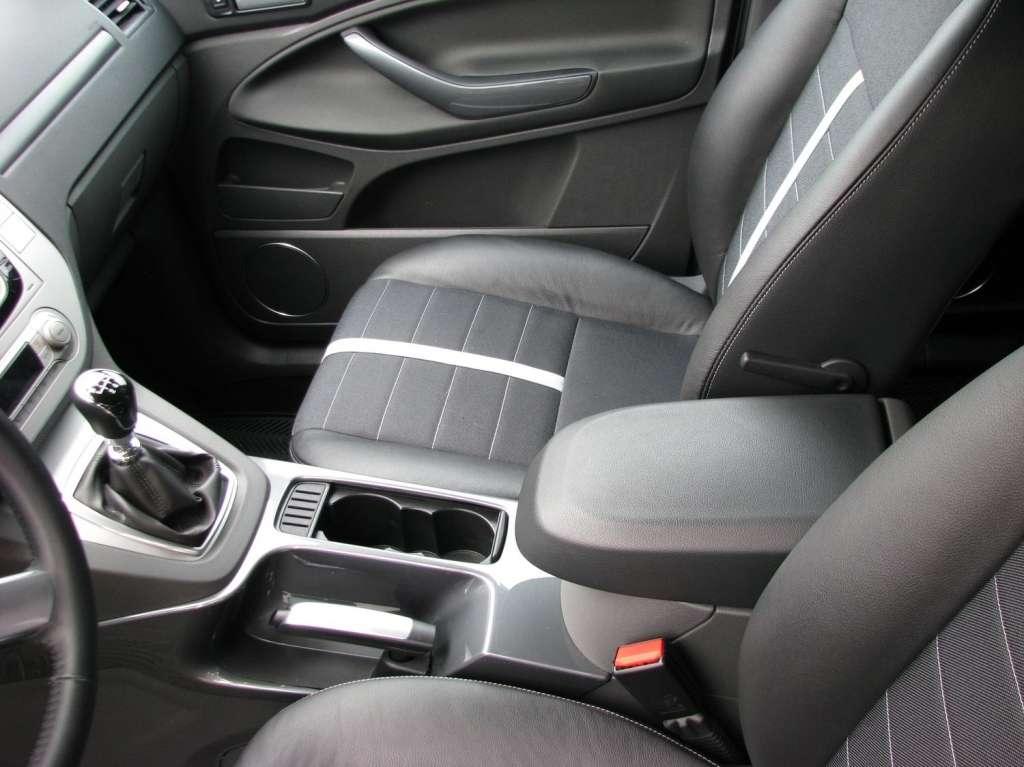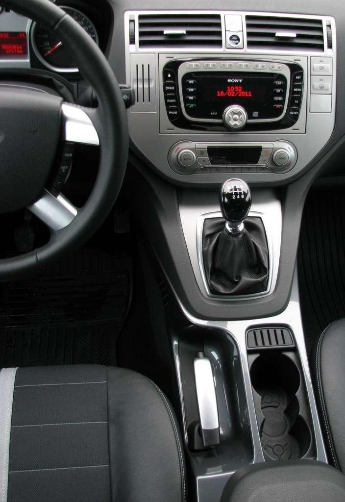 We wnętrzu akcent chyba bardziej przesunięty w stronę klasyki. Deska rozdzielcza jest dość prosta i przejrzysta, ale brak trochę podobnie ciekawych i wyrazistych detali, jak na karoserii. Duży i kanciasty, malowany na srebrno panel centralnej konsoli wydaje mi się zbyt przytłaczający. Radio i sterowanie klimatyzacją są wyraźne i czytelne, niemal intuicyjne w obsłudze. Niewielki przycisk z napisem Ford między wlotami powietrza w górnej części konsoli służy do włączania i wyłączania silnika. Nad konsolą jest wąska półka. Na tunelu między fotelami mamy dwa uchwyty na kubki, a w podłokietniku spory schowek. Podwójne kieszenie są na drzwiach – nad dość wąskimi kieszeniami w dole tapicerki są jeszcze małe półki nieco wyżej.