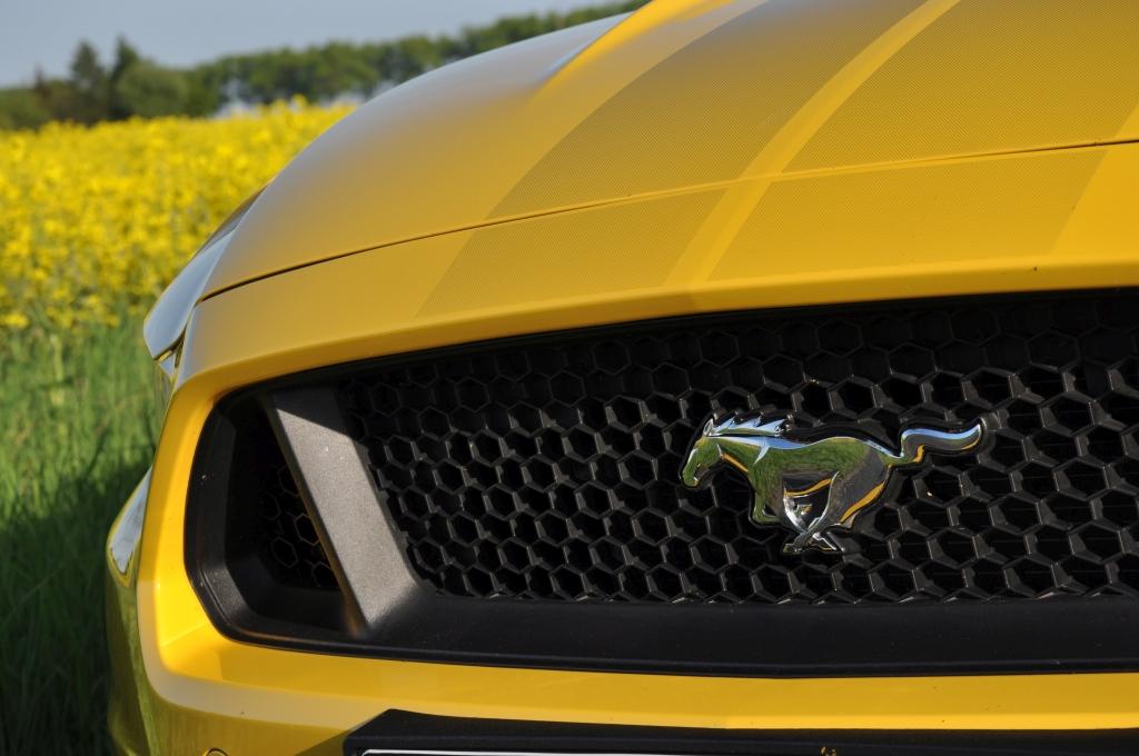 Gdybym był głuchy jak pień, mógłbym wybrać wersję EcoBoost z czterocylindrowym silnikiem o niskim spalaniu, bla, bla, bla… Ale nie jestem, więc silnik o nijakim brzmieniu niech pozostanie jedynie pozycją cennikową, pomagającą Fordowi w utrzymaniu rygoru CO2. Po wciśnięciu przycisku uruchamiającego serce modelu GT (421 KM), spod żółtego płaskowyżu, przeciętego czarnymi pasami, wydobywa się basowy bulgot. W architekturze istnieje coś takiego jak złoty podział, czyli proporcje 5/8. Słuchając pięciolitrowej V-ósemki, dochodzę do wniosku, że ma to też przełożenie na motoryzację.
