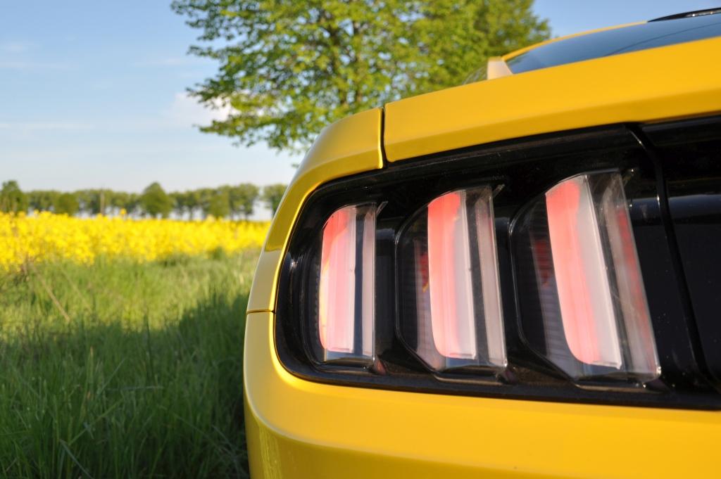 Przede mną stoi wściekle żółte coupe z absurdalnie wielkimi kołami na tylnej osi i niewiele mniejszymi z przodu. To nawiązanie do klasycznego tuningu amerykańskiego oraz do aut budowanych do startów w wyścigach równoległych. Maska sięga po horyzont, z dwoma przetłoczeniami prowadzącymi przez całą jej długość niczym tory kolejowe przez prerię. Sylwetka nawiązuje do Fastbacka z 1967 roku, o czym świadczy pas przedni z przymrużonymi lampami, w jakiś sposób przywodzącymi na myśl rekina, wyciągnięta sylwetka i potrójne pionowe tylne lampy. Totalna klasyka w nowoczesnym wykonaniu. Tego Mustanga Ford nie będzie musiał się wstydzić, jak to miało miejsce z drugą generacją, skrzętnie pomijaną milczeniem w pełnej narodowej dumy historii modelu, która - na marginesie - była najlepiej sprzedającą się w historii rączego rumaka.