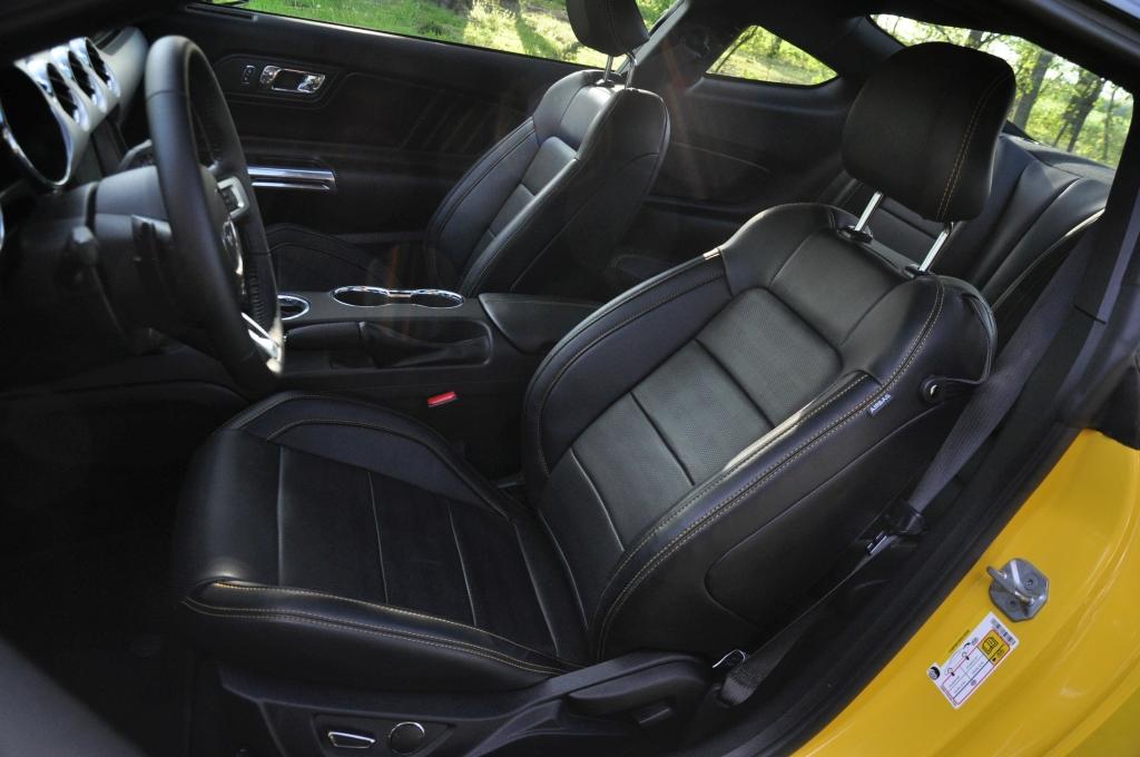 Siedzenia to też typowa Ameryka. Ich kształt wskazuje, że w ojczyźnie uchodzą za kubełkowe, dla nas to dobrze wyprofilowane, ale niezwykle miękkie i wygodne fotele o sportowym wyglądzie, w rzeczywistości bardziej nadają się na przemierzanie Stanów resztkami poszatkowanej starej Route 66 niż do czegokolwiek związanego z szeroko pojętym sportem motorowym. Pokrywająca je skóra także nie zawodzi, jest dość twarda i widać, że Ford nabył ją w promocji i to zdecydowanie nie z masy upadłościowej Connolly'ego. Jeśli czujemy potrzebę przyozdabiania Mustanga „sportowymi” akcesoriami, w opcji dostępne są sportowe fotele Recaro.