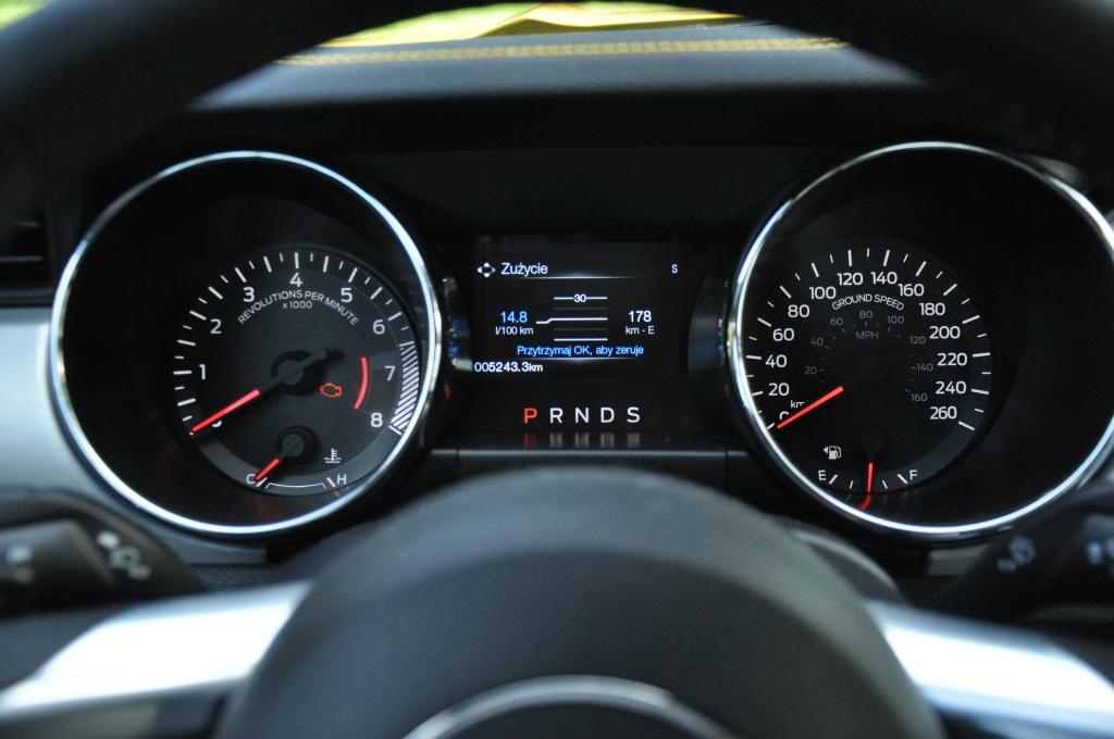 Wnikliwe przejrzenie zdjęć w galerii powoduje dostrzeżenie pewnej anomalii. Tak, testowy Ford przekazuje moc na tylną oś poprzez automatyczną sześciobiegową skrzynię. Nie, nie jest to żaden wstyd, ani wada. Po pierwsze wrażenia zza kierownicy są i tak piorunujące, po drugie Mustang GT nie jest maszyną do bicia rekordów i nie jest w stanie pokonać niemieckich maszyn o podobnej mocy, po trzecie osiągi są identyczne, a spalanie… niższe. Nic więc dziwnego, że w Europie większość klientów Mustanga wybiera właśnie automat.