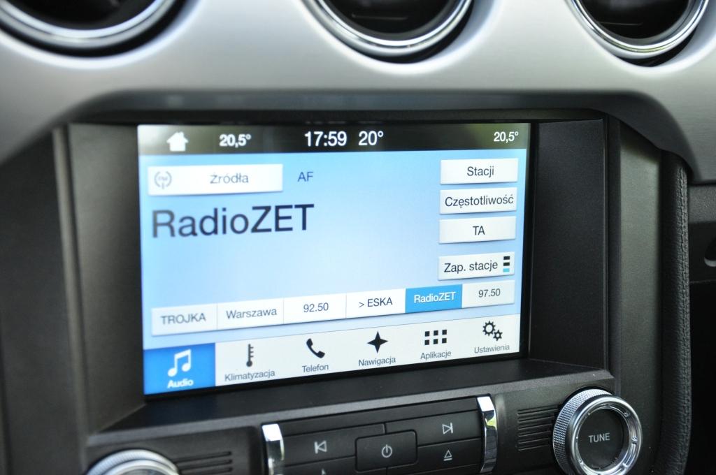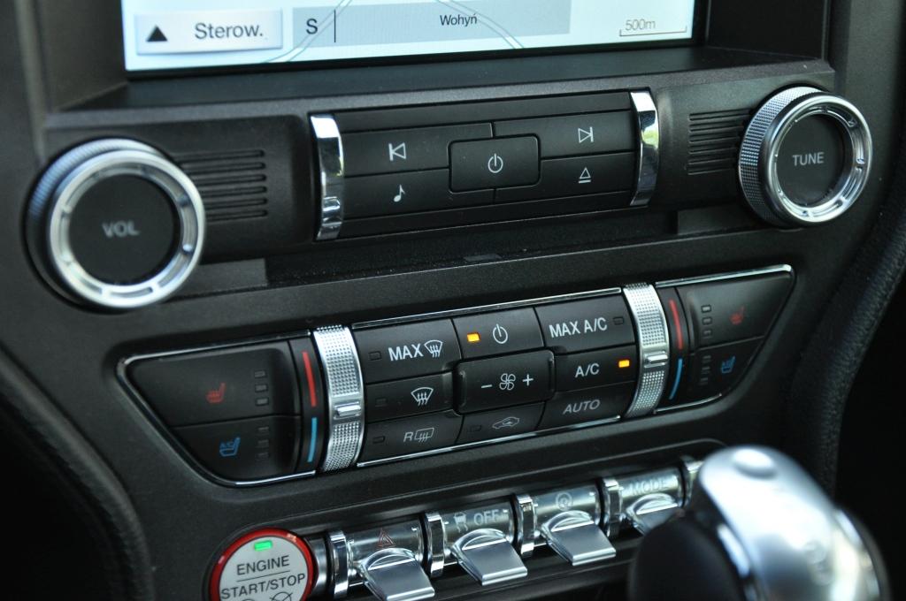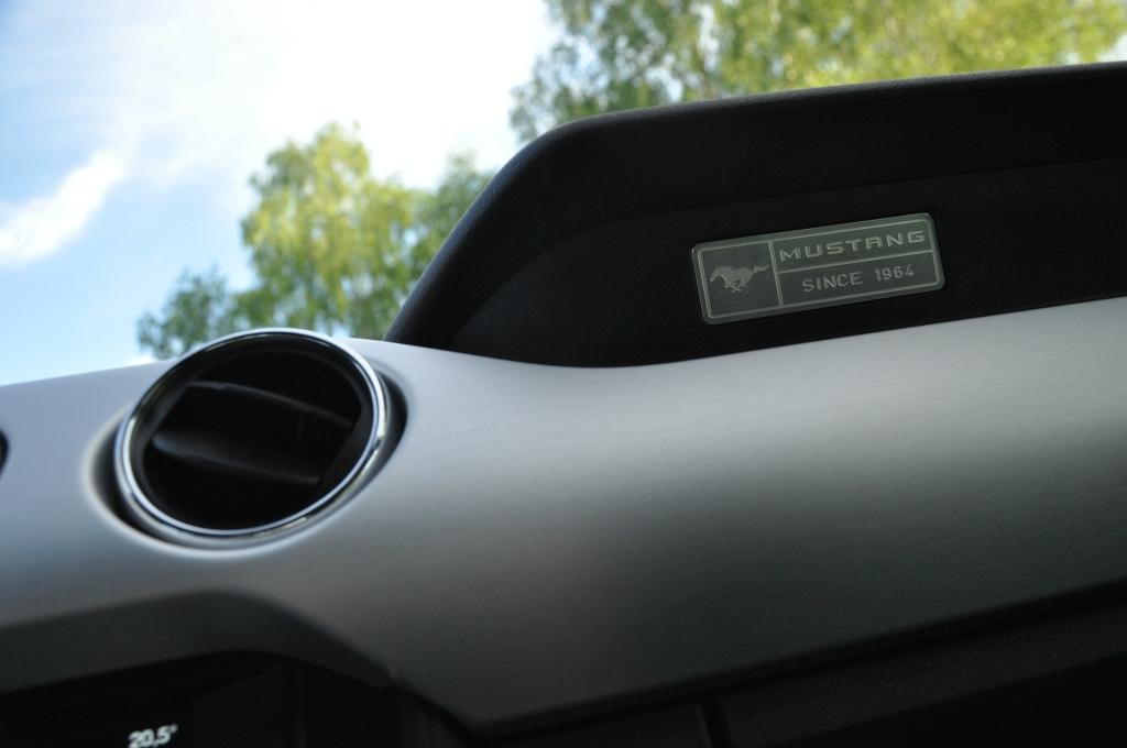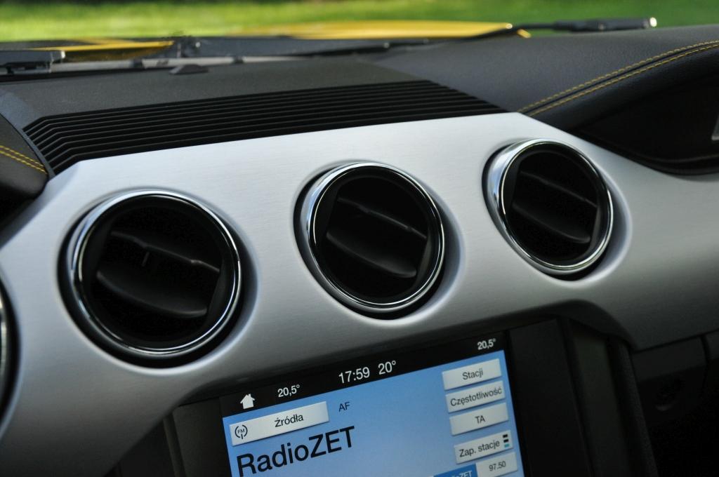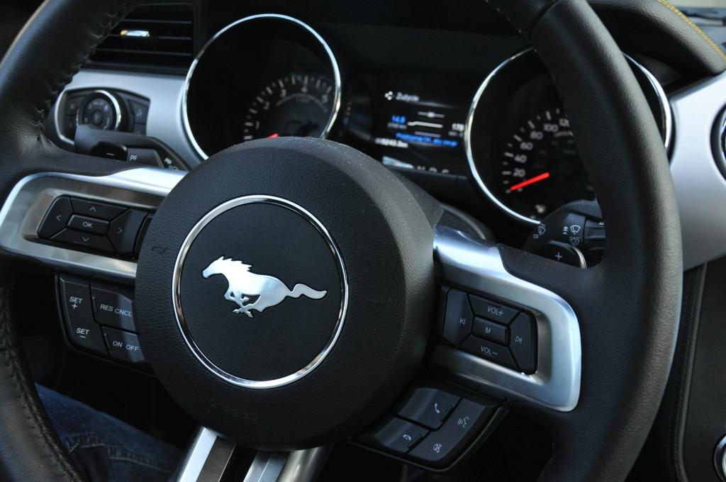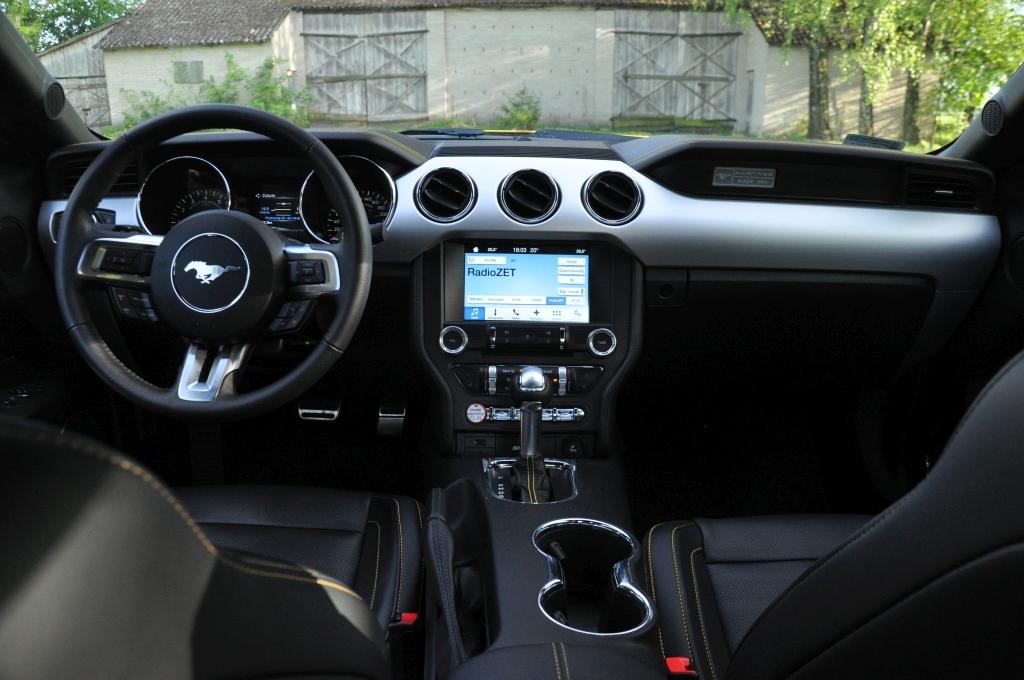 Wnętrze jest całkowitym zaskoczeniem. Na tle poprzedniej generacji to niemal przepaść. Materiały są w pełni akceptowalne po tej stronie wielkiej wody, a jednocześnie zachowały klimat typowy dla dzikiego zachodu. Dwa duże wybrzuszenia deski rozdzielczej to oczywisty ukłon w stronę pierwszej generacji, o czym dodatkowo przypomina plakietka wyraźnie mówiąca, że Mustang galopuje już od 1964 roku. Spojrzeniem w przeszłość są też umieszczone nisko za lewarkiem skrzyni biegów przełączniki w starym stylu. W pewnym momencie dziejów motoryzacji zrezygnowano z wystających pstryczków ze względów bezpieczeństwa, teraz sentyment każe inżynierom szukać sposobów, by można je było na powrót zaimplementować, tyle że w bezpieczny sposób. Zaskakująca jest też listwa ozdobna przecinająca całą deskę rozdzielczą. Na pierwszy rzut oka wygląda na aluminiową, ale jak przystało na samochód produkowany po kosztach to tylko doskonale udające lekki stop tworzywo sztuczne. Bardziej w stylu Detroit już nie można.