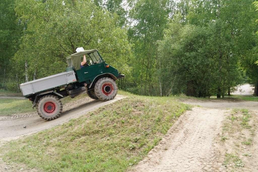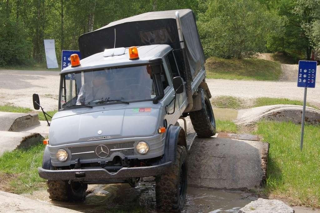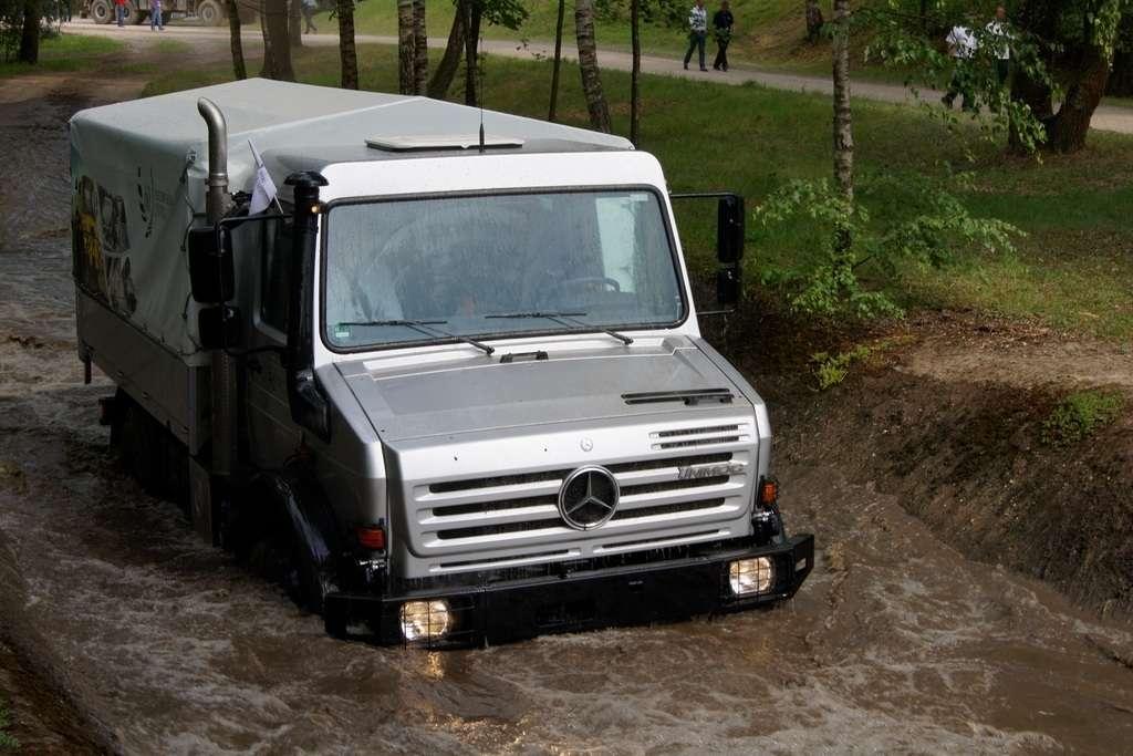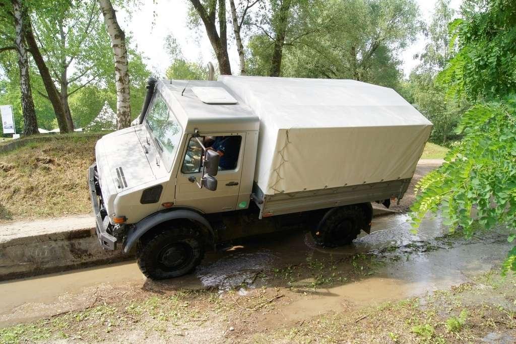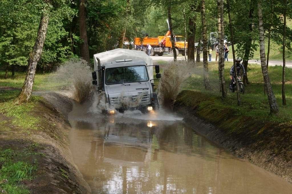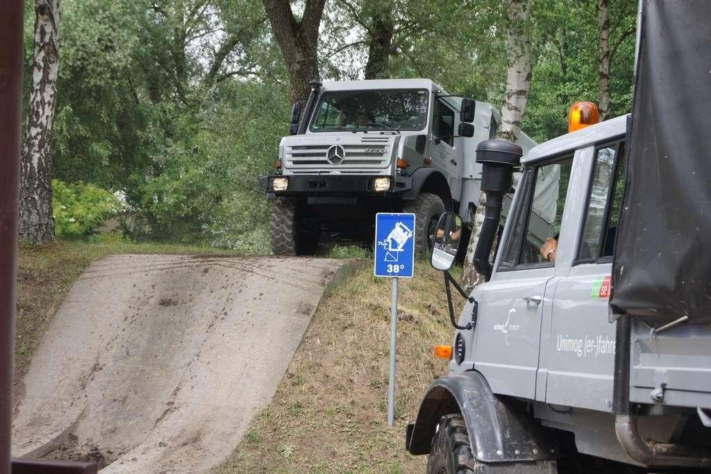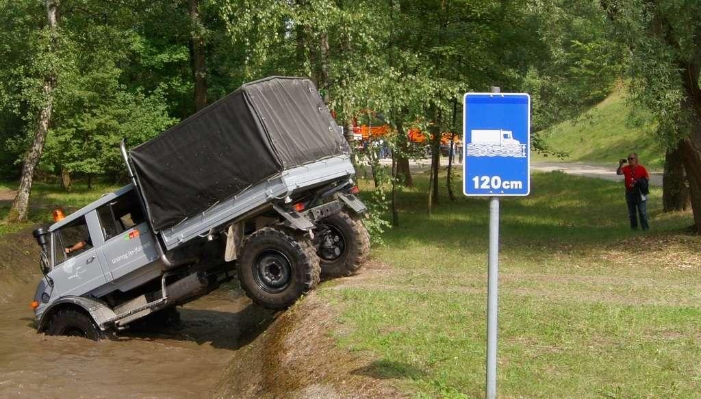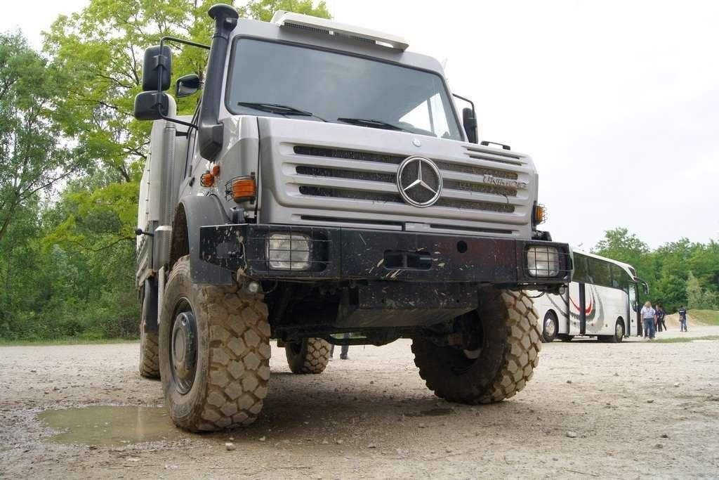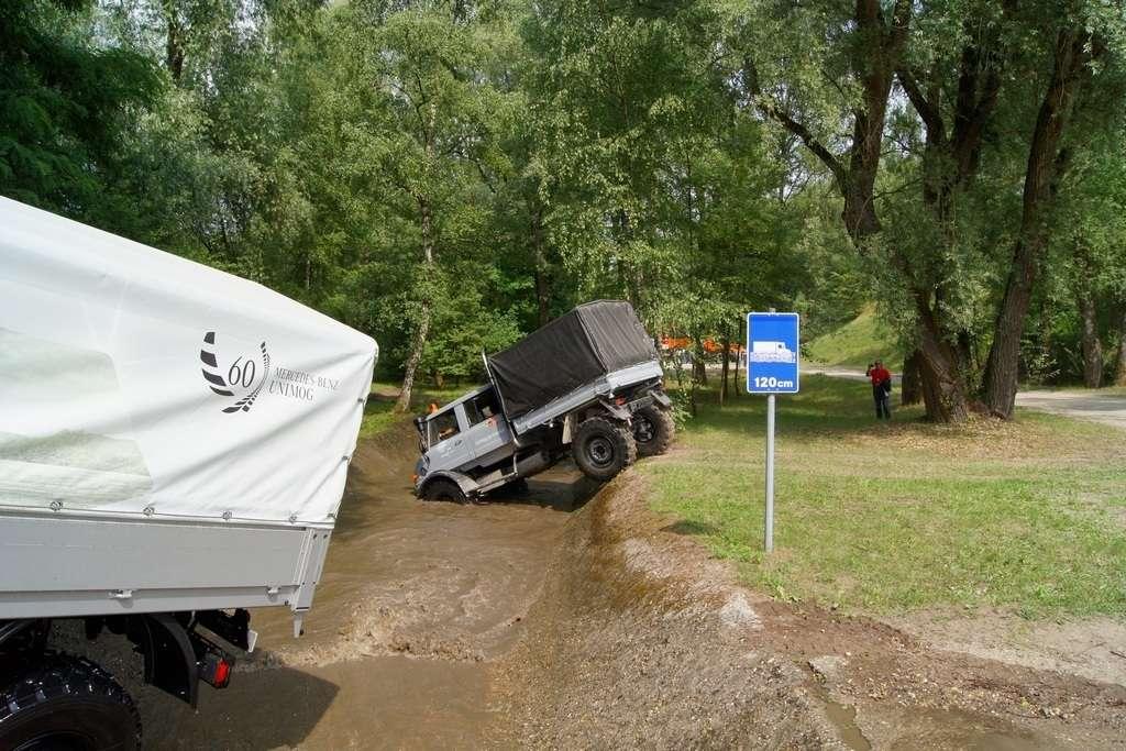 Tak jak poprzednio do modelu przypisany był opiekun i jak poprzednio spytałem czy mogę jechać tym modelem. Po sprawdzeniu kategorii prawa jazdy na wersje ciężarowe spytano mnie, czy kiedykolwiek jechałem Unimogiem i po mojej odpowiedzi, że nie, usłyszałem … to chyba będzie problem. Nie przejmując się tym wsiadłem do samochodu i … faktycznie był problem. Pierwsze co rzuciło mi się w oczy to brak klasycznej dźwigni zmiany biegów, ale mały walec, który idealnie pasował do położonej na nim dłoni. To właśnie nim wybieraliśmy przełożenie. Zważywszy zaś, że pojazd miał osiem biegów, a dodatkowo osiem „roboczych”, sam zrezygnowałem z jazdy wiedząc, że będzie lepiej dla mnie i dla samochodu, jak będę jechał obok kierowcy. Przesiedliśmy się i kierowca ruszył z miejsca tłumacząc mi wszystkie tajemnice modelu. Dźwignia faktycznie służy do wyboru przełożenia, a jeżeli chcemy włączyć „biegi robocze”, czyli załączyć reduktor, należy nacisnąć dodatkowy przycisk po lewej stronie kierownicy. Dodatkowe przyciski dotyczyły załączenia napędu na wszystkie osie i blokady obu osi, oraz pompowania kół (zmiana ciśnienia od 1,5 do 6 atmosfer zapewnia przyczepność w grząskim terenie i przejazd przez skaliste drogi). Po zablokowaniu mechanizmów różnicowych i włączeniu biegów terenowych na „szóstym biegu” (!!!) wyjechaliśmy pod wzniesienie o nachyleniu 80%. Jak wytłumaczono mi jedziemy samochodem nieobciążonym, więc nie ma sensu używać niższych biegów. Kolejnym etapem przejazdu był rów z wodą o głębokości 120 cm. Wjechaliśmy do niego z całym impetem (zalewając całkowicie przednią szybę), a dopiero dalej jechaliśmy spokojnie. Jednak nie dane mi było dojechać do końca fosy pełnej wody. W pewnym momencie kierowca stwierdził, że wyjedzie na bok i pod brzeg o nachyleniu na który nie odważyłbym się ustawiać samochodu, bez najmniejszych problemów wyjechał. Potem jeszcze był przejazd pod prawie pionowe wniesienie o wysokości ok. 250 cm (nachylenie 110 % i kąt natarcia 38 stopni), przejazd przy nachyleniu bocznym 38 stopni oraz po wgłębieniach na drodze, co miało sugerować wykrzyżowanie osi.