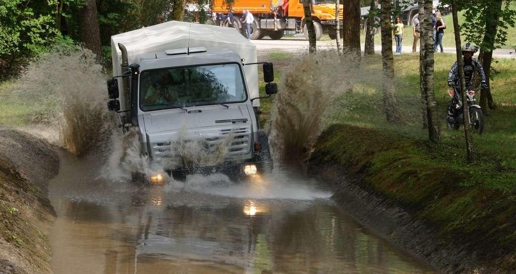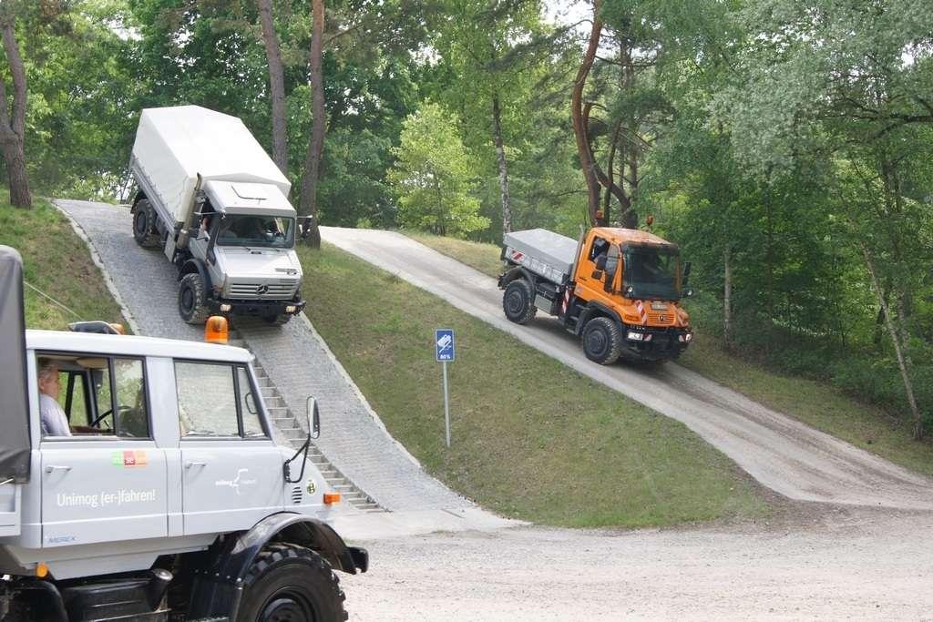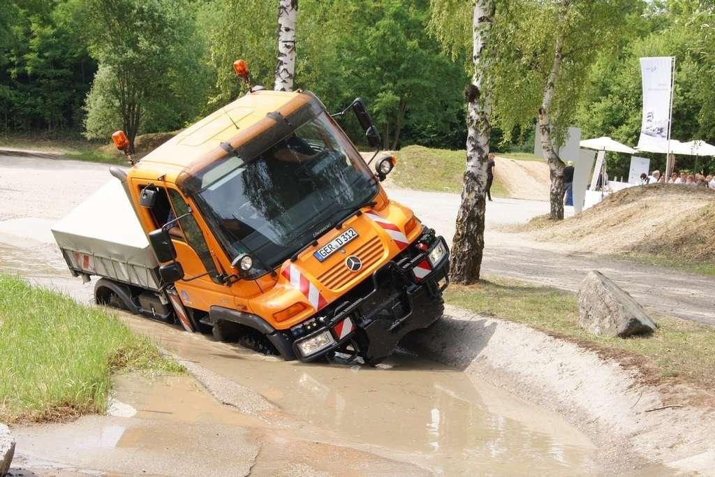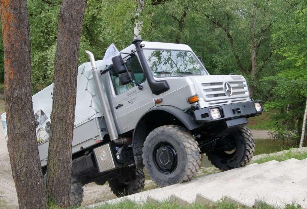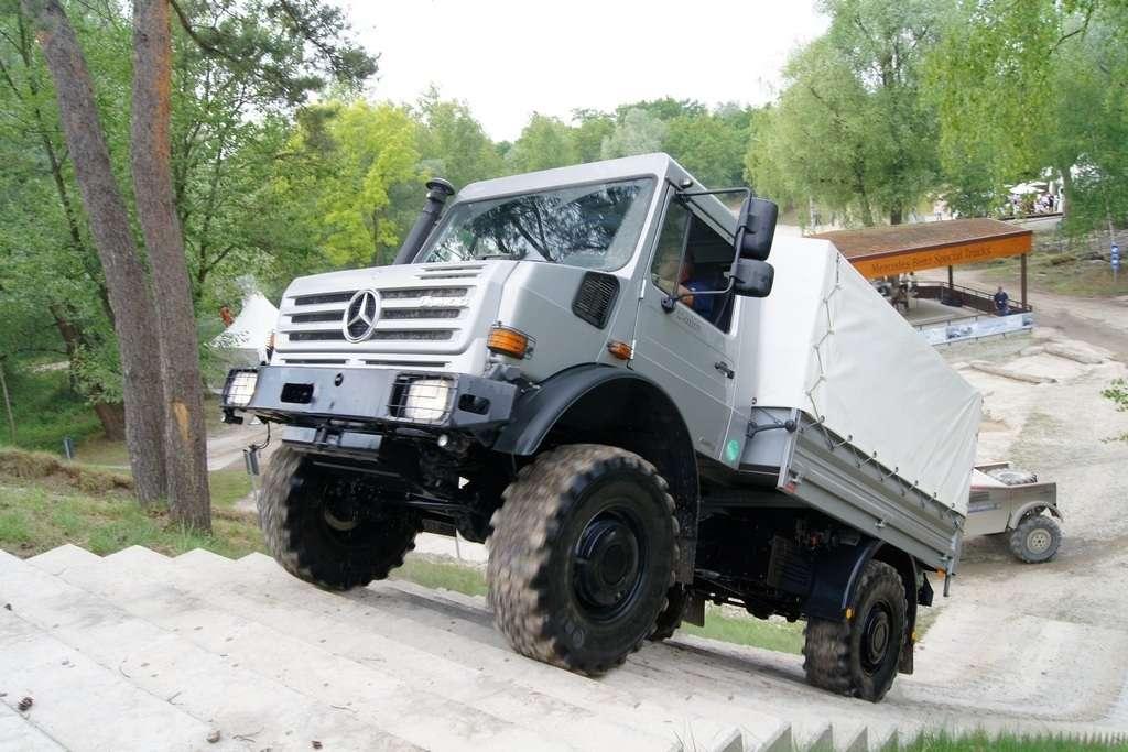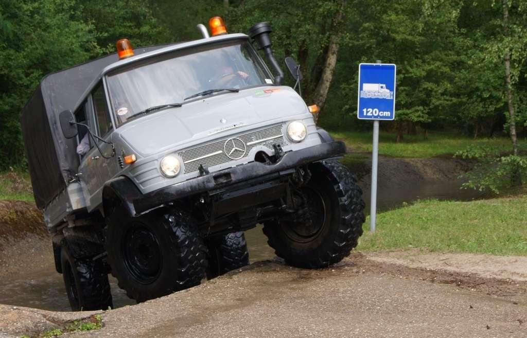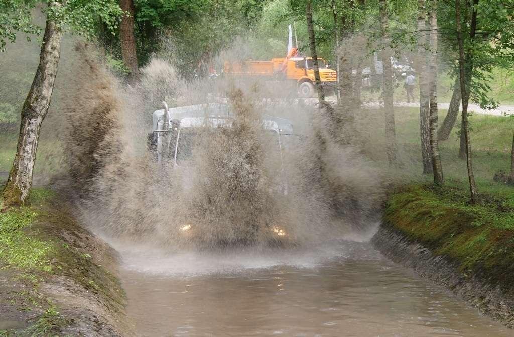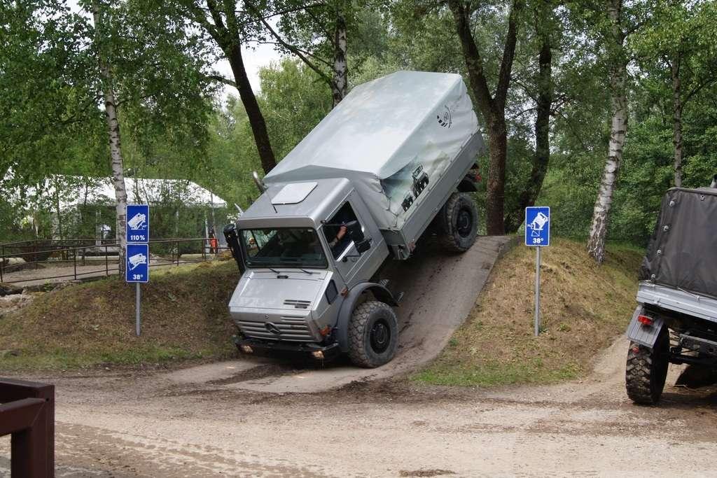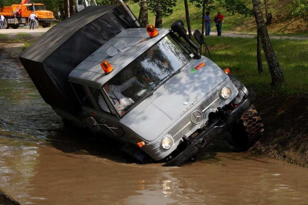 Tak jak poprzednio do modelu przypisany był opiekun i jak poprzednio spytałem czy mogę jechać tym modelem. Po sprawdzeniu kategorii prawa jazdy na wersje ciężarowe spytano mnie, czy kiedykolwiek jechałem Unimogiem i po mojej odpowiedzi, że nie, usłyszałem … to chyba będzie problem. Nie przejmując się tym wsiadłem do samochodu i … faktycznie był problem. Pierwsze co rzuciło mi się w oczy to brak klasycznej dźwigni zmiany biegów, ale mały walec, który idealnie pasował do położonej na nim dłoni. To właśnie nim wybieraliśmy przełożenie. Zważywszy zaś, że pojazd miał osiem biegów, a dodatkowo osiem „roboczych”, sam zrezygnowałem z jazdy wiedząc, że będzie lepiej dla mnie i dla samochodu, jak będę jechał obok kierowcy. Przesiedliśmy się i kierowca ruszył z miejsca tłumacząc mi wszystkie tajemnice modelu. Dźwignia faktycznie służy do wyboru przełożenia, a jeżeli chcemy włączyć „biegi robocze”, czyli załączyć reduktor, należy nacisnąć dodatkowy przycisk po lewej stronie kierownicy. Dodatkowe przyciski dotyczyły załączenia napędu na wszystkie osie i blokady obu osi, oraz pompowania kół (zmiana ciśnienia od 1,5 do 6 atmosfer zapewnia przyczepność w grząskim terenie i przejazd przez skaliste drogi). Po zablokowaniu mechanizmów różnicowych i włączeniu biegów terenowych na „szóstym biegu” (!!!) wyjechaliśmy pod wzniesienie o nachyleniu 80%. Jak wytłumaczono mi jedziemy samochodem nieobciążonym, więc nie ma sensu używać niższych biegów. Kolejnym etapem przejazdu był rów z wodą o głębokości 120 cm. Wjechaliśmy do niego z całym impetem (zalewając całkowicie przednią szybę), a dopiero dalej jechaliśmy spokojnie. Jednak nie dane mi było dojechać do końca fosy pełnej wody. W pewnym momencie kierowca stwierdził, że wyjedzie na bok i pod brzeg o nachyleniu na który nie odważyłbym się ustawiać samochodu, bez najmniejszych problemów wyjechał. Potem jeszcze był przejazd pod prawie pionowe wniesienie o wysokości ok. 250 cm (nachylenie 110 % i kąt natarcia 38 stopni), przejazd przy nachyleniu bocznym 38 stopni oraz po wgłębieniach na drodze, co miało sugerować wykrzyżowanie osi.
