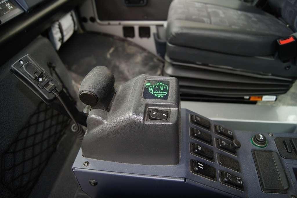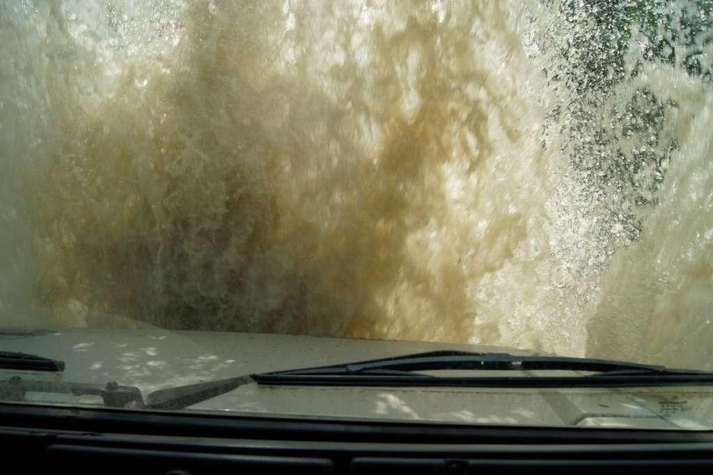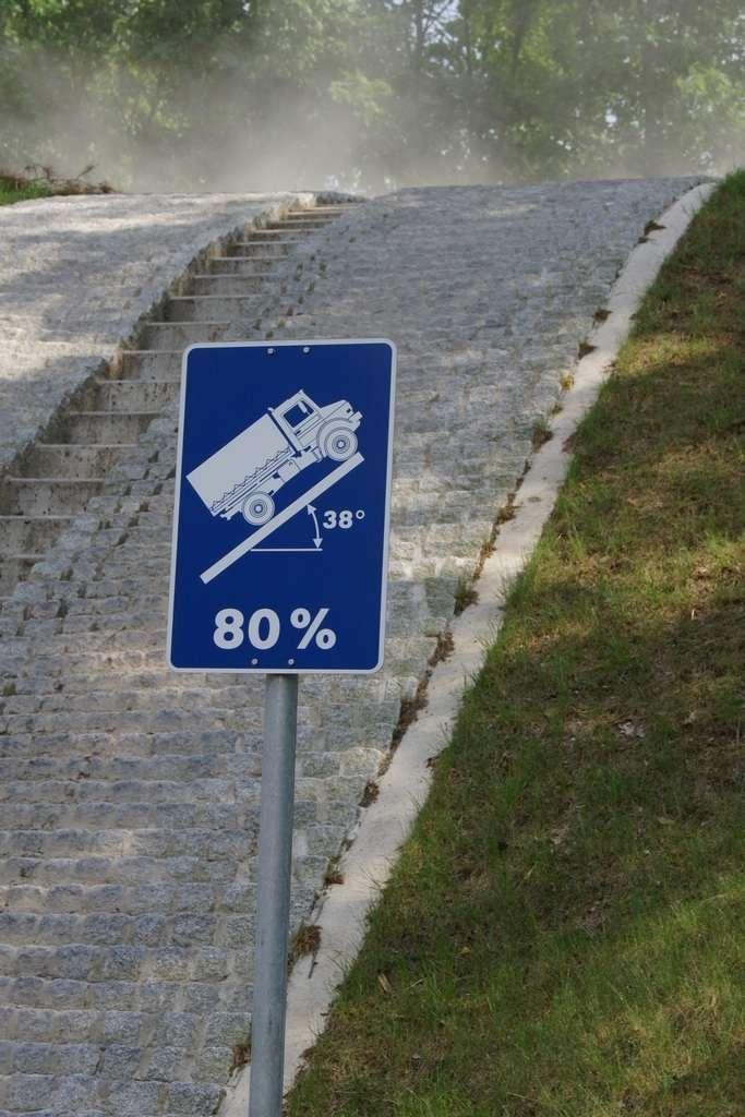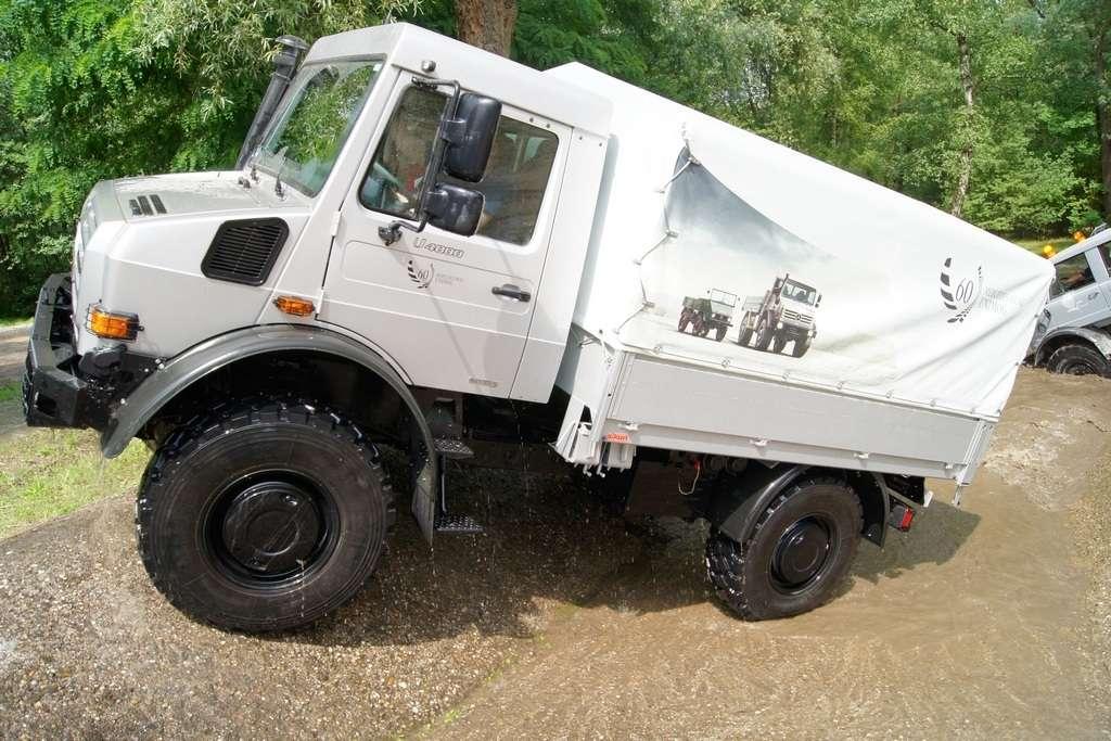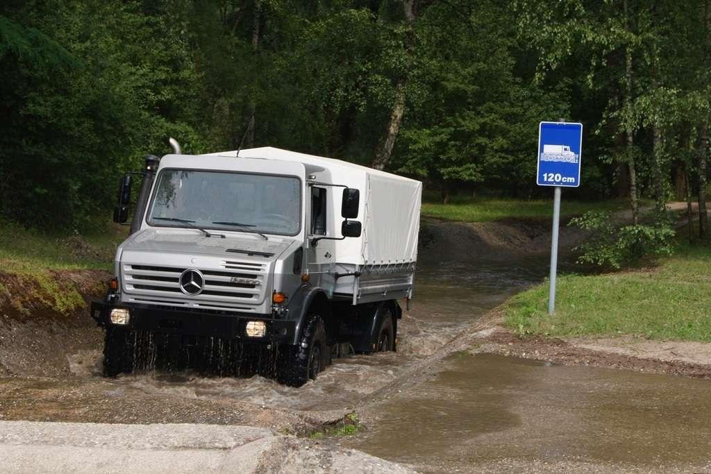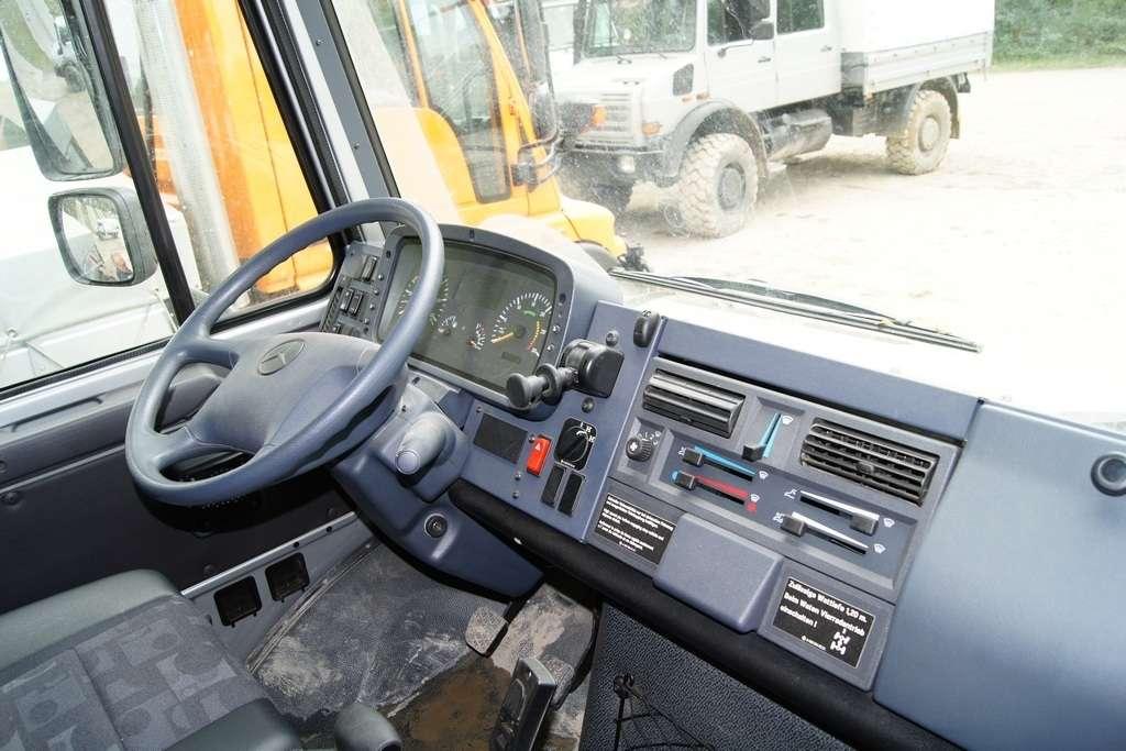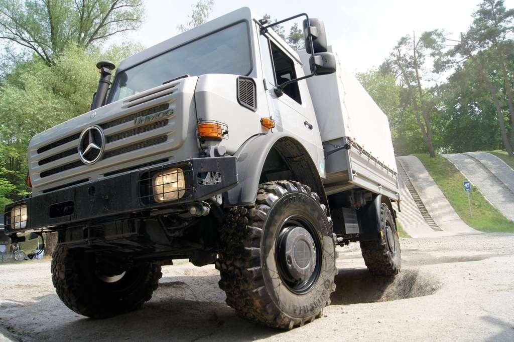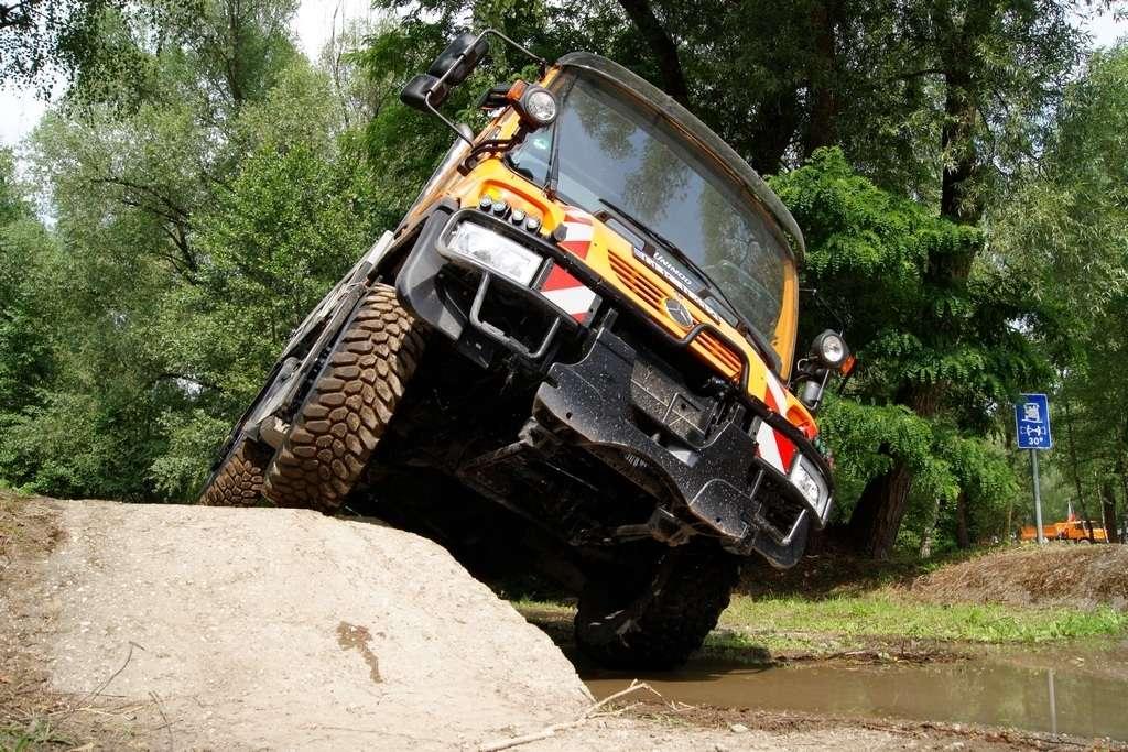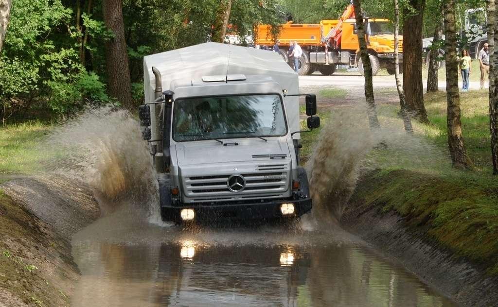 Tak jak poprzednio do modelu przypisany był opiekun i jak poprzednio spytałem czy mogę jechać tym modelem. Po sprawdzeniu kategorii prawa jazdy na wersje ciężarowe spytano mnie, czy kiedykolwiek jechałem Unimogiem i po mojej odpowiedzi, że nie, usłyszałem … to chyba będzie problem. Nie przejmując się tym wsiadłem do samochodu i … faktycznie był problem. Pierwsze co rzuciło mi się w oczy to brak klasycznej dźwigni zmiany biegów, ale mały walec, który idealnie pasował do położonej na nim dłoni. To właśnie nim wybieraliśmy przełożenie. Zważywszy zaś, że pojazd miał osiem biegów, a dodatkowo osiem „roboczych”, sam zrezygnowałem z jazdy wiedząc, że będzie lepiej dla mnie i dla samochodu, jak będę jechał obok kierowcy. Przesiedliśmy się i kierowca ruszył z miejsca tłumacząc mi wszystkie tajemnice modelu. Dźwignia faktycznie służy do wyboru przełożenia, a jeżeli chcemy włączyć „biegi robocze”, czyli załączyć reduktor, należy nacisnąć dodatkowy przycisk po lewej stronie kierownicy. Dodatkowe przyciski dotyczyły załączenia napędu na wszystkie osie i blokady obu osi, oraz pompowania kół (zmiana ciśnienia od 1,5 do 6 atmosfer zapewnia przyczepność w grząskim terenie i przejazd przez skaliste drogi). Po zablokowaniu mechanizmów różnicowych i włączeniu biegów terenowych na „szóstym biegu” (!!!) wyjechaliśmy pod wzniesienie o nachyleniu 80%. Jak wytłumaczono mi jedziemy samochodem nieobciążonym, więc nie ma sensu używać niższych biegów. Kolejnym etapem przejazdu był rów z wodą o głębokości 120 cm. Wjechaliśmy do niego z całym impetem (zalewając całkowicie przednią szybę), a dopiero dalej jechaliśmy spokojnie. Jednak nie dane mi było dojechać do końca fosy pełnej wody. W pewnym momencie kierowca stwierdził, że wyjedzie na bok i pod brzeg o nachyleniu na który nie odważyłbym się ustawiać samochodu, bez najmniejszych problemów wyjechał. Potem jeszcze był przejazd pod prawie pionowe wniesienie o wysokości ok. 250 cm (nachylenie 110 % i kąt natarcia 38 stopni), przejazd przy nachyleniu bocznym 38 stopni oraz po wgłębieniach na drodze, co miało sugerować wykrzyżowanie osi.