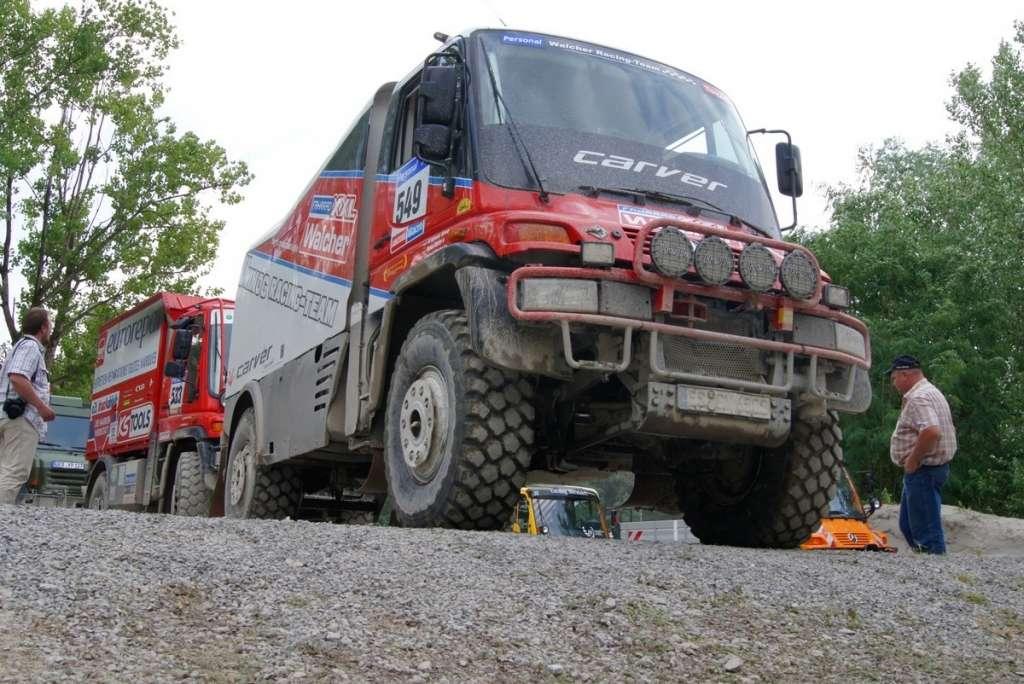 Tym razem podszedłem do przystosowanego do rajdów terenowych czerwonego Unimoga 400. Tam już nie prosząc nawet o samodzielną jazdę siadłem na fotelu obok kierowcy (rajdowe kubełki), zapiąłem pasy (rajdowe szelki z centralnym łącznikiem) i rozpoczęliśmy przejazd. Kierowca -który był właścicielem pojazdu- pokazał mi jak można w terenowym Unimogu, „zarzucać tyłem”, przejeżdżać na poślizgu wszystkich kół przez piach, a także kiedy należy kręcić kierownicą, aby przy pełnej prędkości nie urwać zawieszenia wjeżdżając w obniżenie terenu głębsze niż wysokość osi.