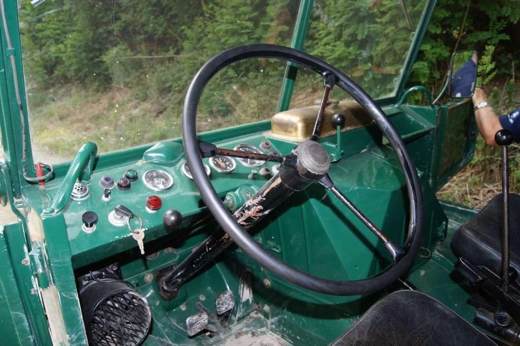 Teraz wystarczyło tylko przekręcić kluczyk (wyglądający jak w starych motorach) i pociągnąć za dodatkową dźwignię, a silnik żwawo zaterkotał. Jadący ze mną opiekun samochodu powiedział, że on będzie zmieniał biegi, kazał mi włączyć sprzęgło i .. ruszyłem. Trochę mnie to zmartwiło, że nie mogę samodzielnie ruszać dźwignią zmiany biegów, ale spróbowałem i okazało się, że wybór przełożenia to duża loteria, a jadący obok mnie człowiek robi to sprawnie i szybko, a dodatkowo siedząc w nienaturalnej pozycji z kolanami pod brodą, koncentrowałem się na kole kierownicy. Tak więc bez żadnego marudzenia ruszyłem i … horror. Cieniutki wolant kierownicy, oraz brak wspomagania wymagały sporej siły. Przy niewielkiej prędkości przejazd przez piasek był naprawdę wyzwaniem godnym Schwarzenegera. Trasa wiodła zaś po piaszczystej drodze przez las, gdzie były liczne górki, spadki i zakręty. Mały Unimog dawał sobie jednak wszędzie radę. Dopiero gdy dojechałem do wyższej górki na piaszczystej trasie, poczułem delikatny uślizg kół, siedzący obok mnie pan pociągnął dodatkową dźwignię i … samochód przejechał do góry, nie napotykając na żadne problemy. Okazało się, że cały czas jechałem ze standardowo włączonym napędem na oś tylną, a dźwignia którą pociągnięto, była dołączeniem osi przedniej. Po dojeździe do miejsca postoju tego modelu, zaparkowałem (a przy minimalnej prędkości, braku wspomagania i cieniutkiej kierownicy ślizgającej w dłoniach to duży wyczyn) i szybko udałem się do największego na placu Unimoga U4000. Stwierdziłem, że jak testować to z ułańską fantazją i stąd wybór mającego 5,5 metra długości kolosa o wadze 7,5 tony.