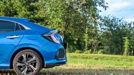 Strona wizualna to właśnie ten aspekt, który wciąż napędza dyskusję nad najnowszą odmianą japońskiego kompaktu. Biorąc pod uwagę dwie poprzednie generacje, obecny Civic zdaje się odcinać stylistycznie od protoplastów. Nadwozie hatchback charakteryzuje tyle odważny, co kontrowersyjny kształt pokrywy bagażnika i tylnego zderzaka. I faktycznie, sporo się tam dzieje. Poczynając analizę od dołu, nie sposób pominąć masywnej konstrukcji o ostrych kantach, okalającej centralnie umieszczoną podwójną końcówkę wydechu. Do tego dwie czarne maskownice, delikatny spoiler przecinający linię szyby i drugi płynnie przechodzący z linii dachu. Na koniec reflektory z czarną otoczką i stosunkowo niewielka szyba. Całość sprawia wrażenie zwartej, napiętej konstrukcji i bez wątpienia najmocniej oddaje sportowy charakter auta.